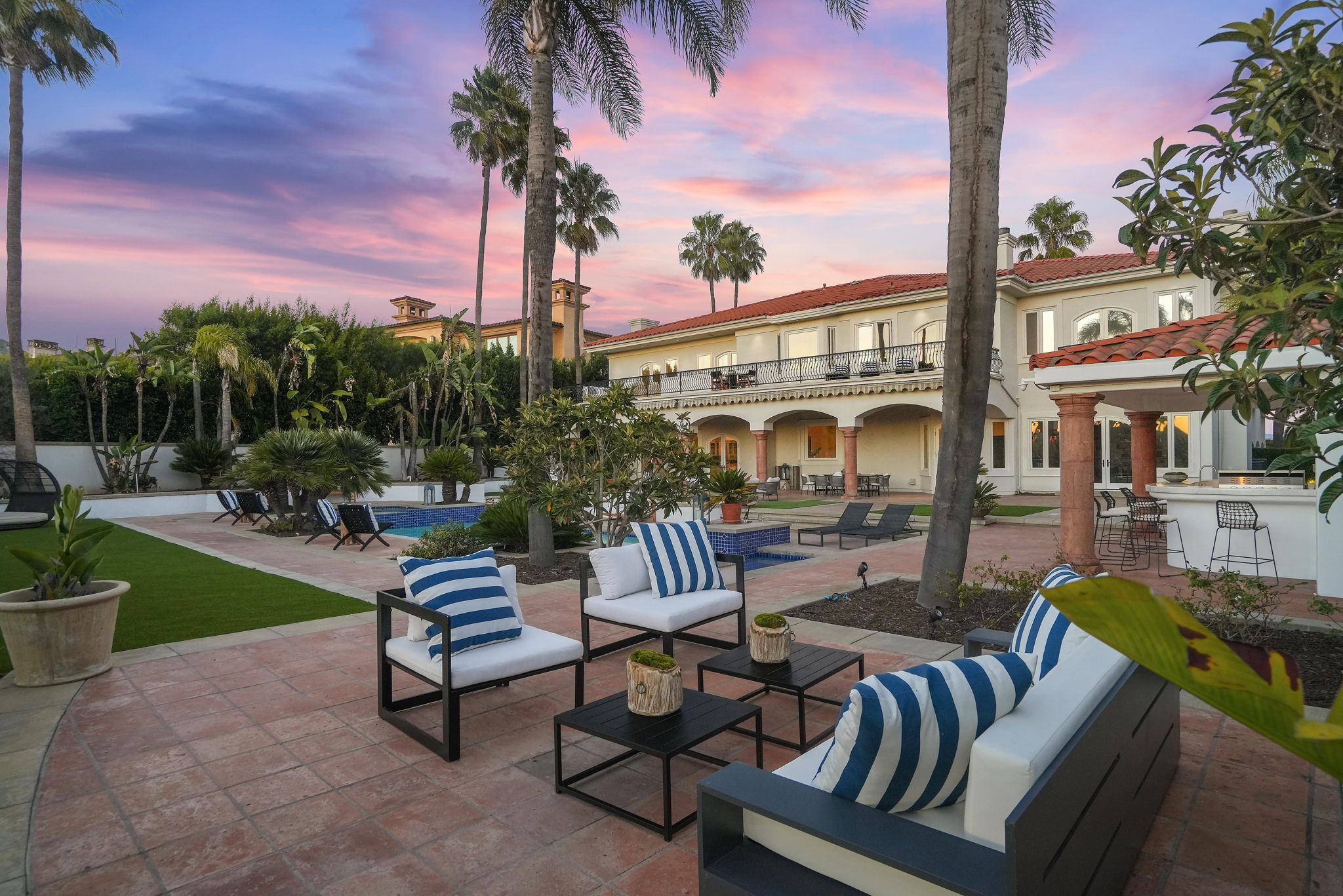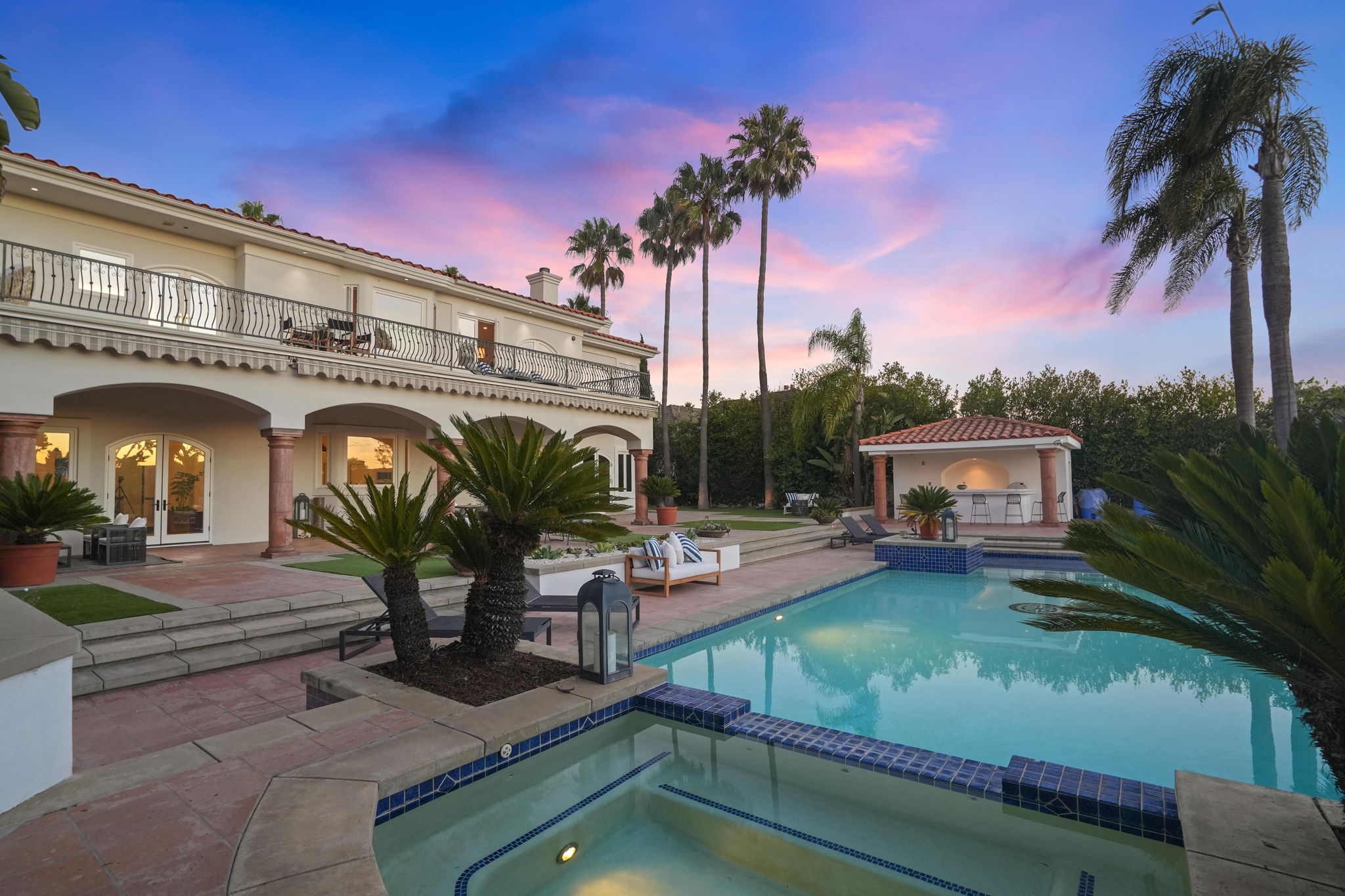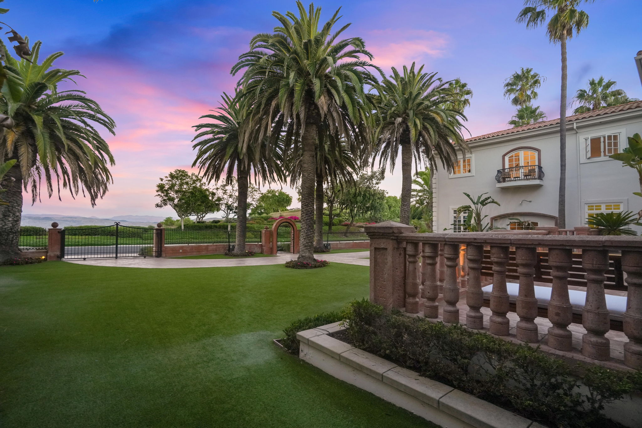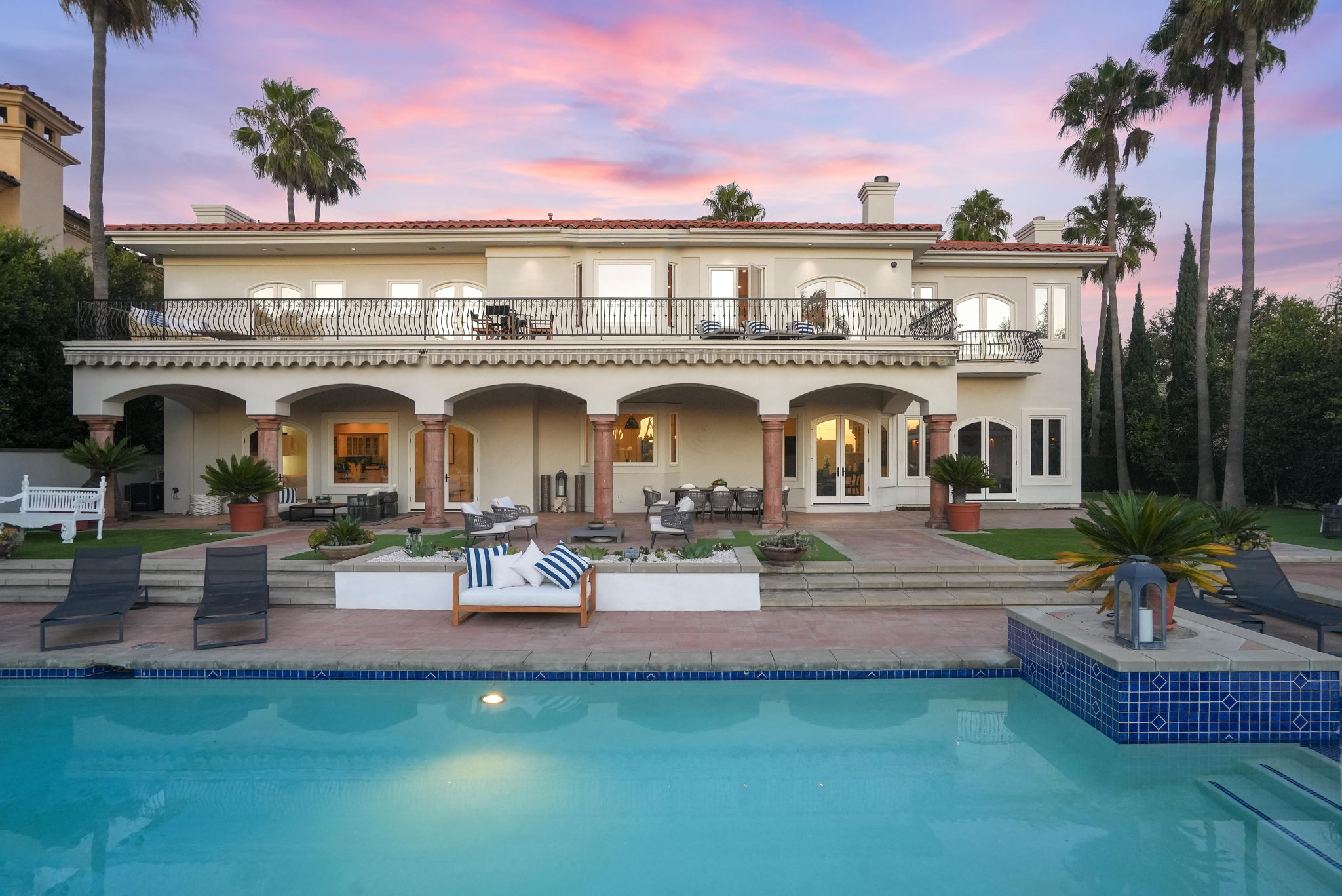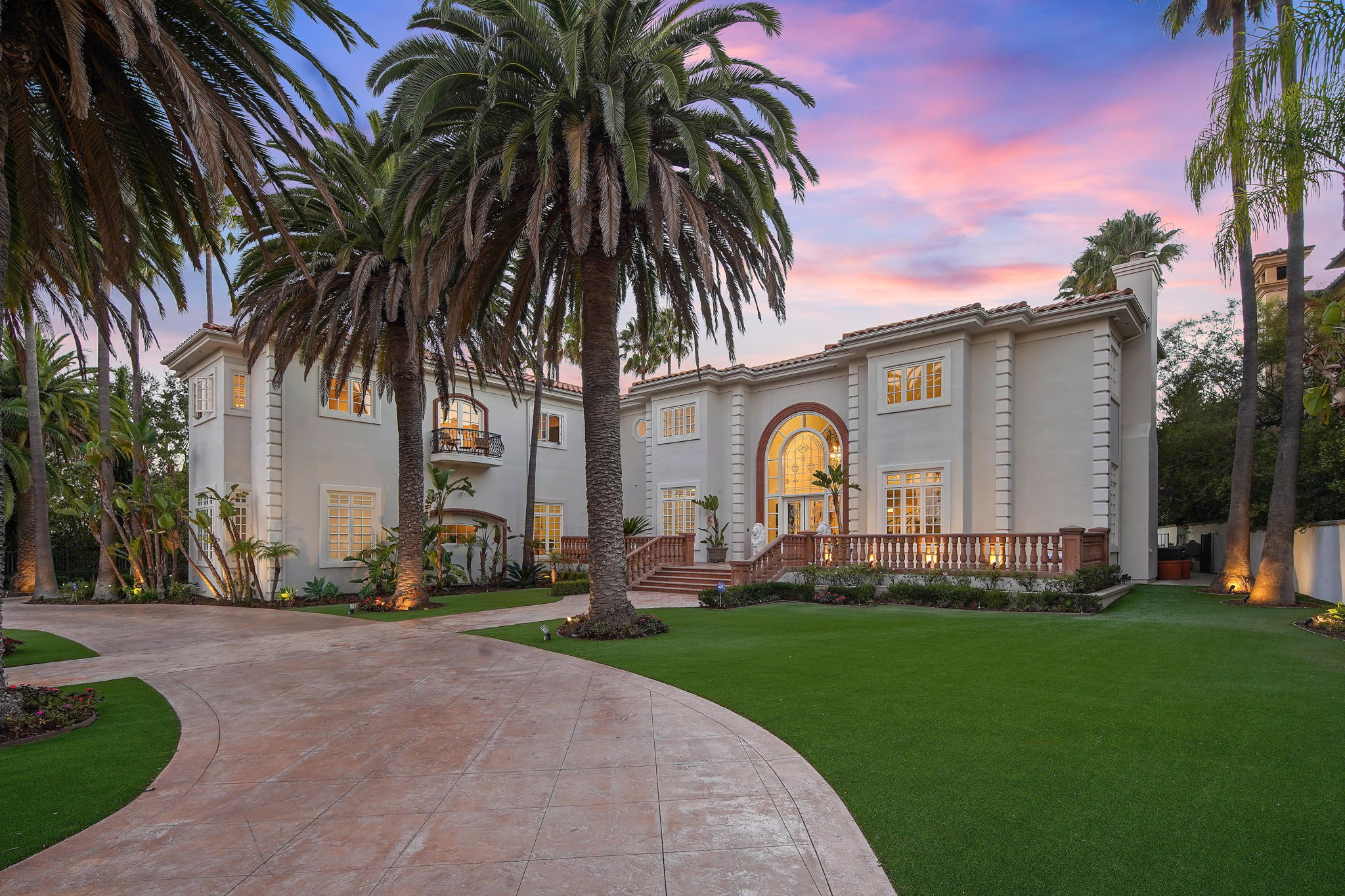 Set behind private gates on an almost three-quarters acre lot, this 9,600 Sq. Ft. home boasts unparallel amenities and scale, along with city and ocean views. The massive gated front yard is manicured to perfection and leads you to the grand foyer and sitting area with double-height ceilings and an abundance of natural light. The elegant dining room features paneled walls in black and white. The newly remodeled gourmet kitchen offers 4 new Fisher/Paykel dishwashers, 4 ovens, Gaggenau stove with 6 burners and 2 grills, large center island, and Du Chateau wood flooring – all leading to the large family room with an entertainment/bar area. The sun-lit paneled library/office enjoys views of the yard and built-in bookshelves. Upstairs, the spacious owner’s suite enjoys views of the ocean and Catalina Island, fireplace, automatic blackout shades, private balcony, and a walk-in closet, as well as a stunning newly remodeled master bathroom with hot tub and huge spa-like shower. All other guest bedrooms are en-suite and have been remodeled. Other rooms include a large dance/studio, bonus/game room, gym room, sauna, massage room, and wine cellar. The expansive private grounds include a massive saltwater pool and jacuzzi adorned with exquisite blue mosaic tile. A huge outdoor covered patio with automatic shades and a remodeled pool bathroom complete this private oasis, surrounded by no less than 37 palm trees. This “smart” home comes replete with extensive camera and security systems, heating, A/C, lighting, and TVs that can be controlled from anywhere in the world. This idyllic estate is located within the gated community of Bear Brand Ranch with 24-hour security. Close proximity to shops, gourmet restaurants, and renowned schools, and only minutes away from the ocean and harbor.