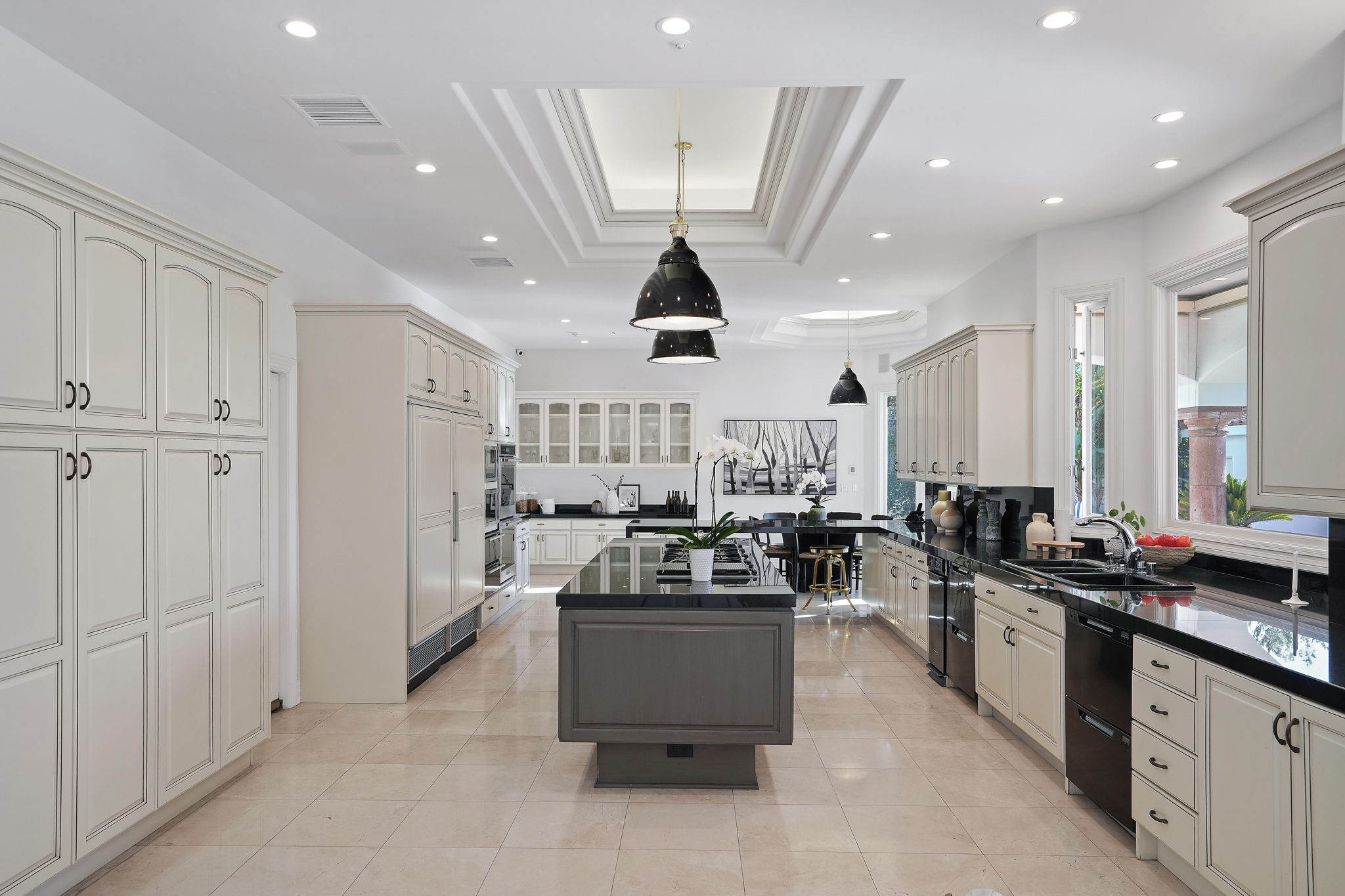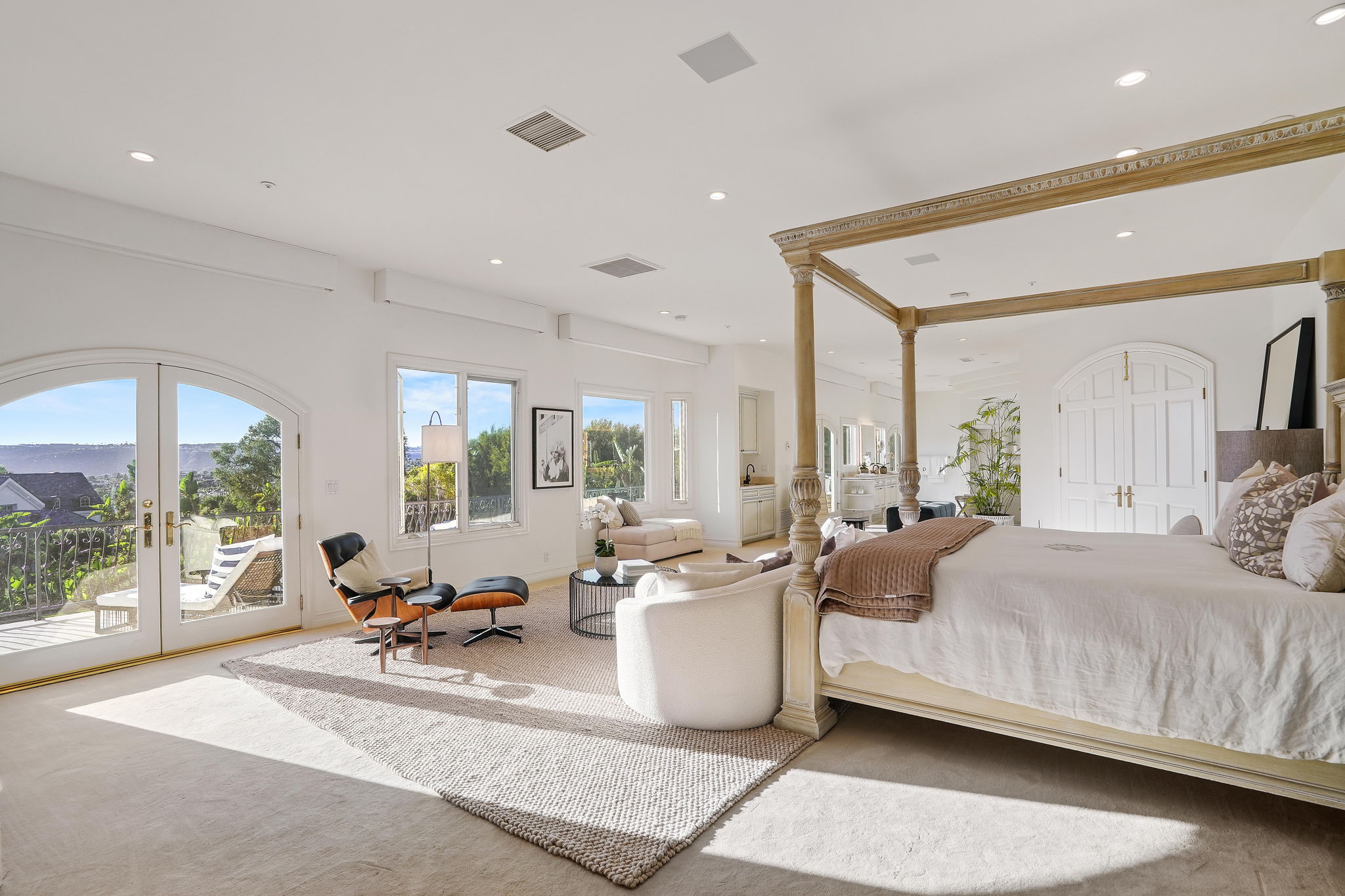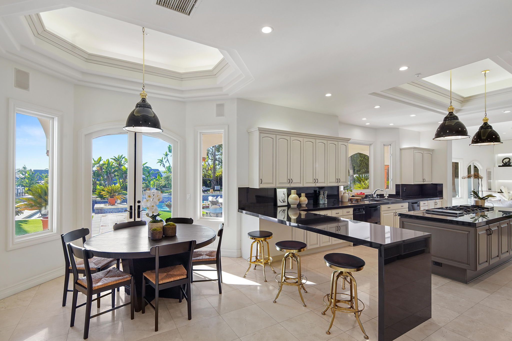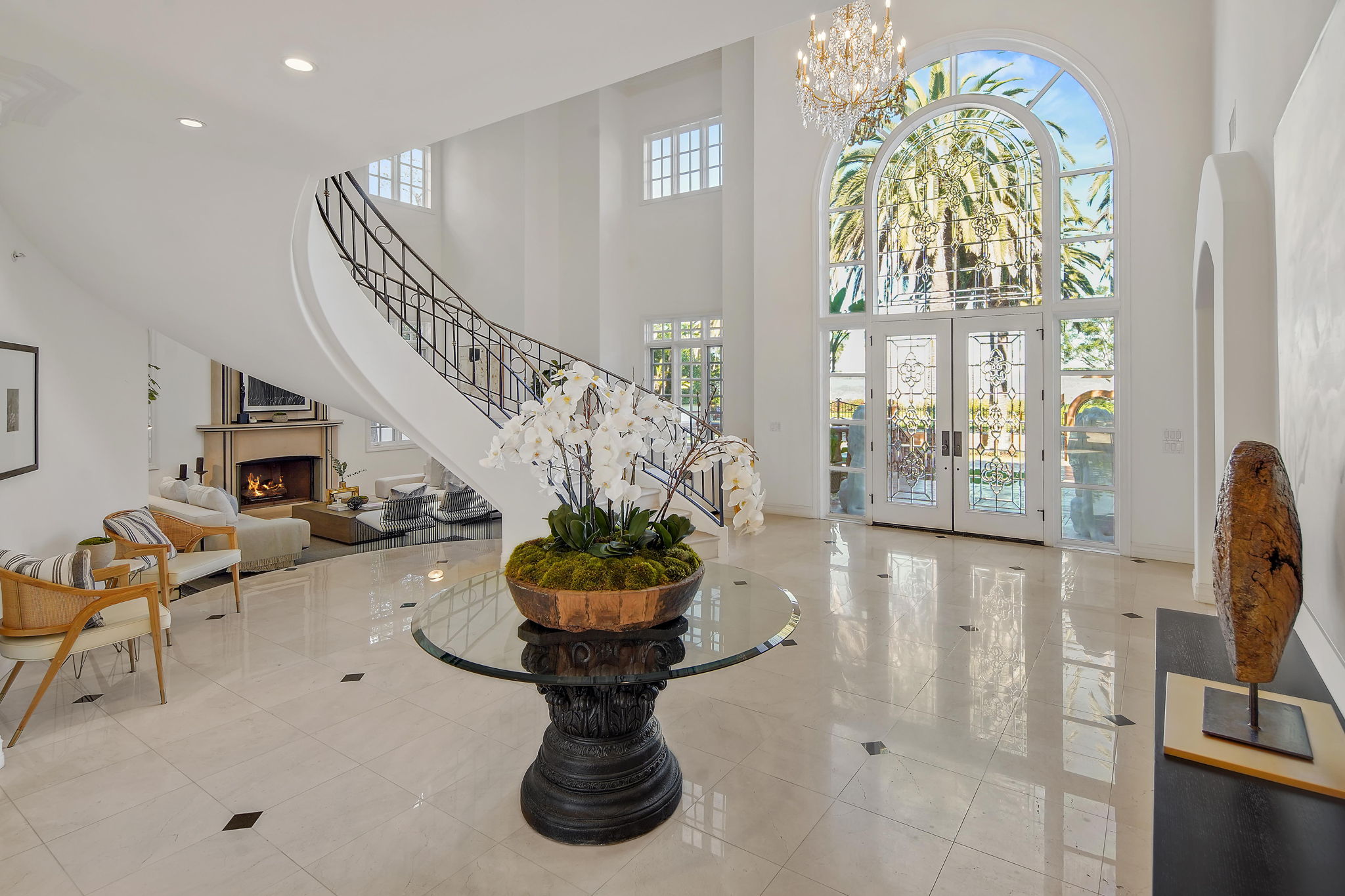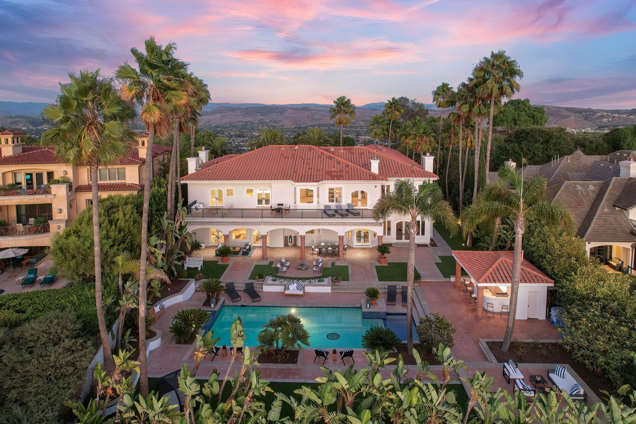 Set behind private gates on an almost three-quarters acre lot, this 9,600 Sq. Ft. home boasts unparallel amenities and scale, along with city and ocean views. The massive gated front yard is manicured to perfection and leads you to the grand foyer and sitting area with double-height ceilings and an abundance of natural light. The elegant dining room features paneled walls in black and white. The newly remodeled gourmet kitchen offers 4 new Fisher/Paykel dishwashers, 4 ovens, Gaggenau stove with 6 burners and 2 grills, large center island, and Du Chateau wood flooring – all leading to the large family room with an entertainment/bar area. The sun-lit paneled library/office enjoys views of the yard and built-in bookshelves. Upstairs, the spacious owner’s suite enjoys views of the ocean and Catalina Island, fireplace, automatic blackout shades, private balcony, and a walk-in closet, as well as a stunning newly remodeled master bathroom with hot tub and huge spa-like shower. All other guest bedrooms are en-suite and have been remodeled. Other rooms include a large dance/studio, bonus/game room, gym room, sauna, massage room, and wine cellar. The expansive private grounds include a massive saltwater pool and jacuzzi adorned with exquisite blue mosaic tile. A huge outdoor covered patio with automatic shades and a remodeled pool bathroom complete this private oasis, surrounded by no less than 37 palm trees. This “smart” home comes replete with extensive camera and security systems, heating, A/C, lighting, and TVs that can be controlled from anywhere in the world. This idyllic estate is located within the gated community of Bear Brand Ranch with 24-hour security. Close proximity to shops, gourmet restaurants, and renowned schools, and only minutes away from the ocean and harbor.
