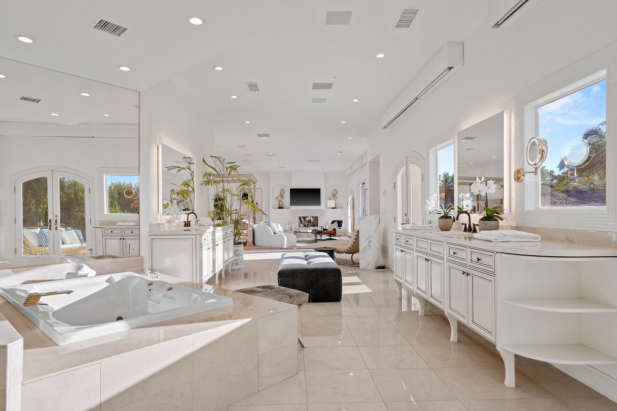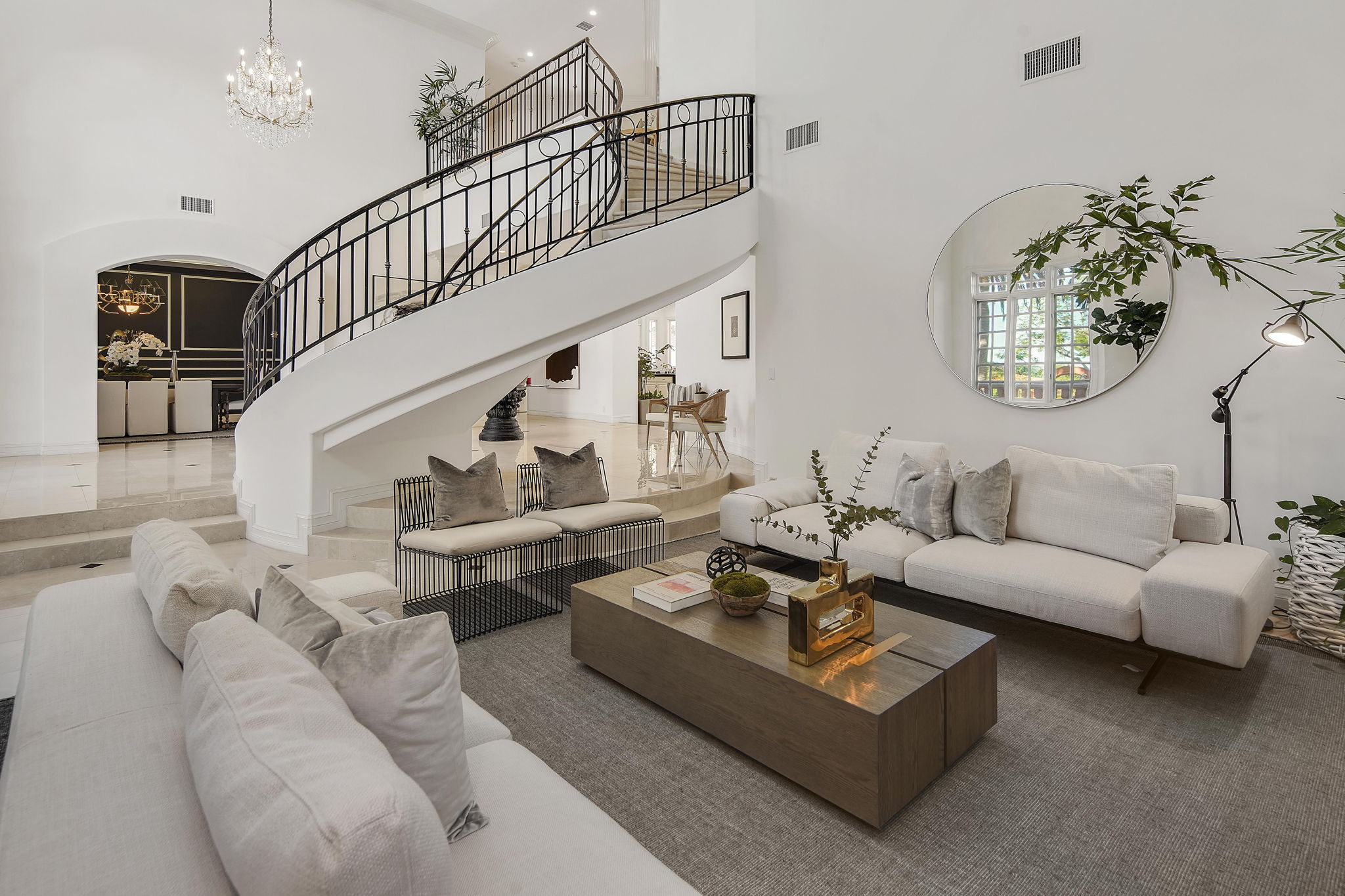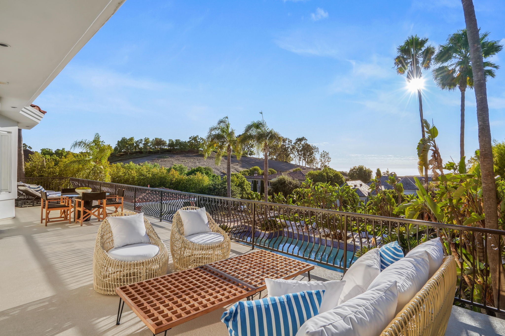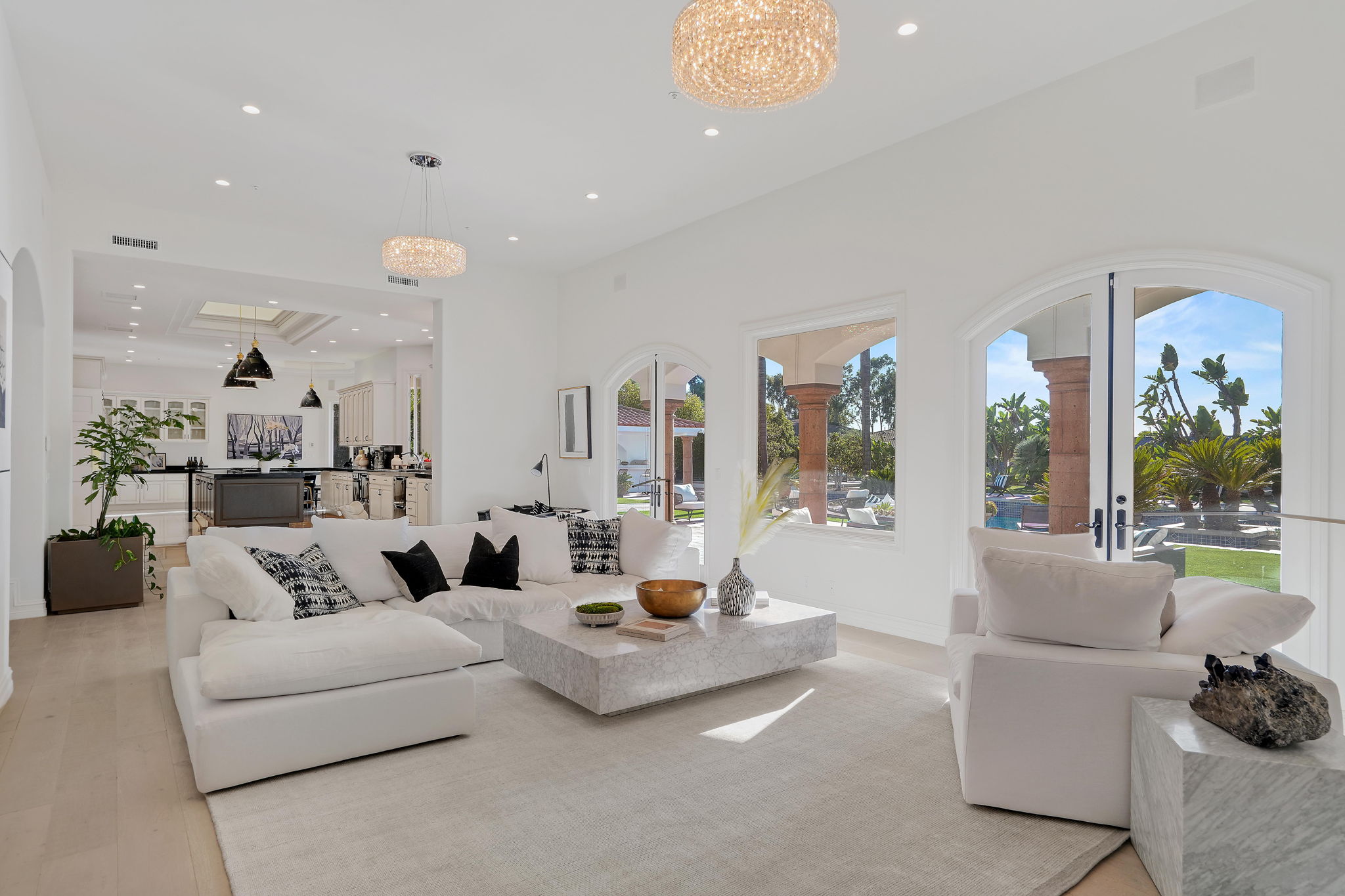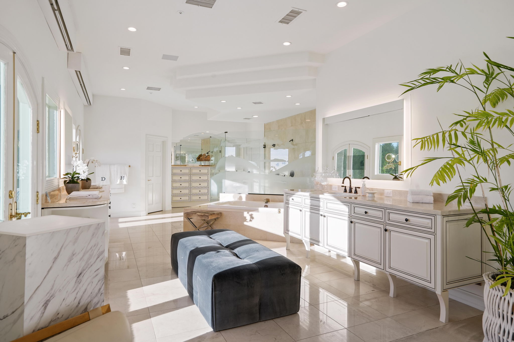 Set behind private gates on an almost three-quarters acre lot, this 9,600 Sq. Ft. home boasts unparallel amenities and scale, along with city and ocean views. The massive gated front yard is manicured to perfection and leads you to the grand foyer and sitting area with double-height ceilings and an abundance of natural light. The elegant dining room features paneled walls in black and white. The newly remodeled gourmet kitchen offers 4 new Fisher/Paykel dishwashers, 4 ovens, Gaggenau stove with 6 burners and 2 grills, large center island, and Du Chateau wood flooring – all leading to the large family room with an entertainment/bar area. The sun-lit paneled library/office enjoys views of the yard and built-in bookshelves. Upstairs, the spacious owner’s suite enjoys views of the ocean and Catalina Island, fireplace, automatic blackout shades, private balcony, and a walk-in closet, as well as a stunning newly remodeled master bathroom with hot tub and huge spa-like shower. All other guest bedrooms are en-suite and have been remodeled. Other rooms include a large dance/studio, bonus/game room, gym room, sauna, massage room, and wine cellar. The expansive private grounds include a massive saltwater pool and jacuzzi adorned with exquisite blue mosaic tile. A huge outdoor covered patio with automatic shades and a remodeled pool bathroom complete this private oasis, surrounded by no less than 37 palm trees. This “smart” home comes replete with extensive camera and security systems, heating, A/C, lighting, and TVs that can be controlled from anywhere in the world. This idyllic estate is located within the gated community of Bear Brand Ranch with 24-hour security. Close proximity to shops, gourmet restaurants, and renowned schools, and only minutes away from the ocean and harbor.