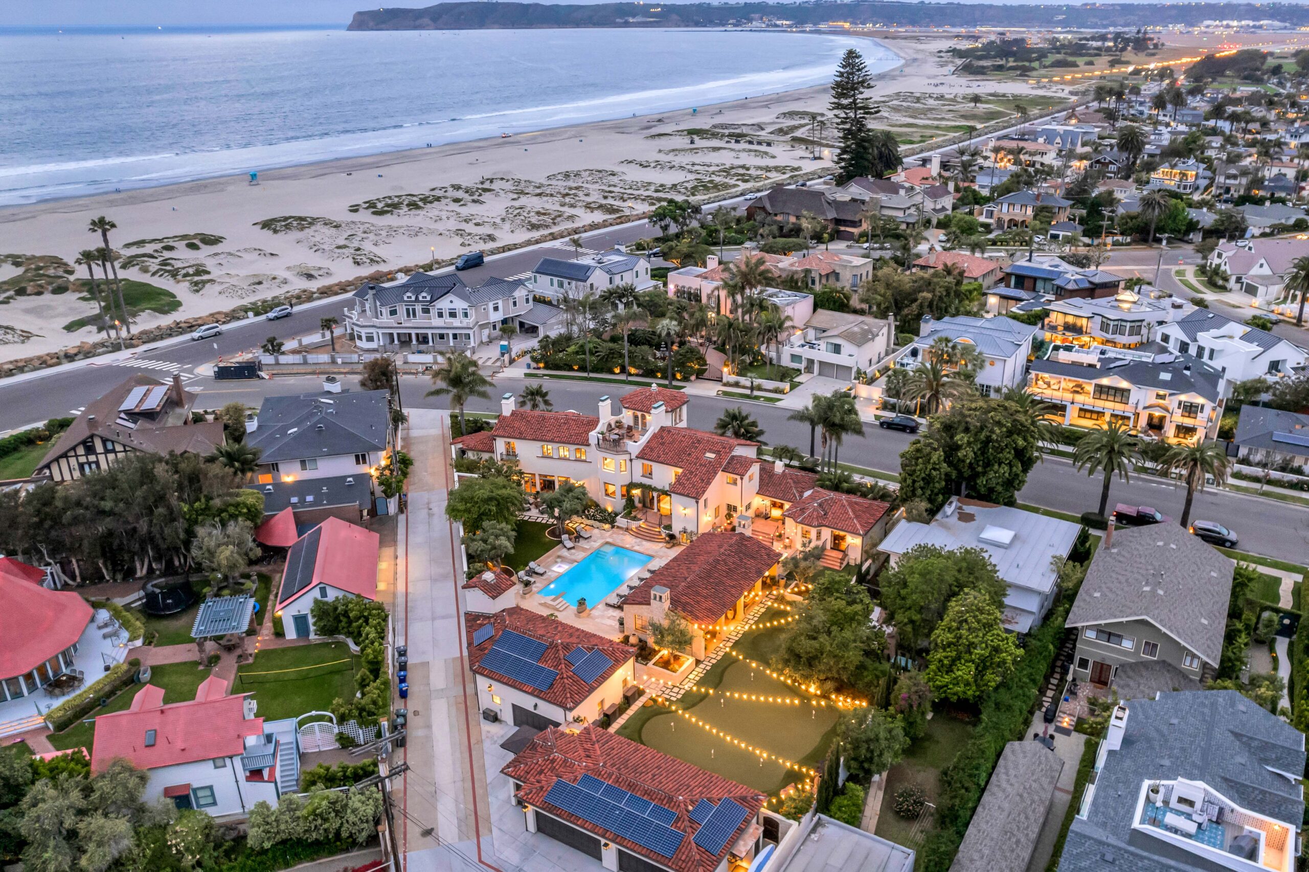 This stunning Spanish estate sits on a palm-lined promenade just 100 feet from the beach, on one of the largest lots in Coronado. The historical landmark encompasses a 14,142 square-foot main house, sprawling guest house, and private garden sanctuary with tranquil fountains and estancia. Originally built for business magnate W.A. Gunn, the four-bedroom (option for five), eight-bathroom abode features vintage Hollywood glamour adorned with state-of-the-art amenities for optimal luxury living space, replete with castle-like characteristics. Conceived by the illustrious Richard Requa in 1925, the previous owner preserved priceless historical heritage. Dominated by an impressive turret that acts as an entrance hall, the home's exotic allure is undeniable, revealing a stunning foyer with a spiral staircase and striking, hand-hewn beams. Echoing the kind of extravagance that underscored the 1920s, "Coronado Castle" perfectly captures the era's zeitgeist, rife with opulent tile flooring, ornate ironwork, and stained-glass touches. An immaculately hand-painted coffered ceiling dominates the formal dining room, punctuating the voluminous expanse that bleeds outward to the pool deck via a trio of custom steel glass doors. Grounded in reclaimed 18th-century European terracotta tile, Spanish embellishments abound. A capacious kitchen is poised for entertaining, appointed with an 80-inch La Cornue range and rotisserie, double Subzero fridge, Miele steam oven, and coffee station, plus a wet bar. Illuminated by custom light fixtures, the kitchen is anchored by an immense marble island. Preserving period details while meticulously updating the home to modern-day standards, historically accurate embellishments have been implemented throughout. Reimagined with an opulent mix of rare finishes and Moorish tiling sourced from around the world, new renovations masterfully mirror Requa's original concept and inspirations. Evoking a 5-star feel with a firepit lounge, wet bar, and dining area, the turret's third-floor roof deck affords panoramic ocean views. The lavish basement is just as impressive. Designed with a grand staircase and soaring ceilings, the voluminous expanse boasts a golf simulator, media room with bar, trophy room, 25-seat movie theater with projector, 1,300+ SqFt world-class gym, and full spa with dry sauna, massage table, and ice bath. Inducing an air of timeless luxury, a stunning pool deck sets the stage for summertime soirees, complete with 250-year-old stonework, Moorish ironwork, a full outdoor kitchen, and dining estancia. The lush oasis includes 100-year-old rustic olive trees, three fountains, a putting green, a secret garden, and a dog run. Perfect for out-of-town guests, a detached guest house is equally sumptuous, appointed with a full bathroom and kitchen. Celebrating the spirit of Requa's original design while fully embracing modern-day convenience, this historic home is a part of the Mills Act, which allows for reduced property taxes. Thoughtfully updated with a four-car garage with golf cart parking, the estate includes an additional five coveted off-street parking spots a rarity in beach enclaves. A legacy estate that offers unmatched attention to detail, this is your chance to own one of the most sought-after exclusive properties in Southern California.