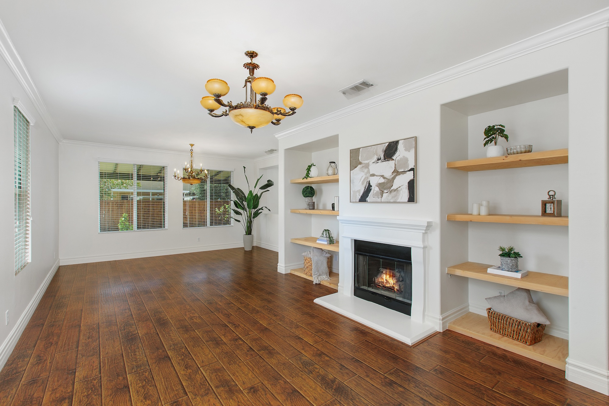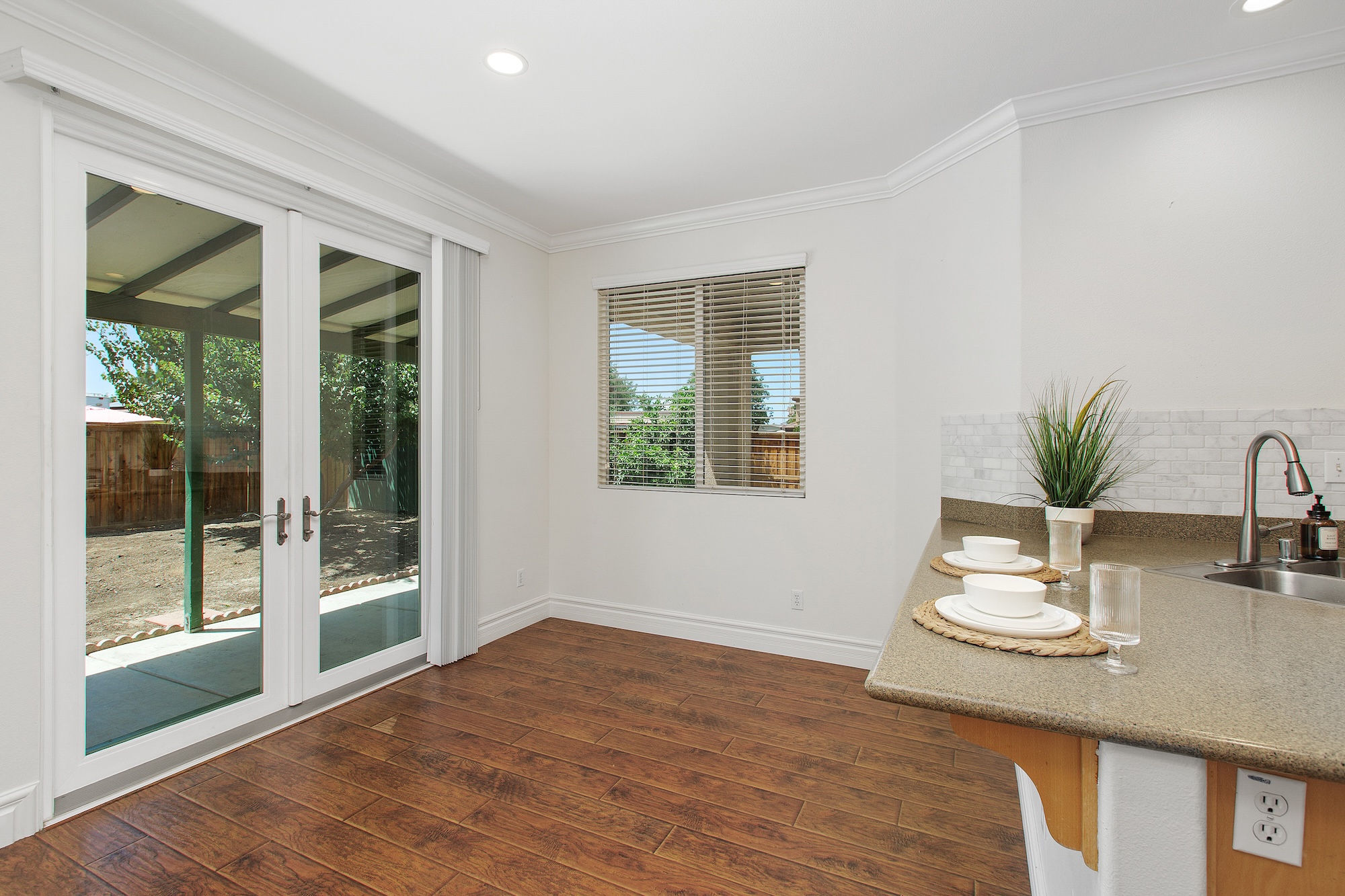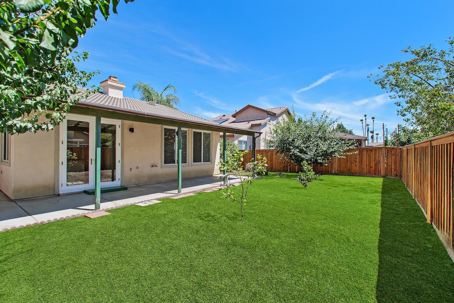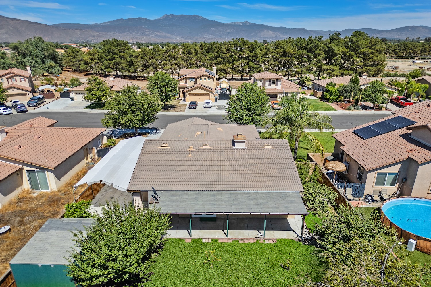 Welcome home to this beautiful single-story residence featuring 3 bedrooms and 2 full bathrooms, located on a spacious lot in the Cheyenne Community of San Jacinto. The home offers great curb appeal with new modern garage doors with glass panels, updated light fixtures and newly paved driveway that provides plenty of parking. There’s also gated and covered RV parking plus a detached 126 sq. ft. bonus workshop. Inside, you will find a bright and open floor plan filled with natural light. The living room features stylish wood-look flooring and a sleek gas fireplace framed by custom-built wood shelving. Crown molding, 6.5-inch baseboards and fresh paint add a polished touch throughout. The kitchen is both functional and elegant with plenty of cabinet space, granite backsplash and tile flooring. Custom French doors open to a private backyard retreat. The primary suite offers comfort and convenience with a ceiling fan, large walk-in closet and an ensuite bathroom with dual vanities. A sliding door leads directly from the suite to the backyard. Step outside to enjoy multiple covered seating areas and a variety of mature fruit trees, including plum, fig, pomegranate, orange and lemon. Additional features include a brand new water heater and a full-size laundry room with storage space and washer/dryer hookups all with the added benefit of no HOA.null