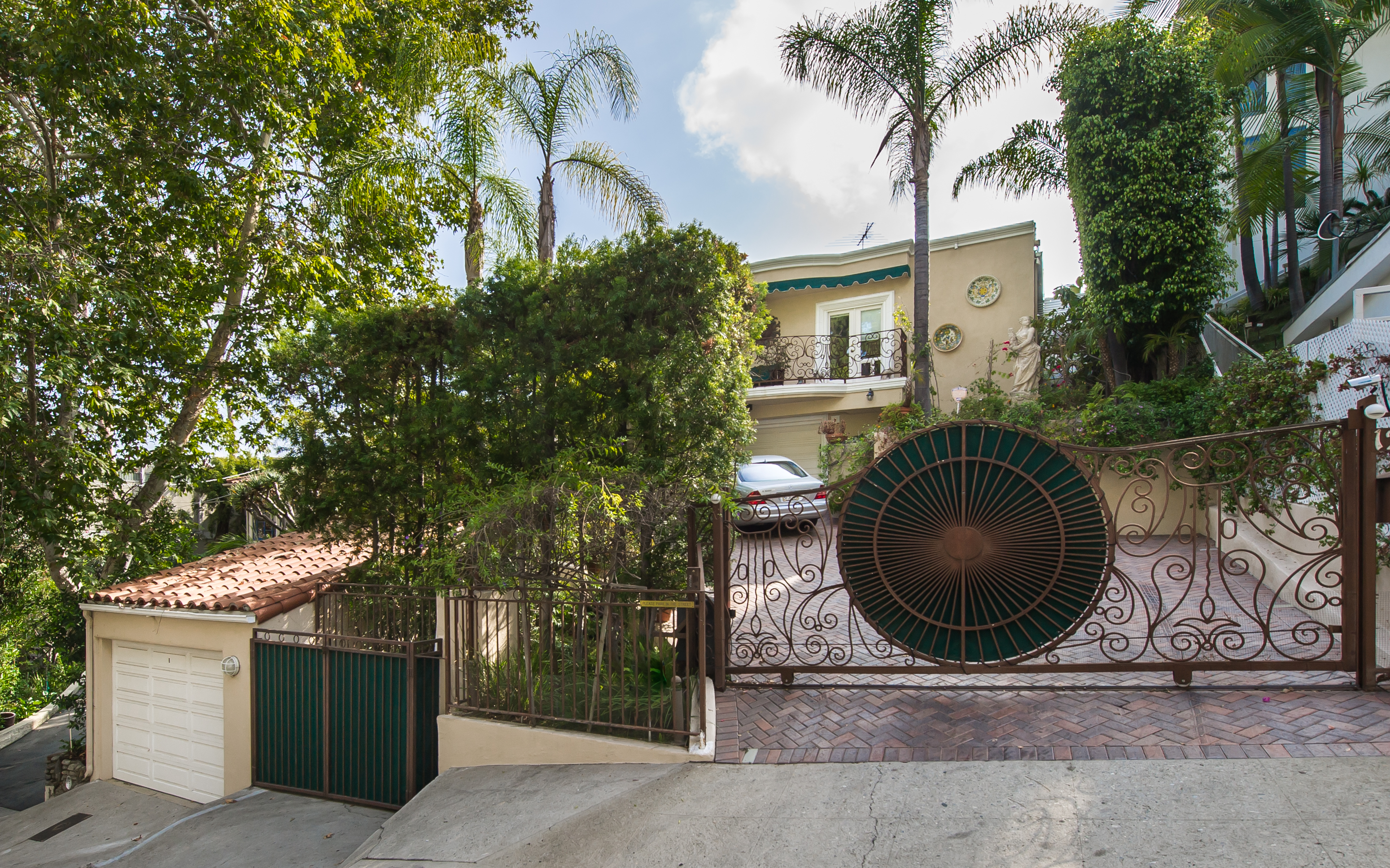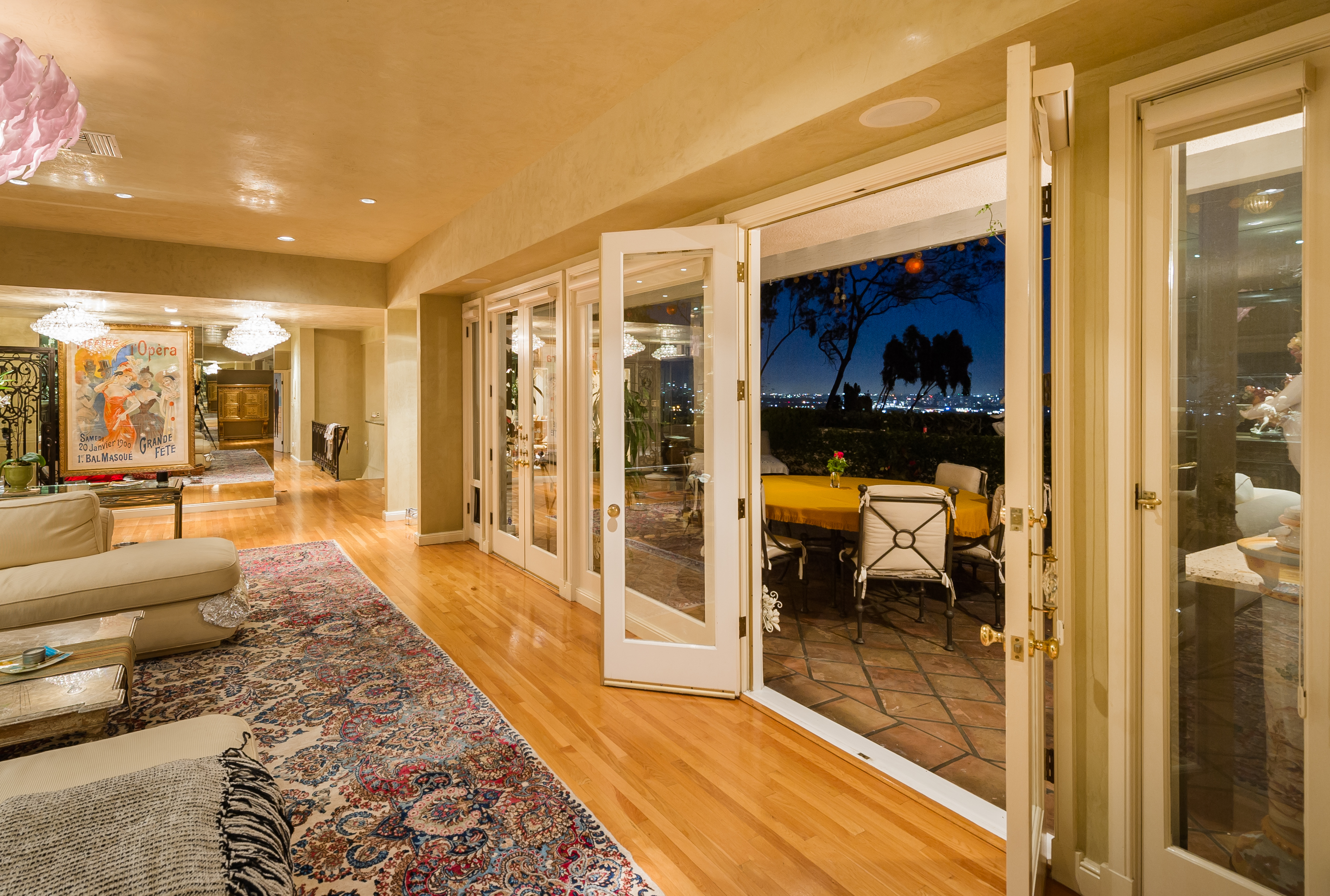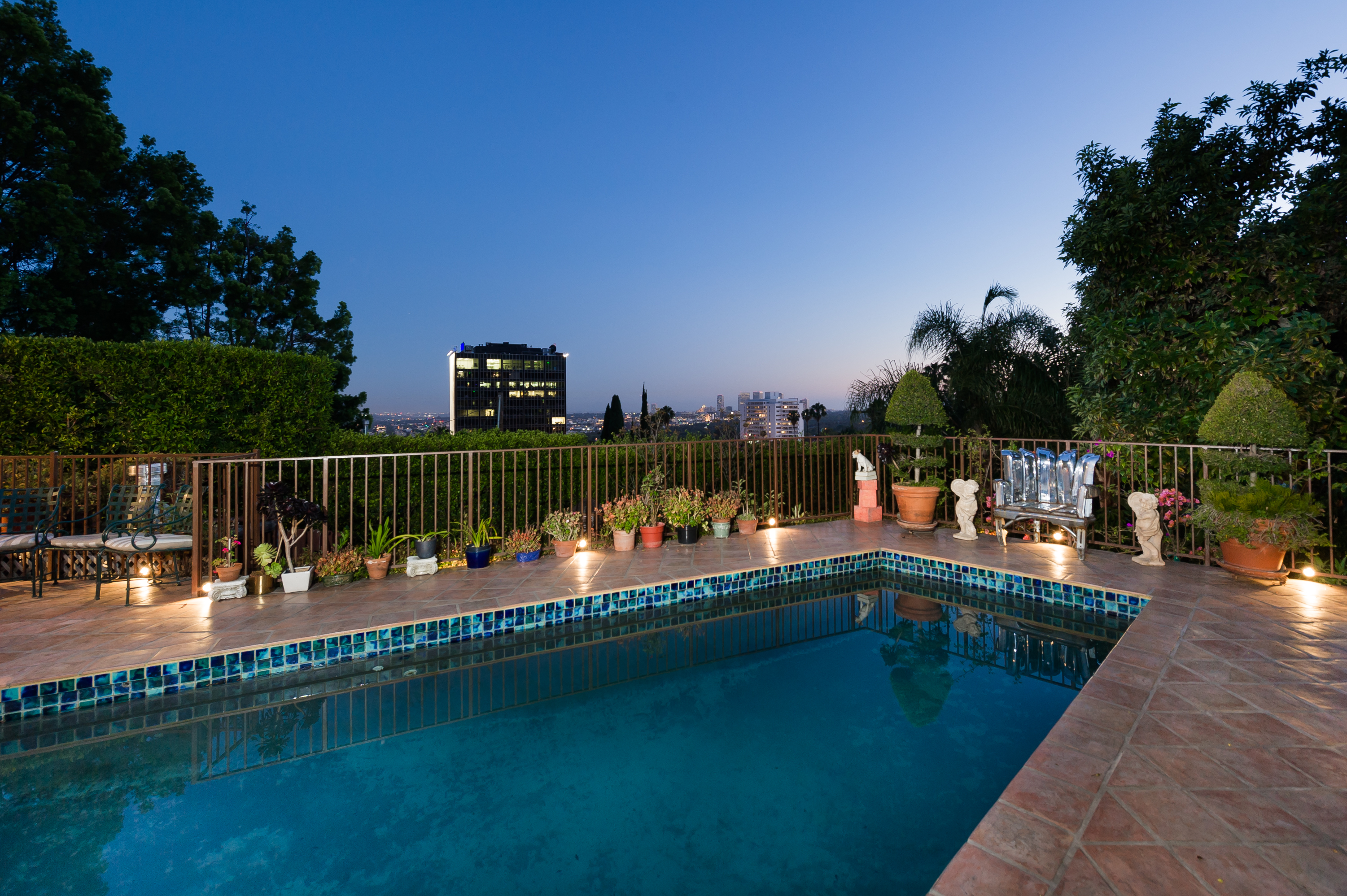 A stunning privately gated villa on a tremendous street-to-street lot in the famed "Sunset Strip". The 4,200+ sq. ft. home boasts 5 bedrooms and 4 baths, soaring ceilings, an expansive living room with fireplace and floor-to-ceiling French doors that open up to a romantic 800 sq. ft. terrace overlooking the city lights and ocean. Large master retreat with sitting area and 180 degree views from DTLA to the Pacific Ocean, fireplace, large bathroom with steam shower and huge walk-in closet. Private, saltwater pool and large grassy area.