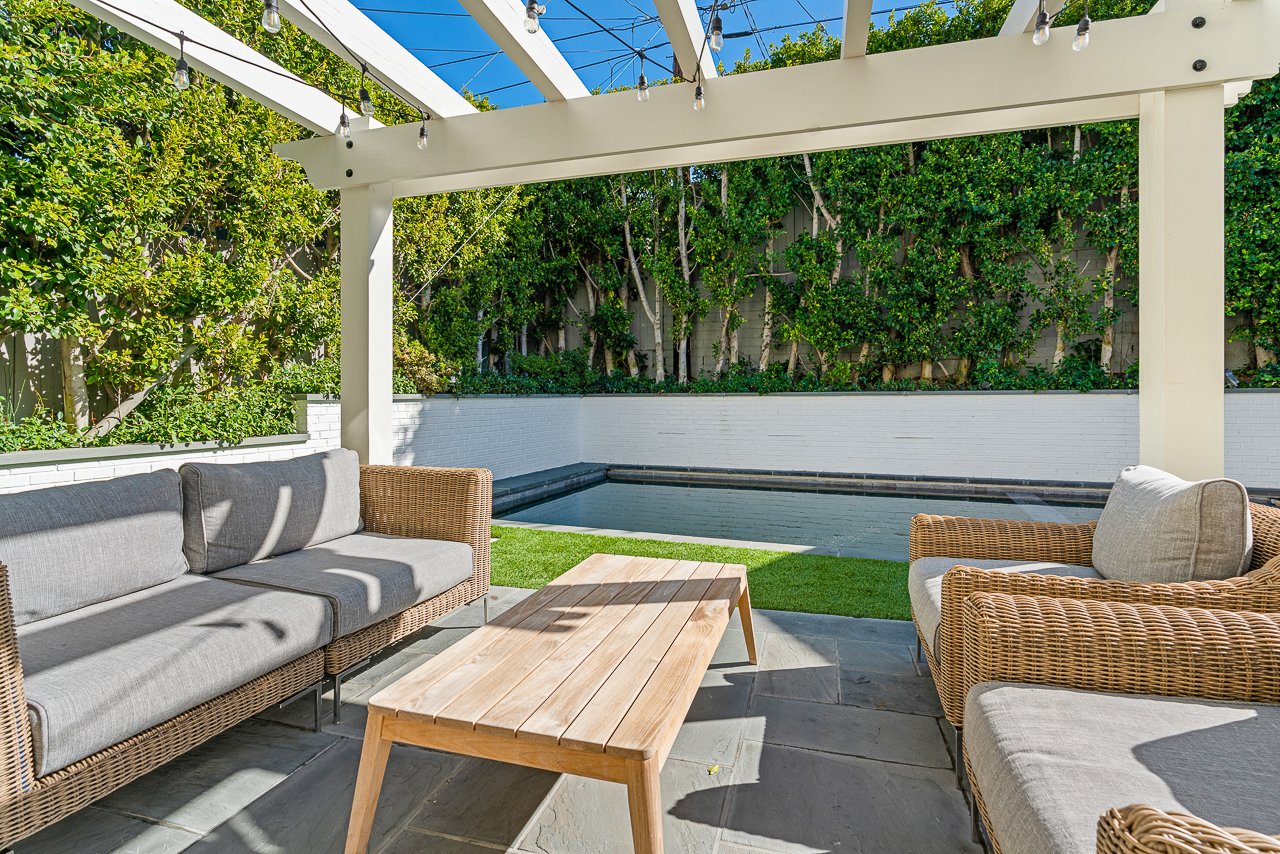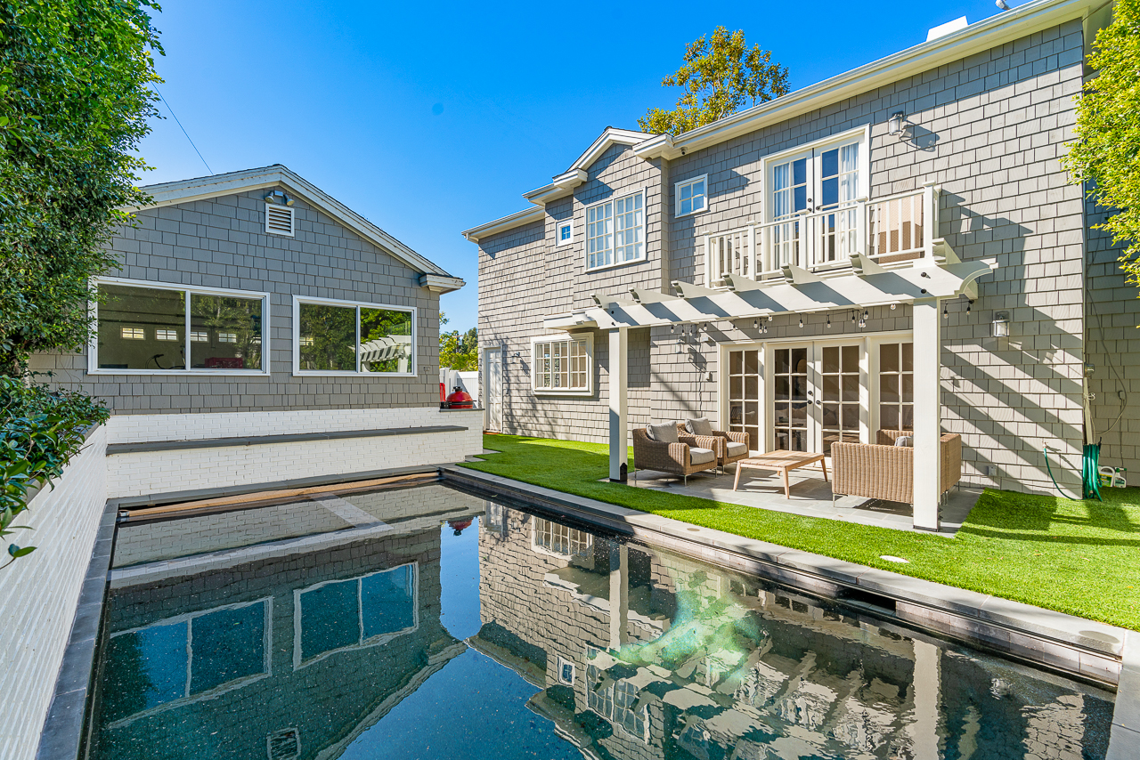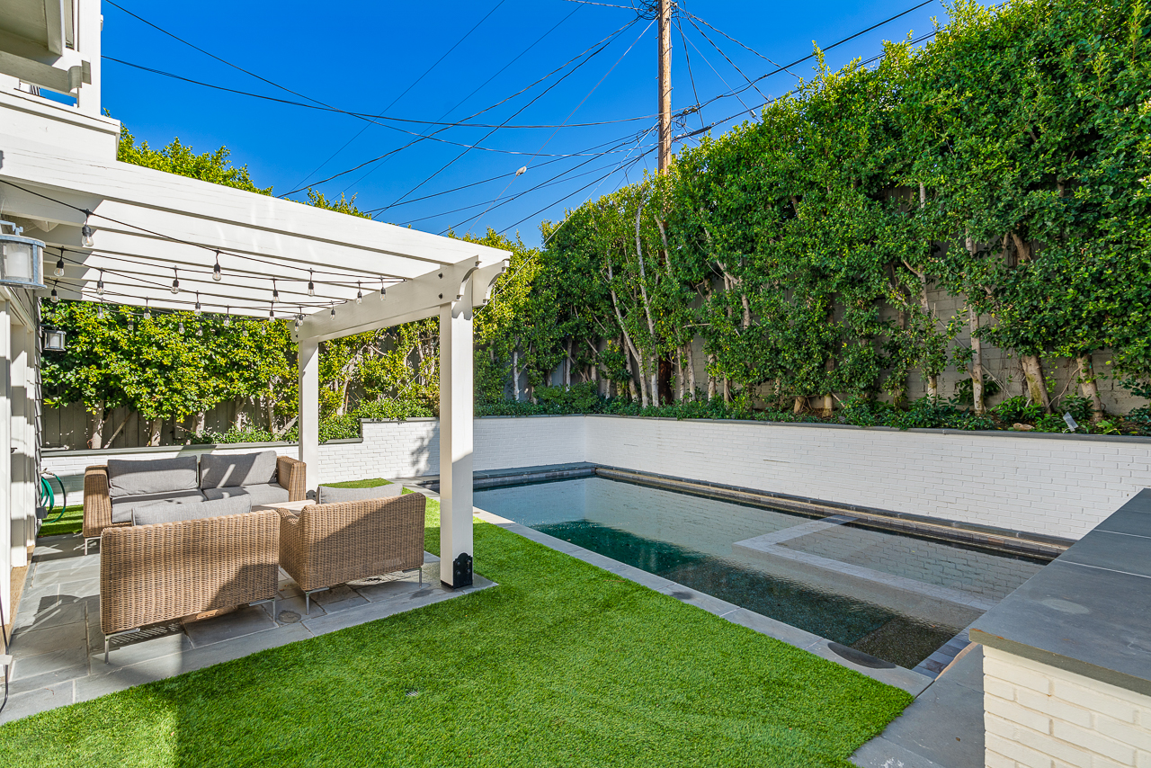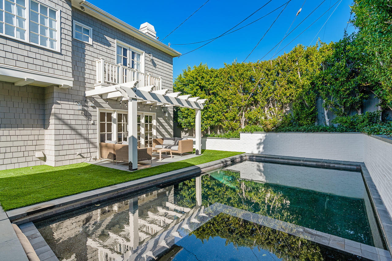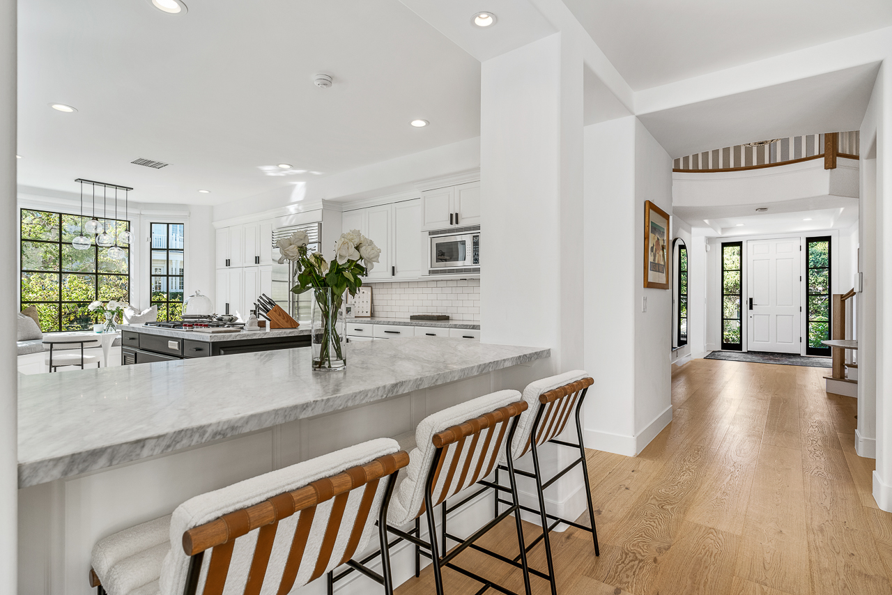 Located in the El Medio Bluffs, this recently remodeled home boasts bright and airy finishes throughout. Enter through the gated front door, where you will find the formal living and dining room with custom cabinetry, perfect for entertaining friends and family. The downstairs floor-plan also offers an en suite bedroom and powder bath. The open concept kitchen features open shelving, an oversized center island, a custom built-in banquette, and separate countertop seating. The cozy family room off of the kitchen opens up to the secluded and tranquil backyard, with a newly built pergola, pool/spa with waterfall feature and electric cover, BBQ area with fridge, and an outdoor shower. The cascading staircase leads up to three spacious en suite bedrooms, a laundry room, and a bonus playroom. The primary bedroom includes a fireplace, newly remodeled bathroom with an oversized dual vanity, and a large walk-in custom closet. The detached garage is easily accessible through the backyard. Short distance to the Palisades Village, restaurants, shopping, beaches, parks and schools. Truly a Palisades gem!