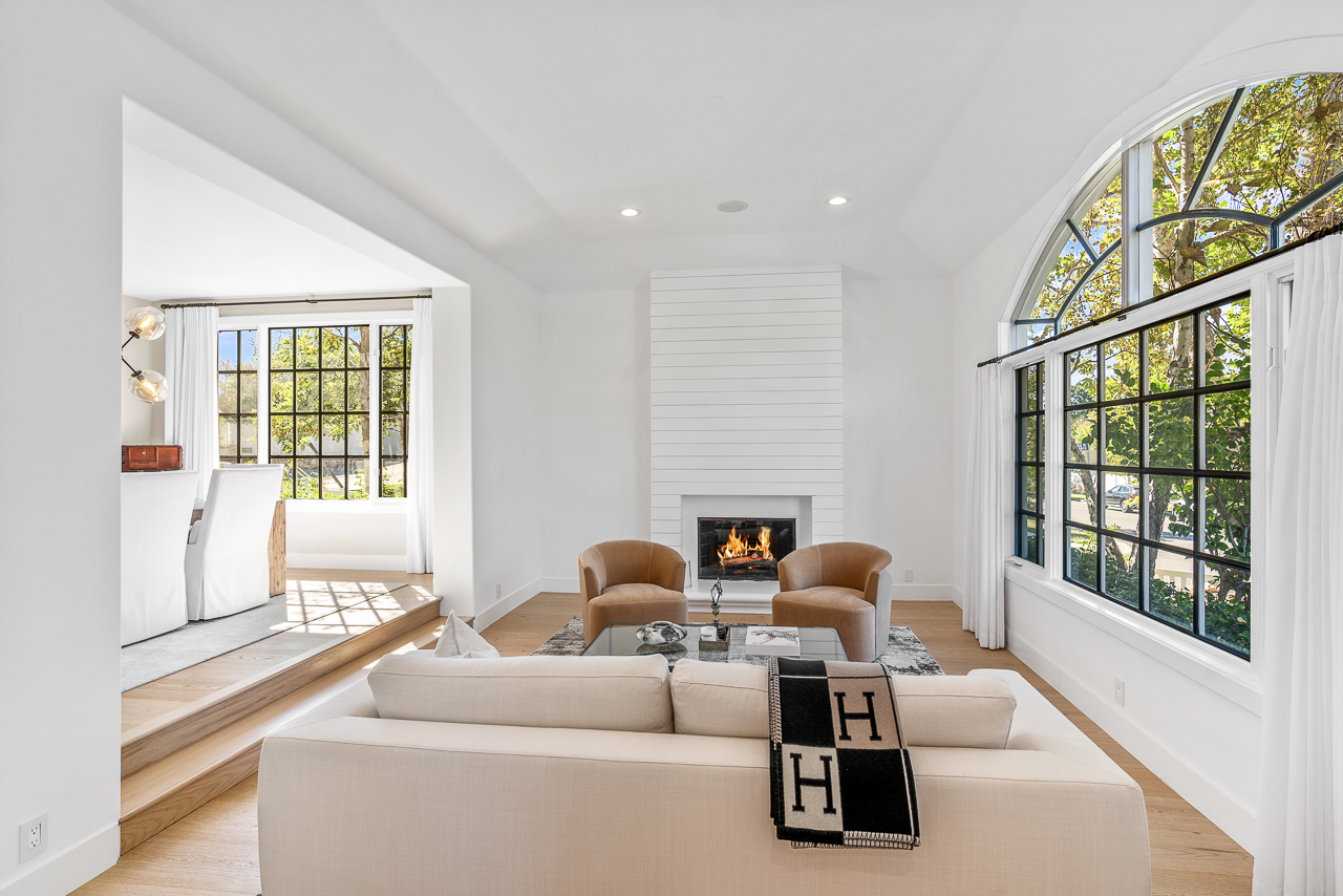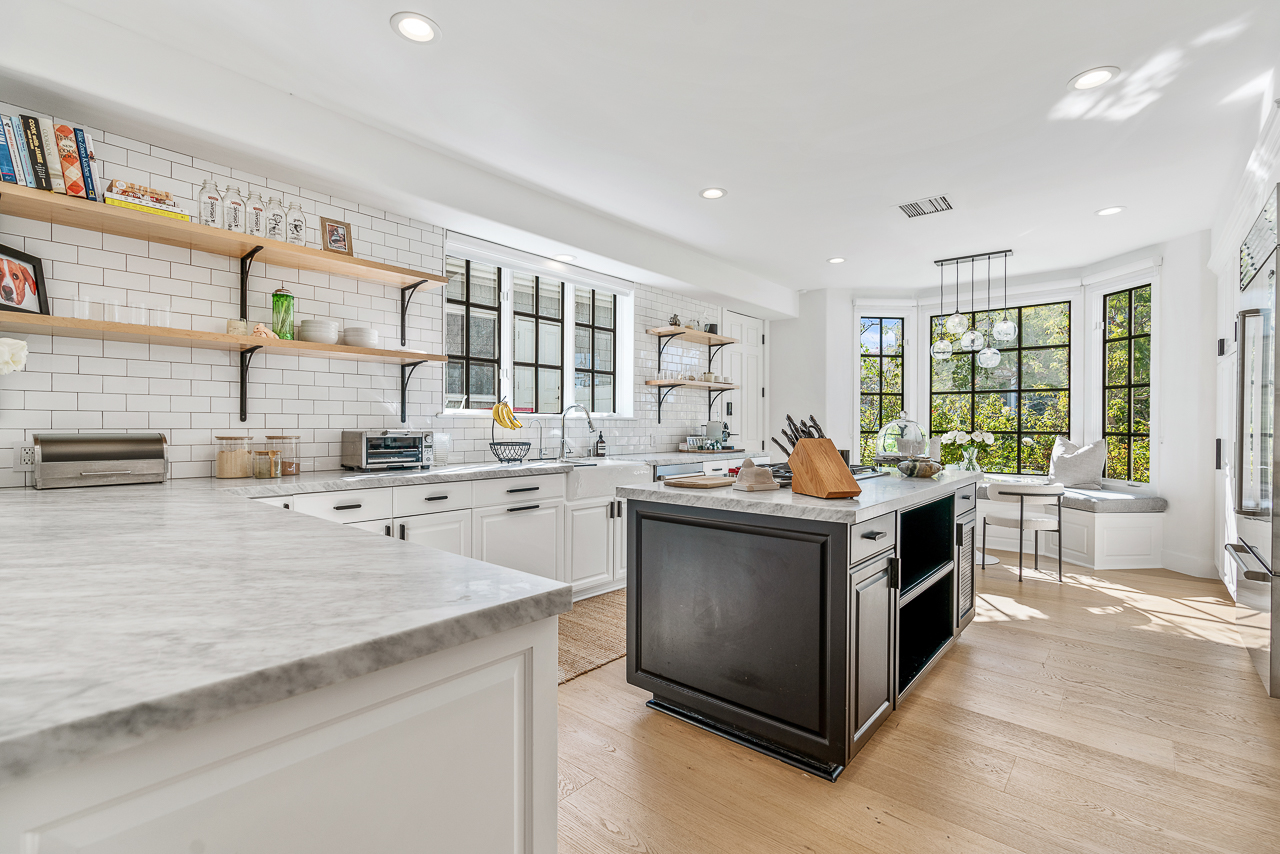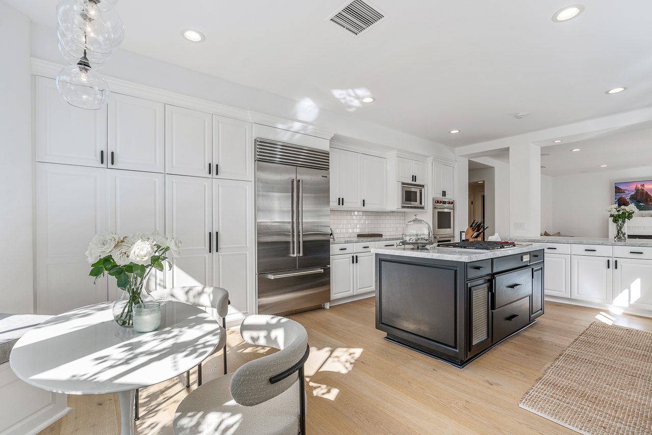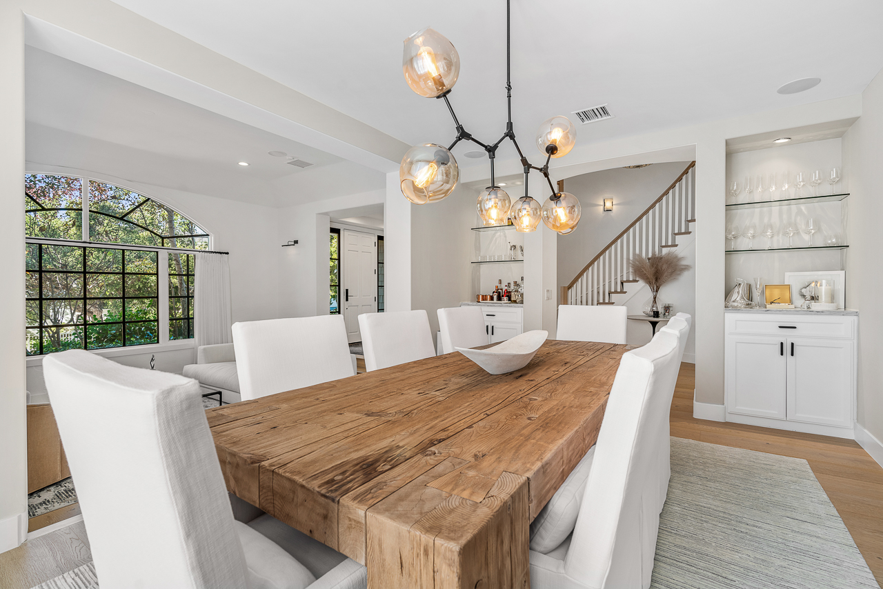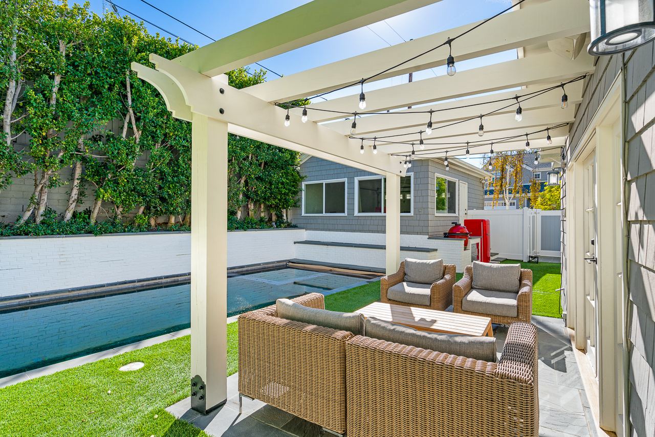 Located in the El Medio Bluffs, this recently remodeled home boasts bright and airy finishes throughout. Enter through the gated front door, where you will find the formal living and dining room with custom cabinetry, perfect for entertaining friends and family. The downstairs floor-plan also offers an en suite bedroom and powder bath. The open concept kitchen features open shelving, an oversized center island, a custom built-in banquette, and separate countertop seating. The cozy family room off of the kitchen opens up to the secluded and tranquil backyard, with a newly built pergola, pool/spa with waterfall feature and electric cover, BBQ area with fridge, and an outdoor shower. The cascading staircase leads up to three spacious en suite bedrooms, a laundry room, and a bonus playroom. The primary bedroom includes a fireplace, newly remodeled bathroom with an oversized dual vanity, and a large walk-in custom closet. The detached garage is easily accessible through the backyard. Short distance to the Palisades Village, restaurants, shopping, beaches, parks and schools. Truly a Palisades gem!