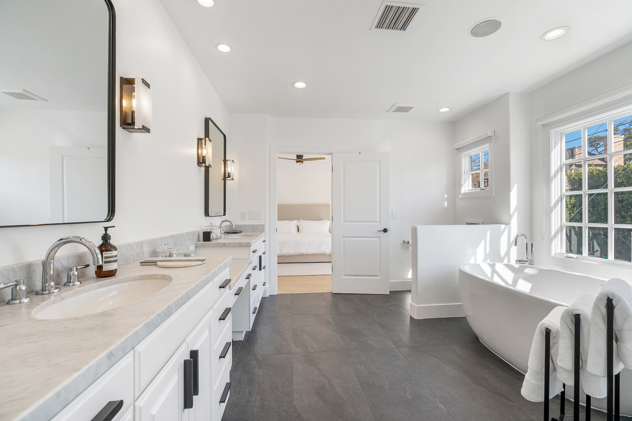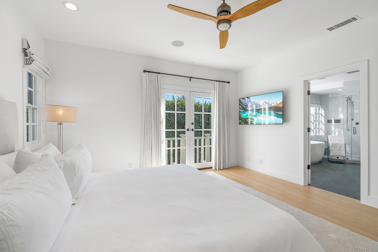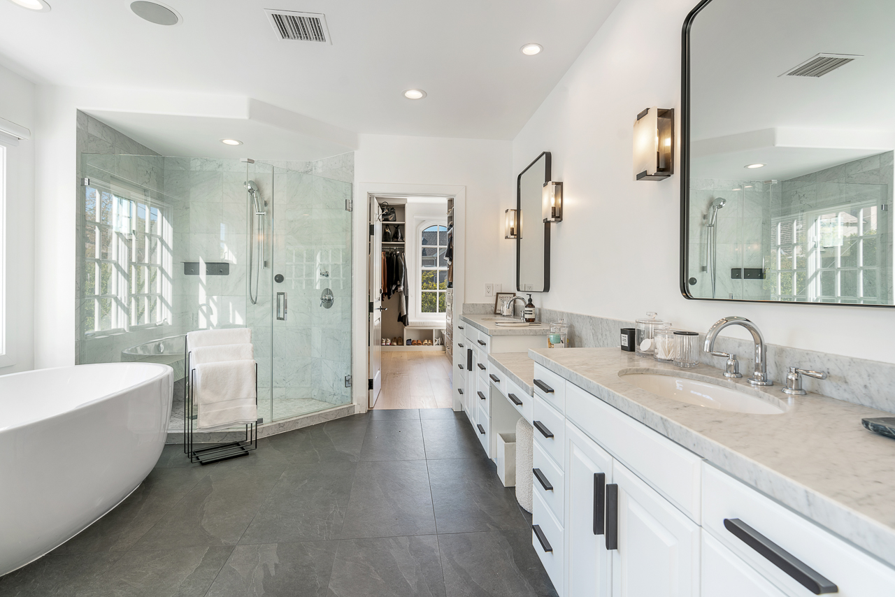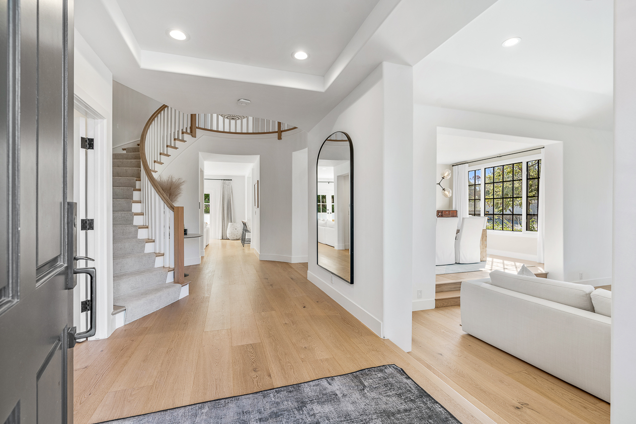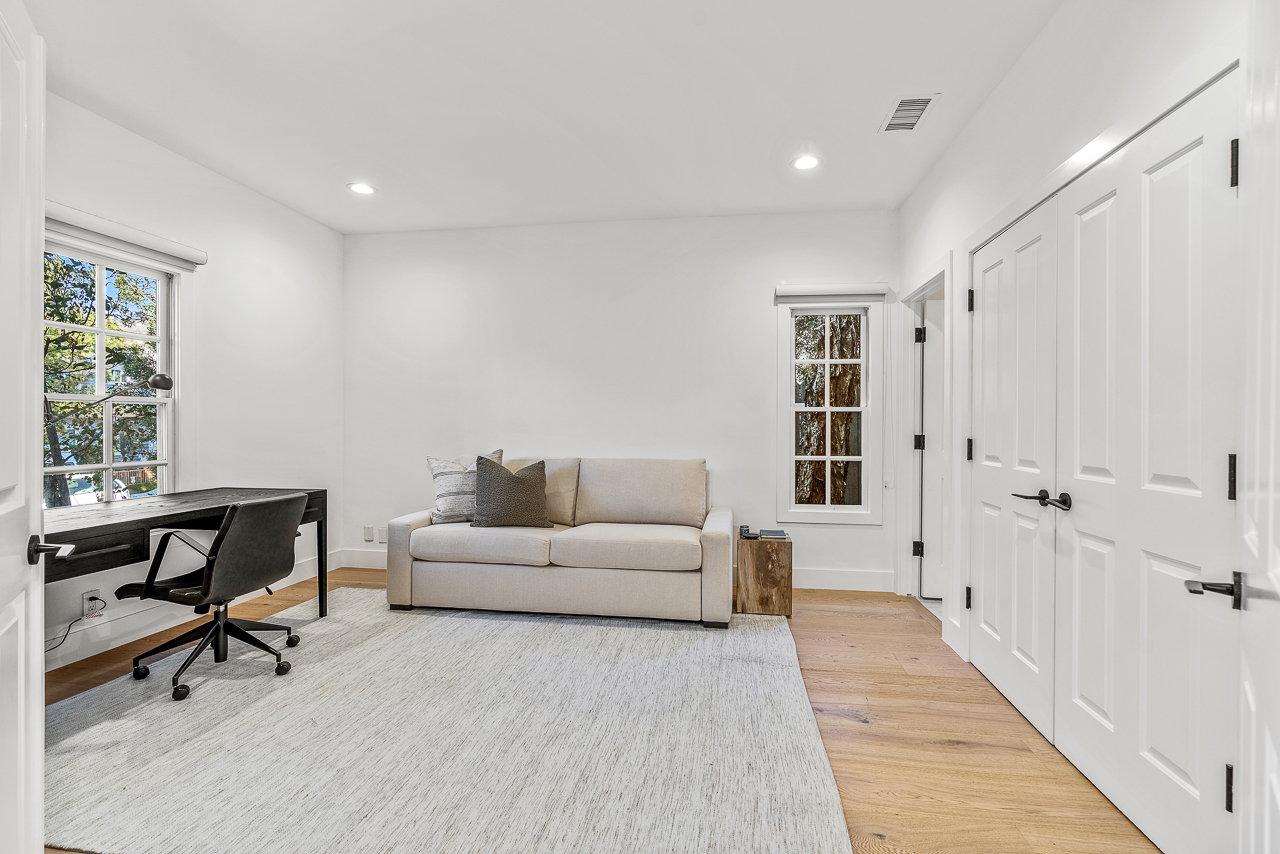 Located in the El Medio Bluffs, this recently remodeled home boasts bright and airy finishes throughout. Enter through the gated front door, where you will find the formal living and dining room with custom cabinetry, perfect for entertaining friends and family. The downstairs floor-plan also offers an en suite bedroom and powder bath. The open concept kitchen features open shelving, an oversized center island, a custom built-in banquette, and separate countertop seating. The cozy family room off of the kitchen opens up to the secluded and tranquil backyard, with a newly built pergola, pool/spa with waterfall feature and electric cover, BBQ area with fridge, and an outdoor shower. The cascading staircase leads up to three spacious en suite bedrooms, a laundry room, and a bonus playroom. The primary bedroom includes a fireplace, newly remodeled bathroom with an oversized dual vanity, and a large walk-in custom closet. The detached garage is easily accessible through the backyard. Short distance to the Palisades Village, restaurants, shopping, beaches, parks and schools. Truly a Palisades gem!