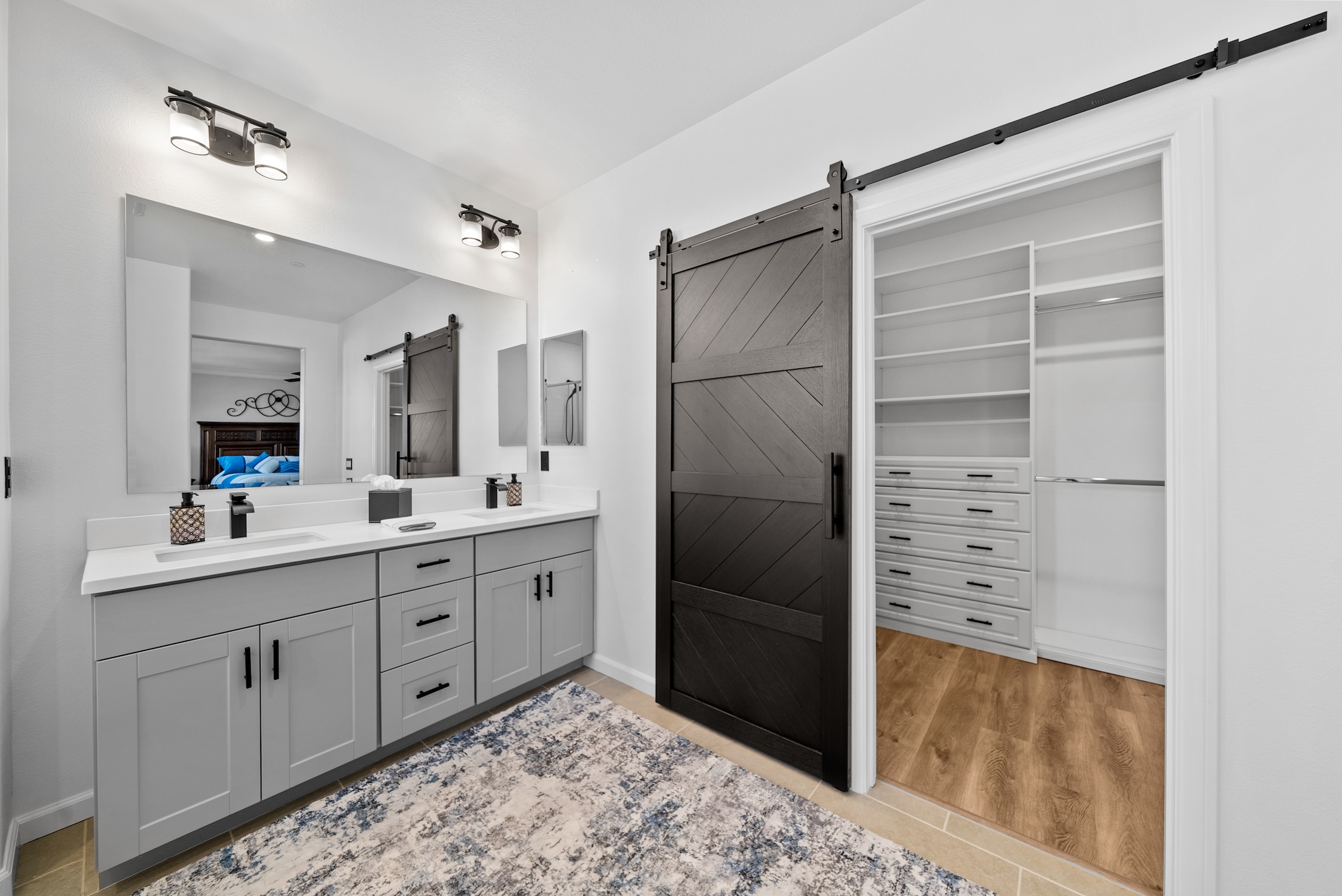 The open-concept great room is bathed in natural light, leading to a gourmet kitchen with a new range, new refrigerator with water filtration, and a separate pantry closet for added storage. Upstairs, the primary suite is a true retreat, featuring a spa-like soaking tub, walk-in shower, and a custom walk-in closet with an elegant barn door.