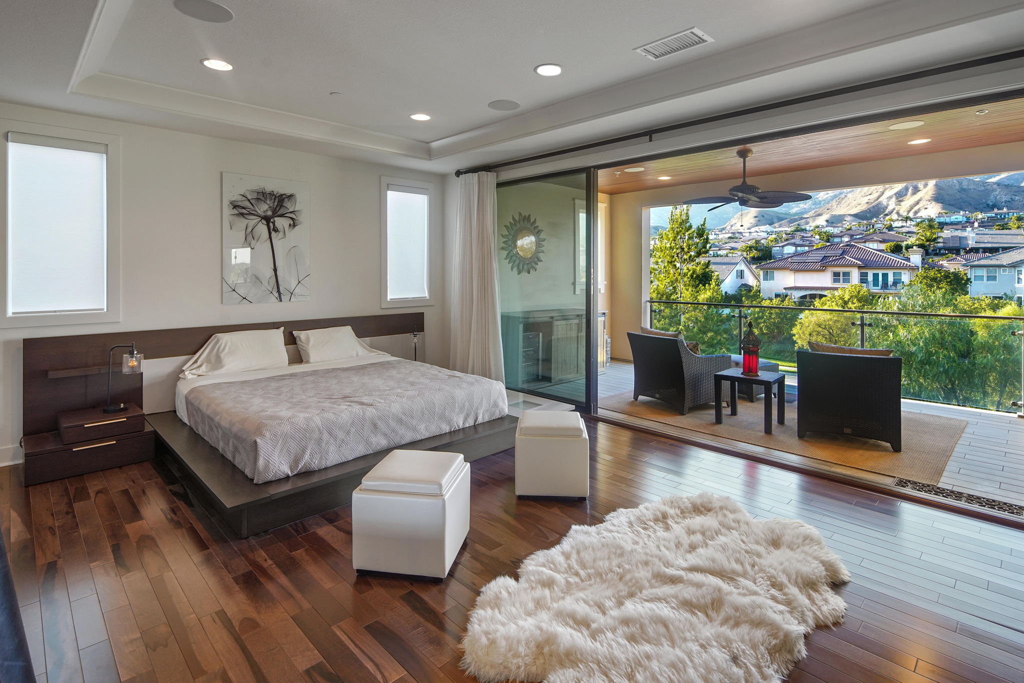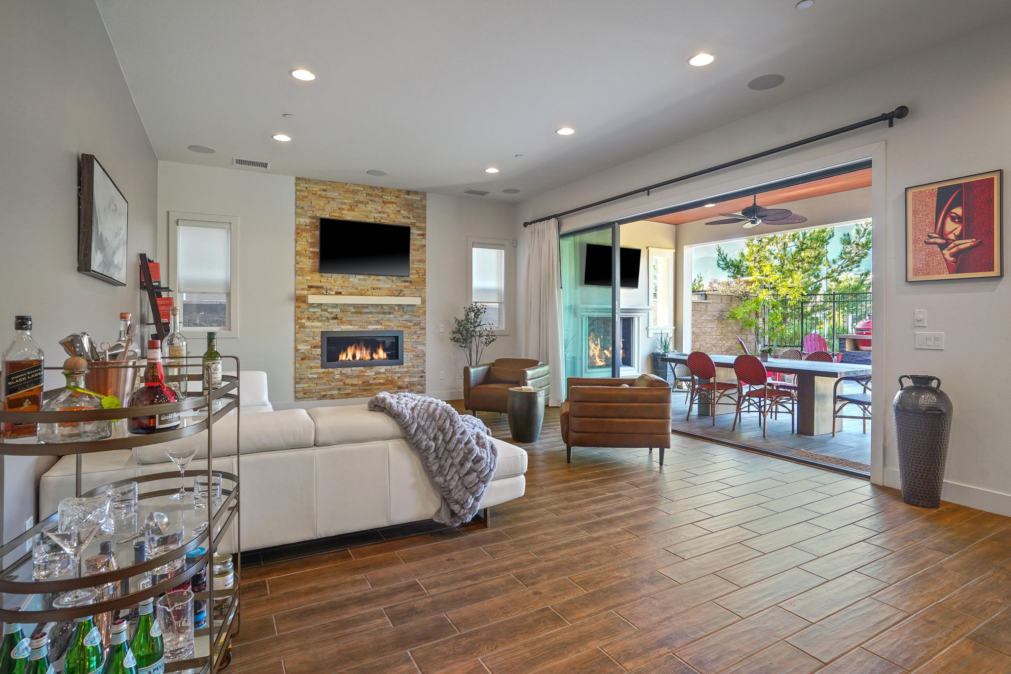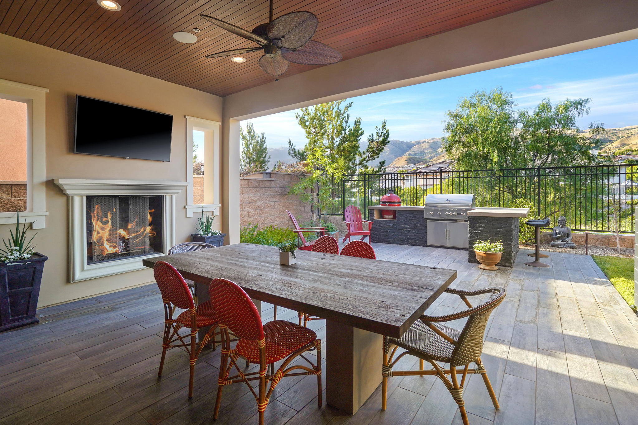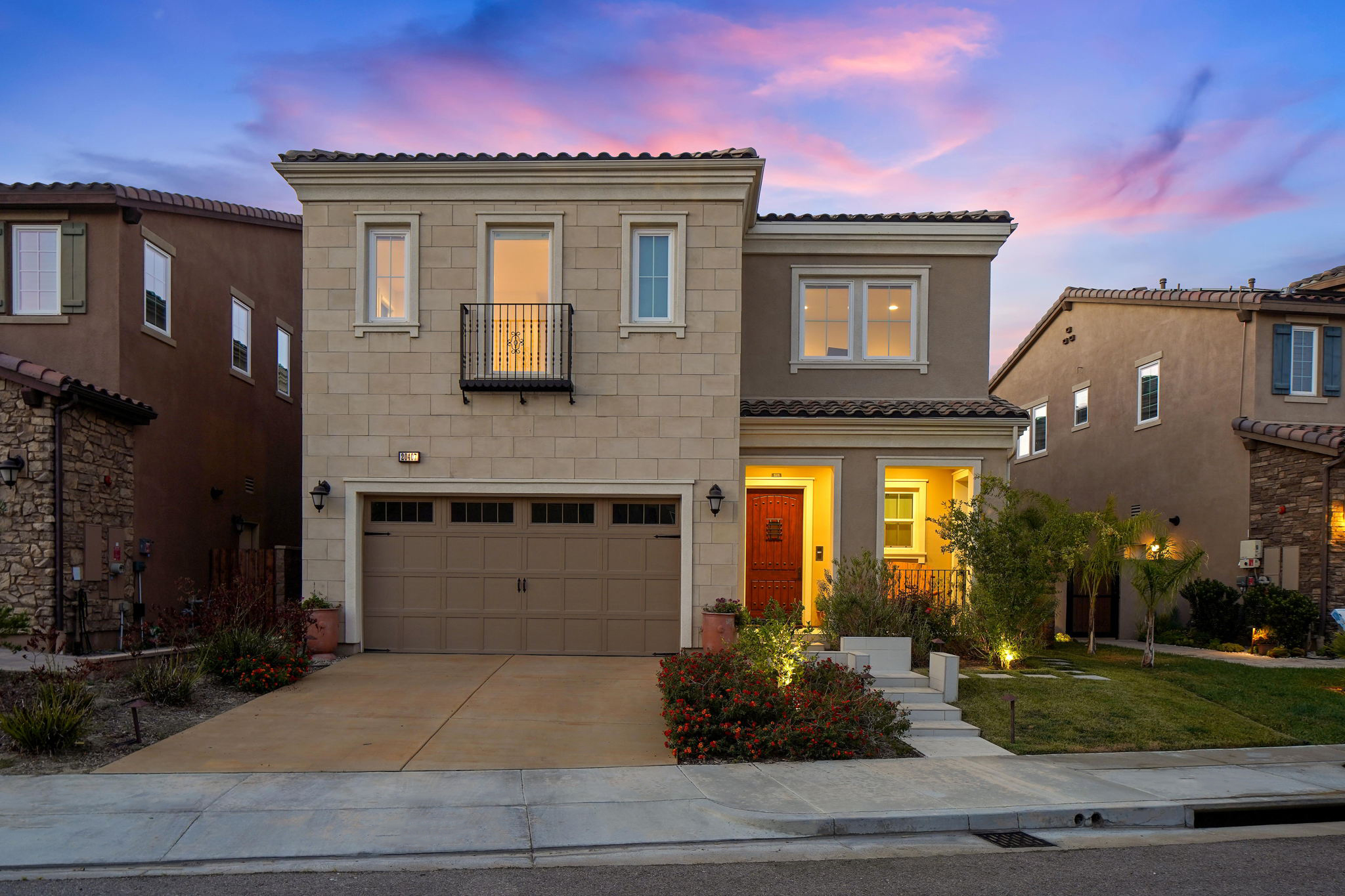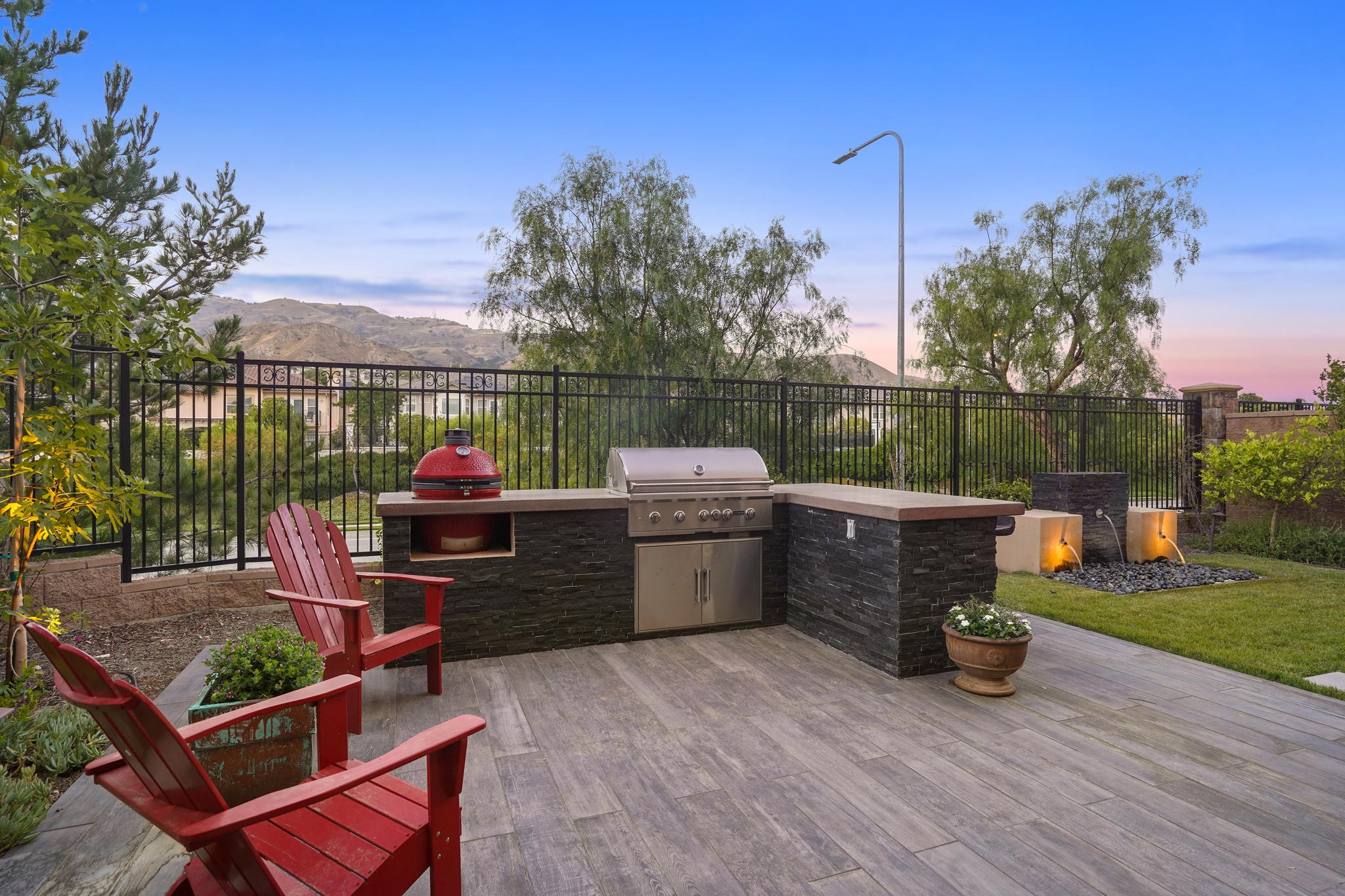 This highly sought after "Mayberry Italienate" floor plan is the most expansive and desirable model available within the prestigious gated community of "Avila Glen."Offering top of the line upgrades throughout, the home features 3,295 SF of luxurious living. Built in 2017, this newer construction home is in pristine condition offering 4 bedrooms, 5 baths, tranquil mountain views, and is an entertainer's dream with an open floor plan and indoor/outdoor living.A chef's kitchen, open to the main living and dining areas, left nothing to be desired. Stainless steel appliances, floor to ceiling cabinets, a walk-in pantry, and an oversized center island was ideally designed for modern day living. The 4th bedroom with ensuite bath, half-bath, and 2 car garage with epoxy flooring and built in storage. Sliding glass doors open from the living room, where you can enjoy a romantic fire lit dinner on the patio while unwinding to the sound of the custom water feature, or entertain friends at the built-in BBQ with motorized rotisserie and Kamato smoker.The impressive foyer has been upgraded with intricate floor to ceiling ledger stone walls. Showcasing the winding staircase that leads to 3 spacious bedrooms and family room on the 2nd level. The luxurious second level owners suite with fireplace won't disappoint with a private balcony and mountain views, massive spa style shower & soaking tub, dual shower-heads, his/hers vanities, and 145sf walk-in closet.