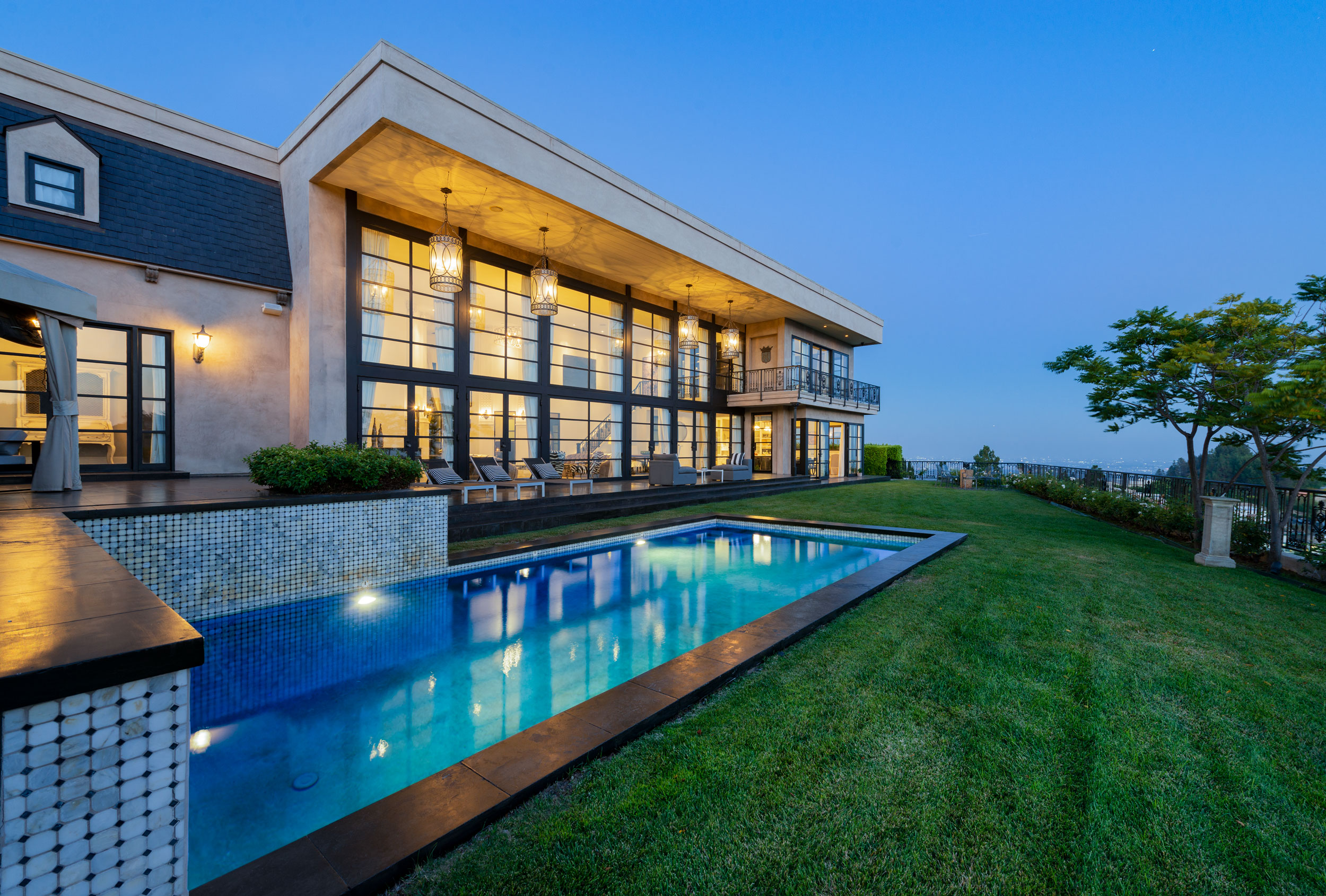 Bespoke Entertainers View Home. The unassuming exterior creates a perfect veil over the astounding triumph behind the gates. A quiet, serene courtyard opens to soaring 25 foot, west facing, walls of glass looking over the vast, flat grassy yard to commanding, jetliner views from downtown to the pacific ocean. Upstairs the Master Suite boasts 180 degree views of the city, two sided fireplace, walk in closet and large Master Bath. An additional bedroom suite upstairs with views of downtown. Downstairs a second master suite, chefs kitchen with Wolf and SubZero appliances, optional office or fourth bedroom and movie theater. Outside amenities include solar heated, saltwater swimming pool, elevated spa with cabana and fire pit complete this truly unique masterpiece.