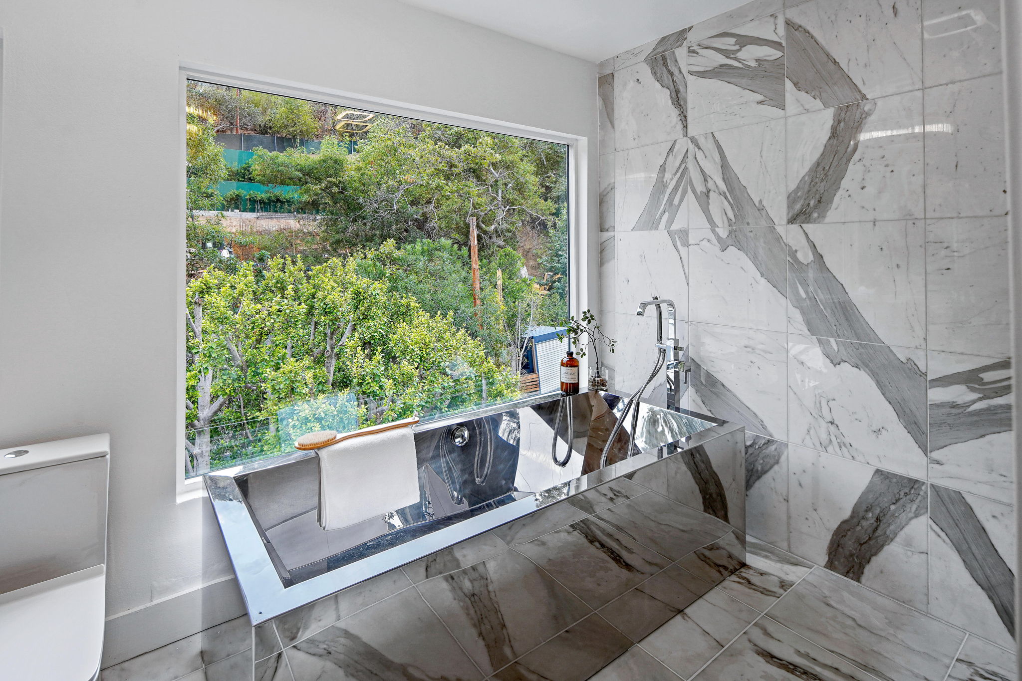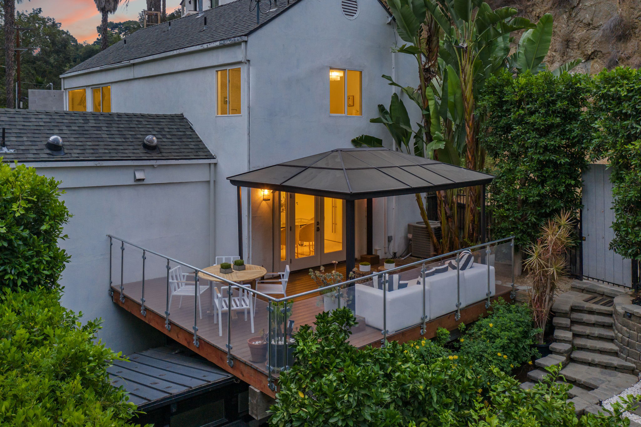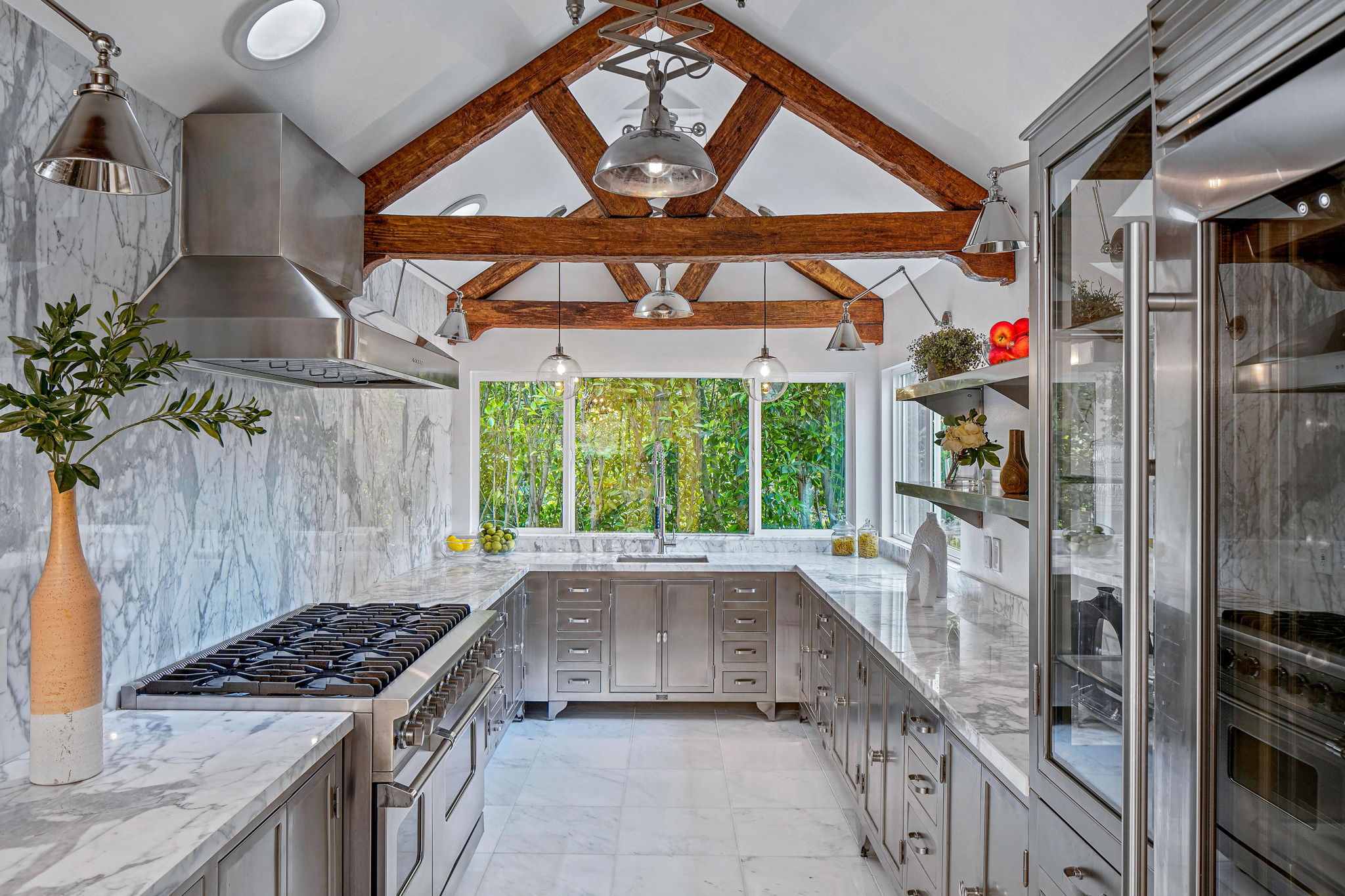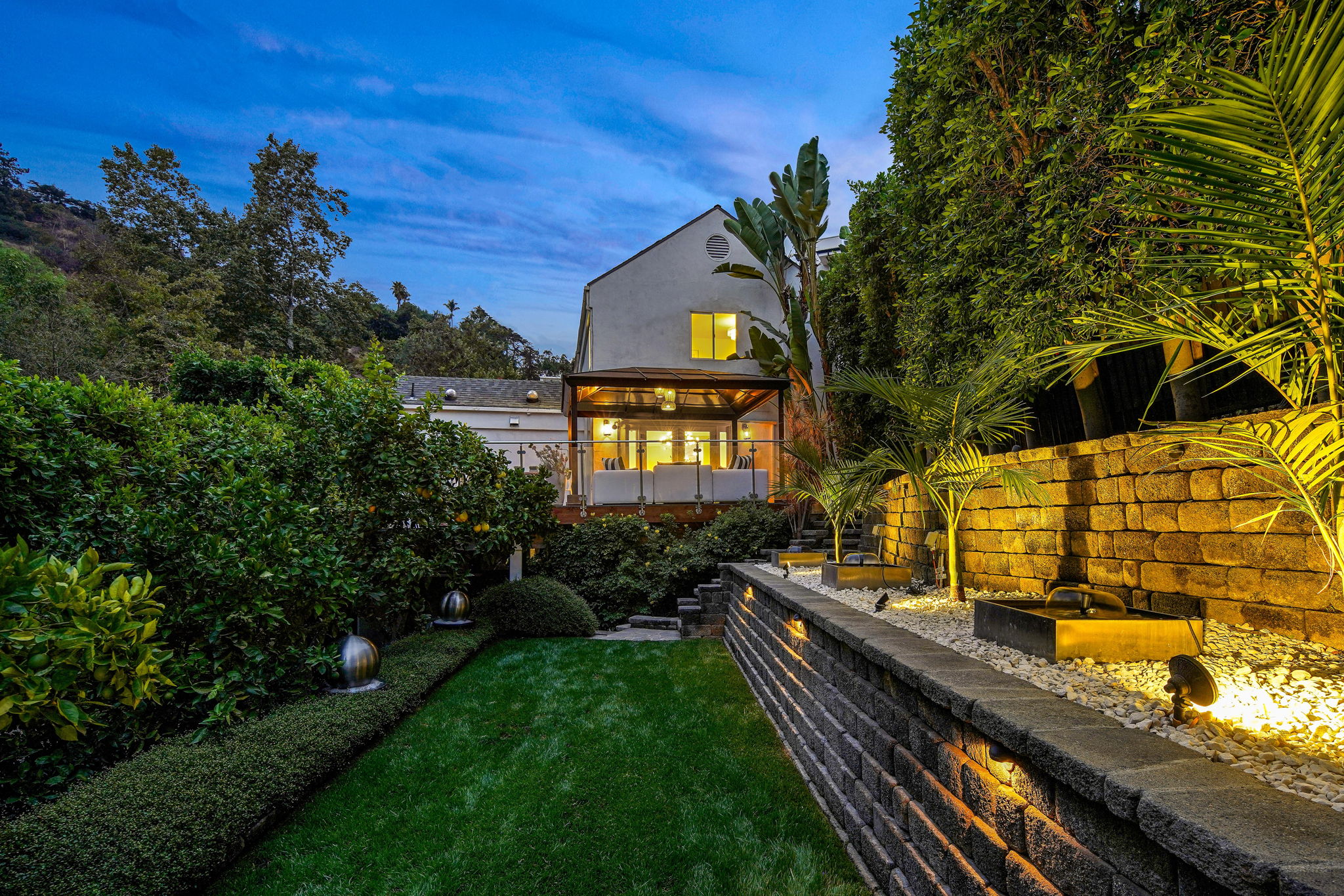 A stunning, industrial farmhouse-style home nestled in the Hollywood Hills. The bright, expansive living room features a unique, textured ceiling and leads to a luxurious gourmet kitchen enhanced with high-end appliances, exposed wood beams, and beautiful marble countertops with a separate butler's pantry behind sliding doors. The impressive owners' suite boasts vaulted ceilings with skylights, providing an abundance of natural light. A spa-like bathroom features an oversized, polished steel tub and gorgeous marble shower. Relax in the serene and private backyard, surrounded by multiple fountains and lush greenery, with a covered patio and grassy yard, perfect for entertaining. Bonus room below patio with separate entry. Attached 2-car garage.