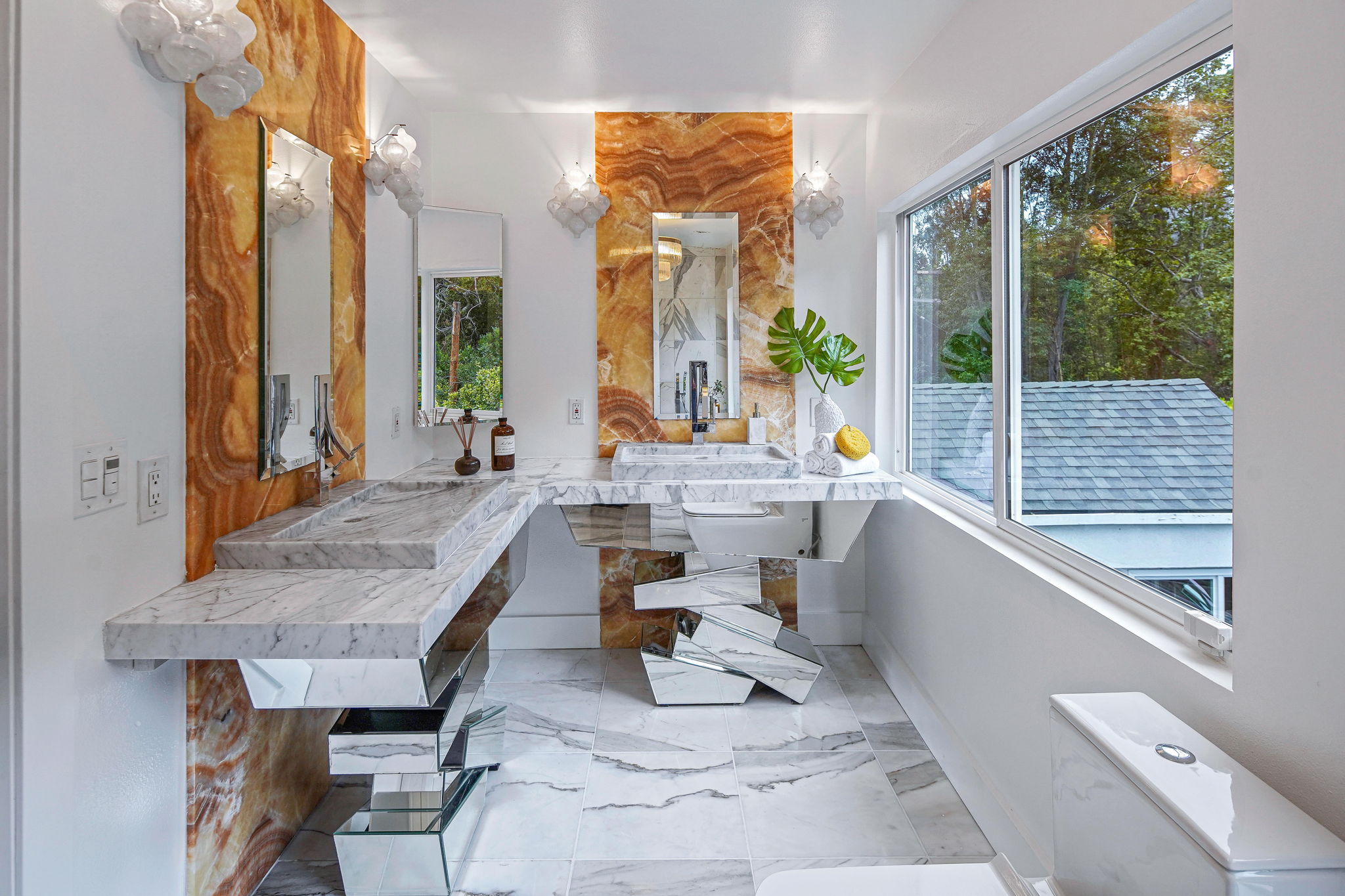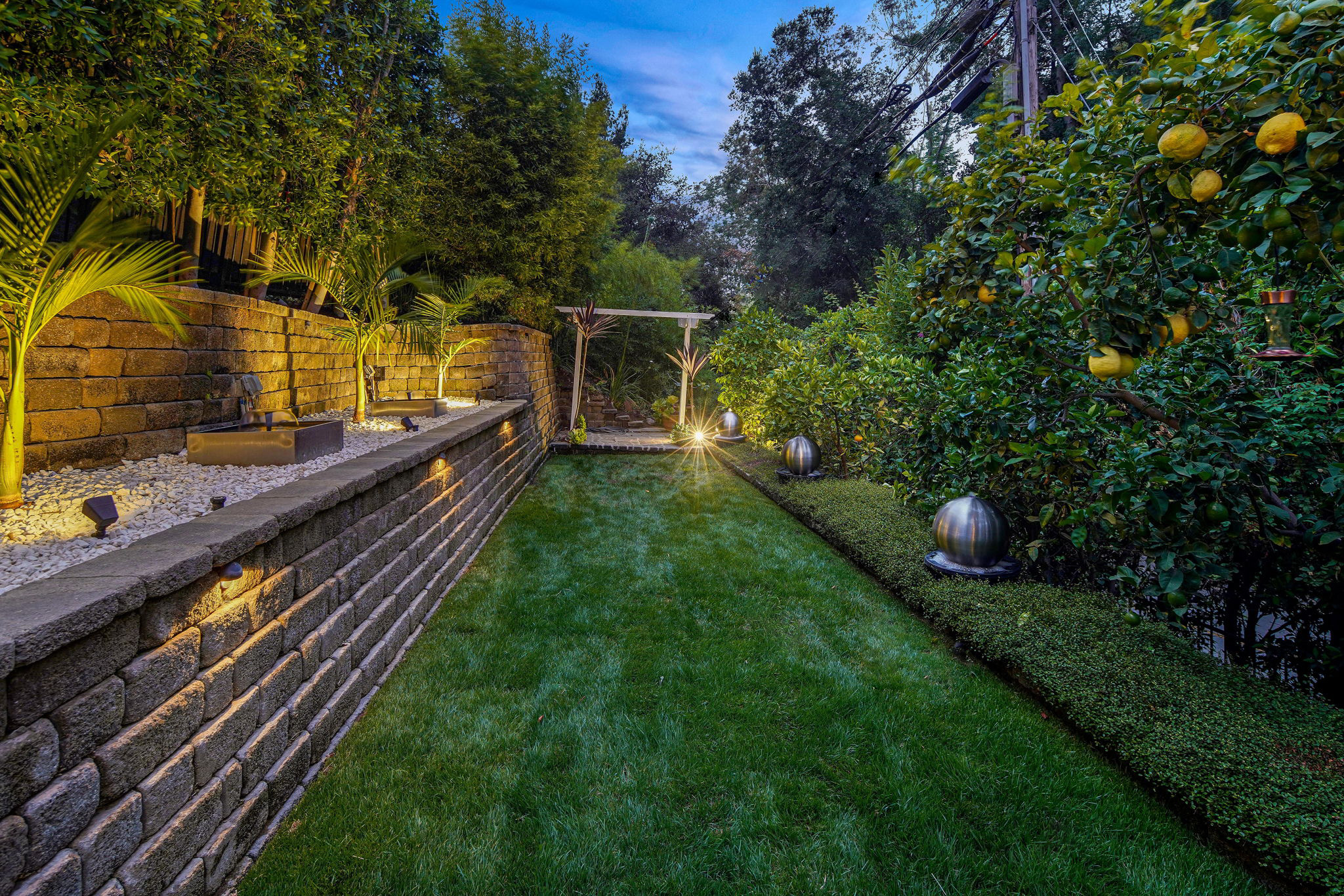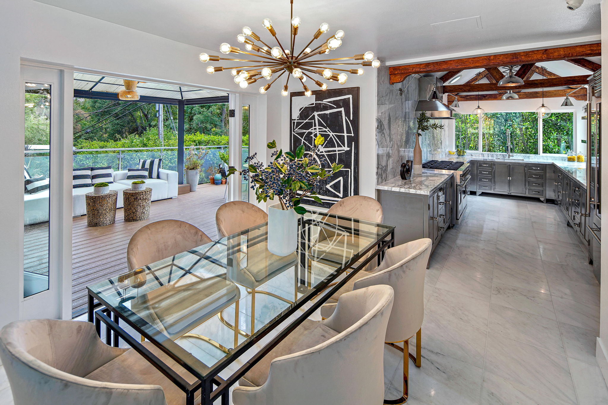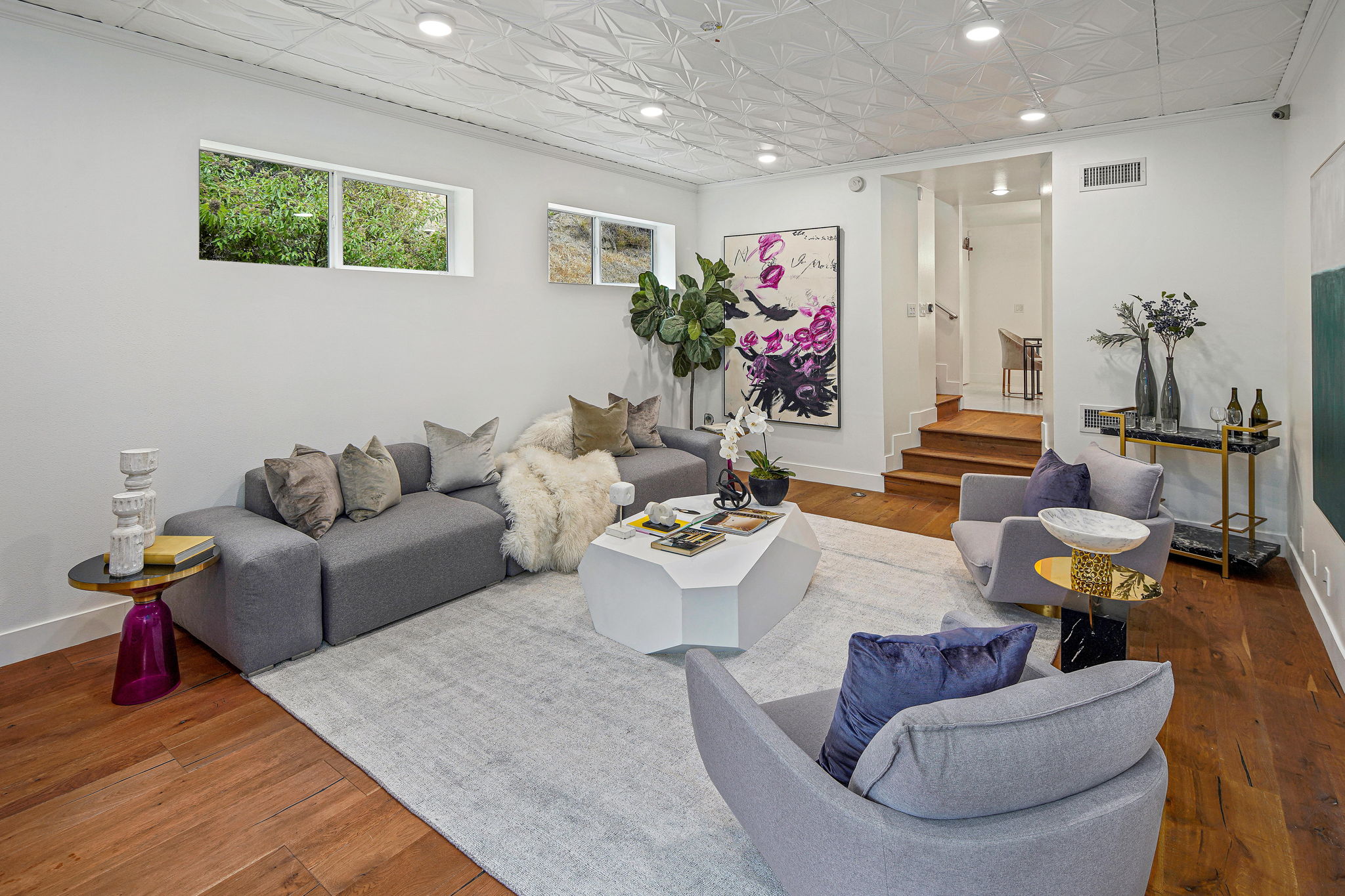 A stunning, industrial farmhouse-style home nestled in the Hollywood Hills. The bright, expansive living room features a unique, textured ceiling and leads to a luxurious gourmet kitchen enhanced with high-end appliances, exposed wood beams, and beautiful marble countertops with a separate butler's pantry behind sliding doors. The impressive owners' suite boasts vaulted ceilings with skylights, providing an abundance of natural light. A spa-like bathroom features an oversized, polished steel tub and gorgeous marble shower. Relax in the serene and private backyard, surrounded by multiple fountains and lush greenery, with a covered patio and grassy yard, perfect for entertaining. Bonus room below patio with separate entry. Attached 2-car garage.