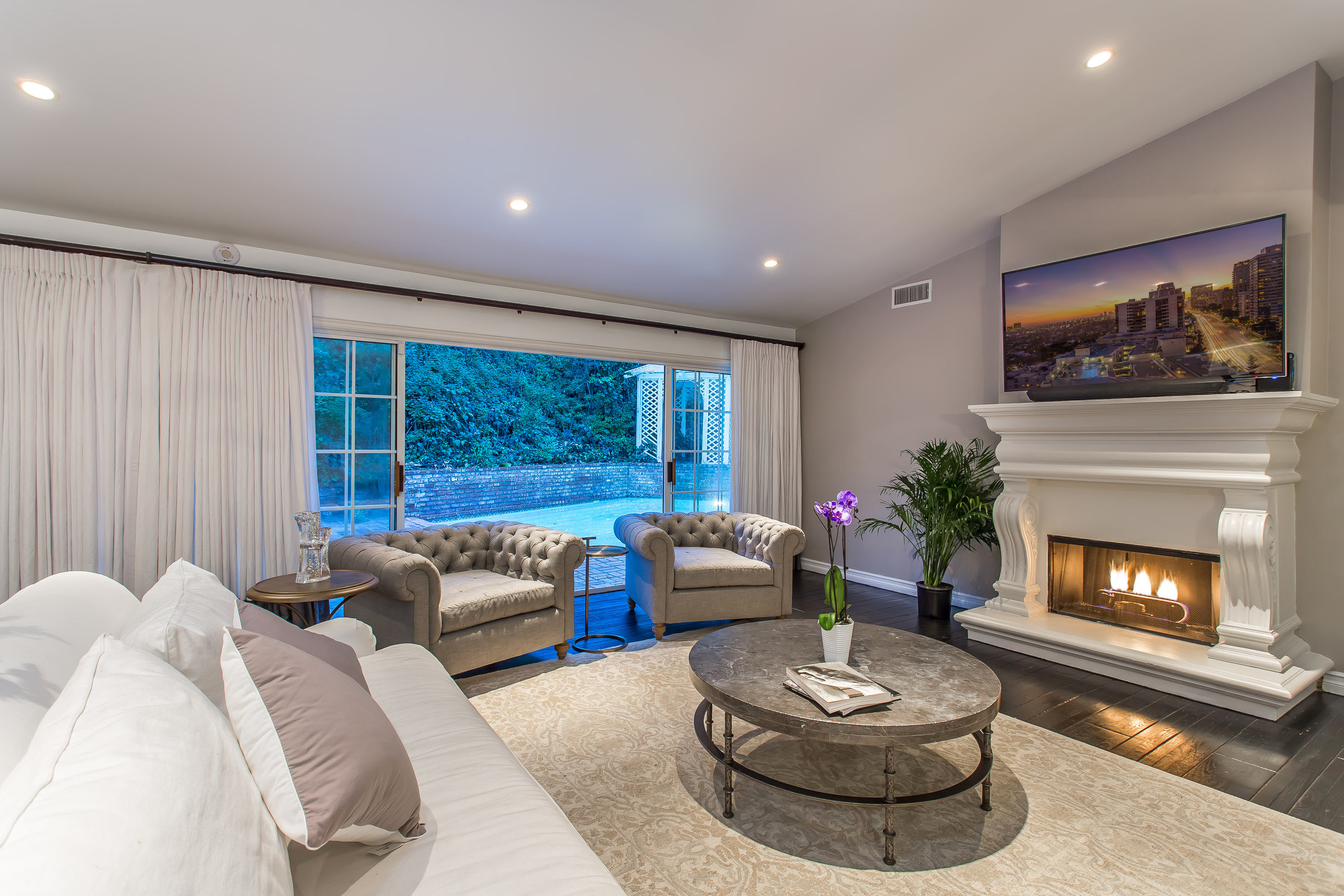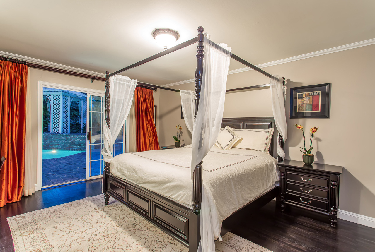 Chic and sophisticated mid-century contemporary designed to accentuate the warmth, functionality, and flow of Southern California indoor/outdoor living. Park in the 2-car garage or circular driveway and enter into an expansive open floor plan with soaring high ceilings, handsome dark hardwood floors, a cozy fireplace, and open living and dining areas, all while boasting 30 feet of wall-to-wall sliding glass doors that open to the backyard and sparkling pool. A gourmet kitchen, situated next to the living room, features granite countertops, stainless steel appliances, and an eat-in breakfast area. Four spacious bedrooms including a mater suite with two walk-in closets, a spa-like master bathroom with shower and bathtub, and a separate en-suite bedroom perfect for guests, an office, a family room, a play area, or a theater. Secluded outdoor entertaining area with pool and gazebo overlooking the generous private backyard. The home is finished with a surveillance system, 16-channel DVR, 9-color cameras, and ADP alarm system with radar and glass break protection. Enjoy the best 90210 has to offer.
