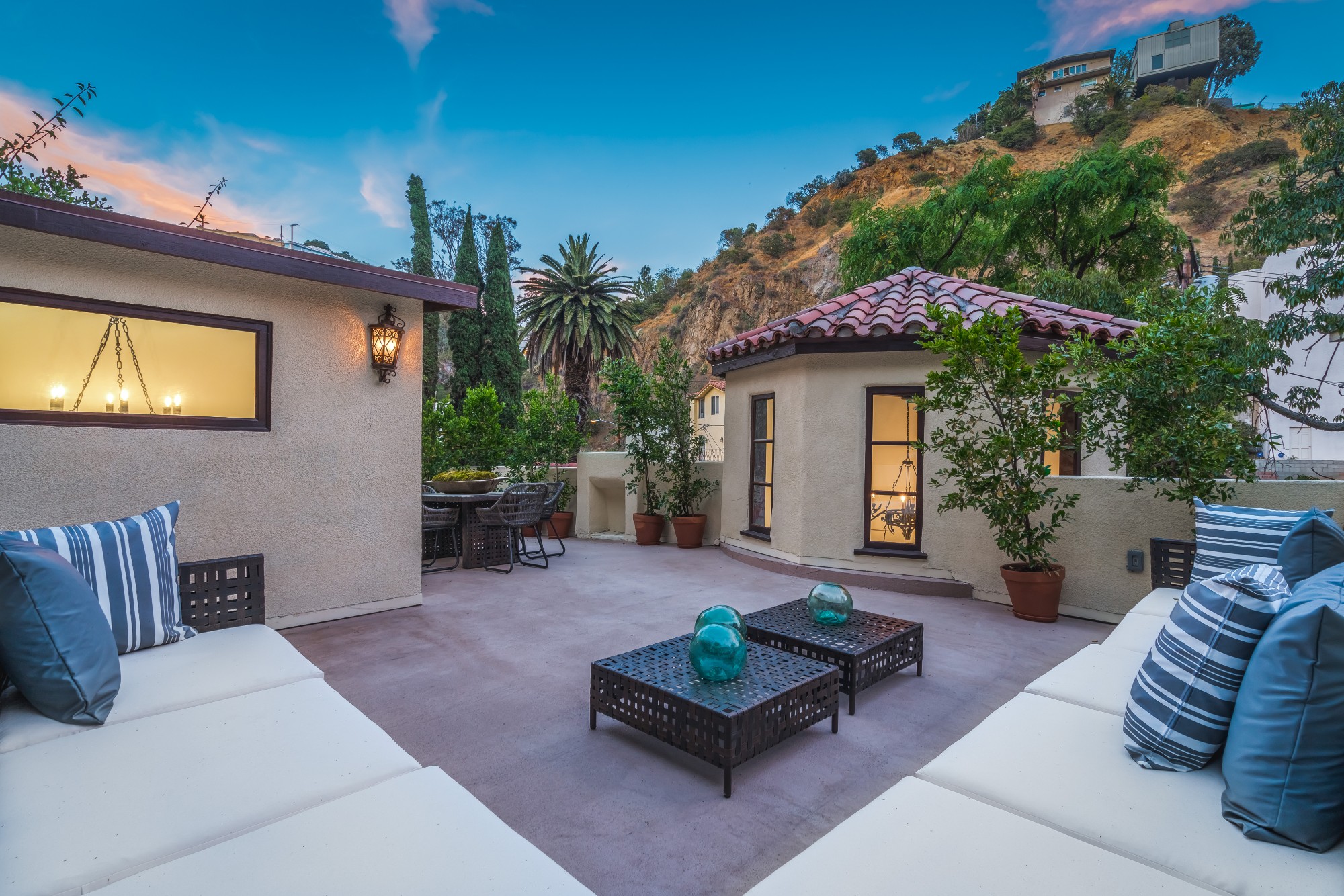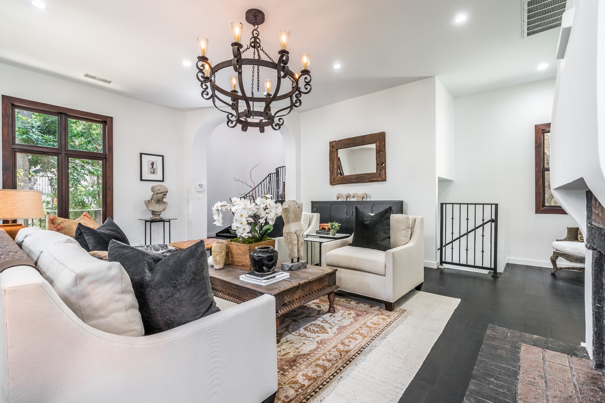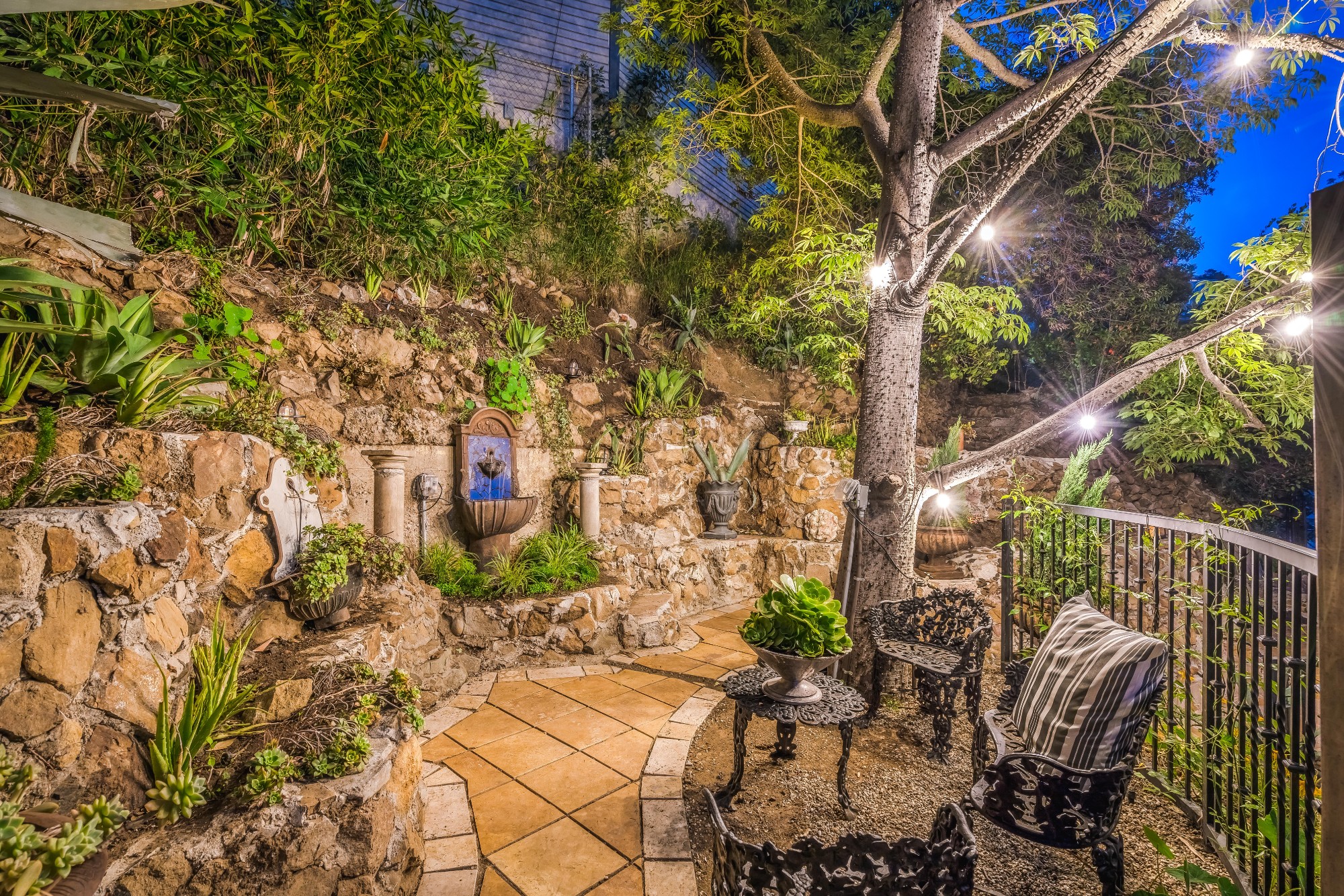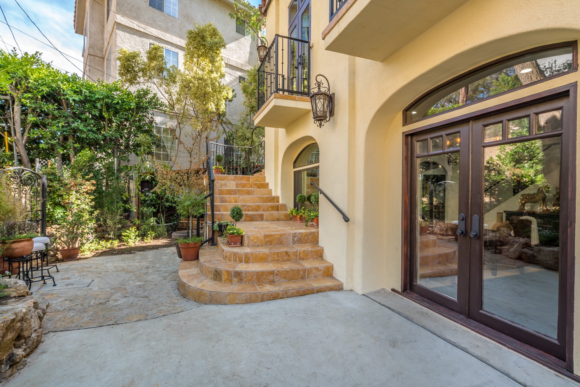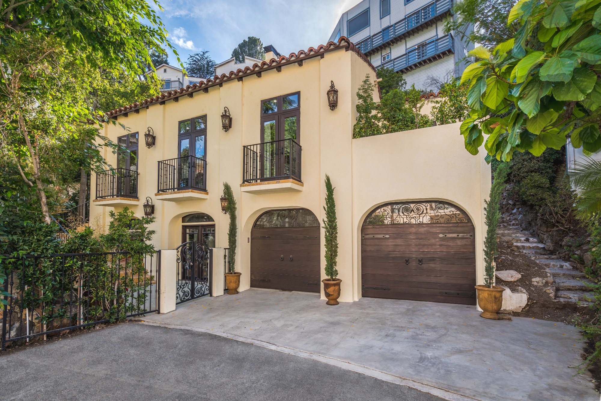 Exquisitely remodeled and restored Spanish Revival located in prime Hollywood Dell. No expense was spared and no detail missed. Enter into an expansive 20' turret entryway which leads to an oversized formal living area, complete with wood-burning fireplace, soaring ceilings, and french doors opening to breezy balconies. Archways with hand-carved wooden details lead to a gourmet chef's kitchen complete with stainless steel appliances, Marble countertops, and backsplash, and eating area with cozy fireplace. Three bedrooms with private balconies, including an owner's suite with walk-in closet and a luxurious, spa-like bathroom with carrera marble flooring, dual sinks, shower, and bathtub. Generously-sized downstairs living/media room with fireplace, perfect for entertaining. Tranquil rooftop terrace surrounded by mature greenery and immaculate landscaping. Stunning backyard with rock-wall vertical garden, fountain, and private grotto nestled into the hillside. 2-car garage with additional parking.