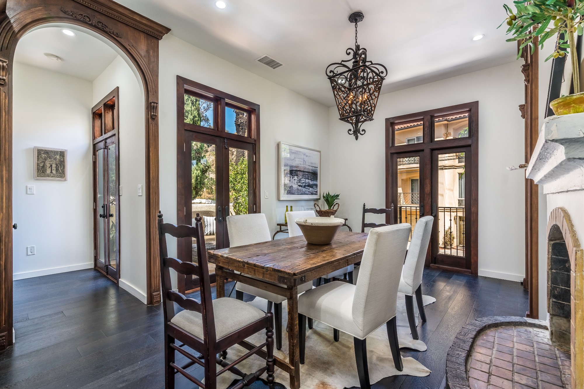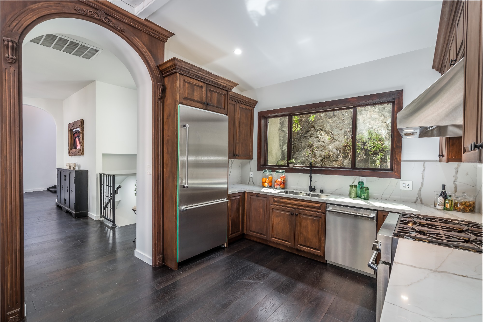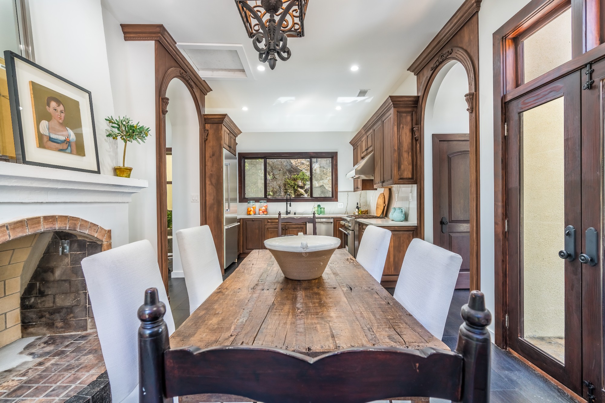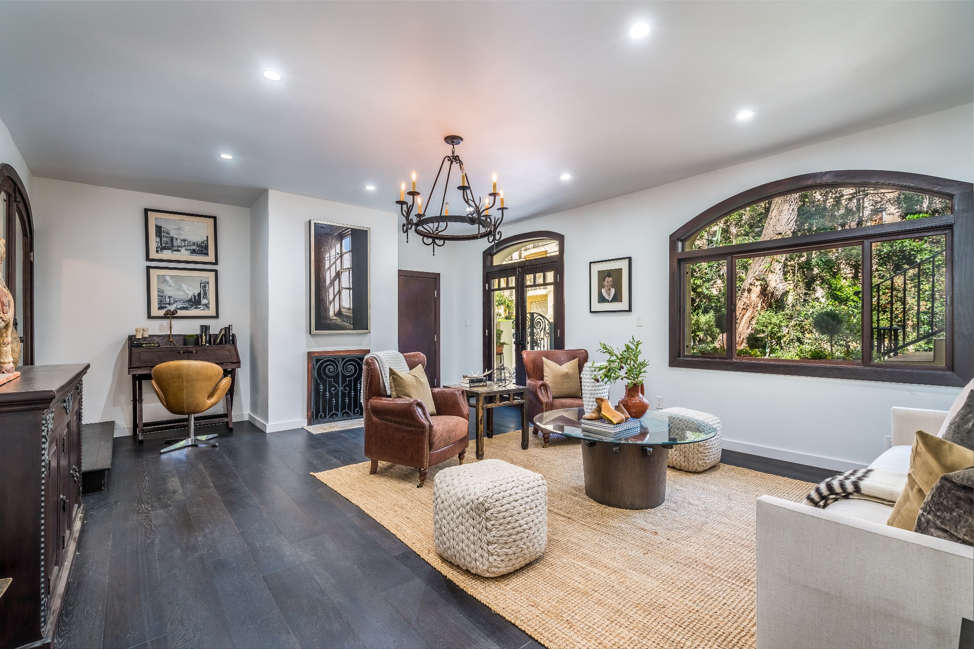 Exquisitely remodeled and restored Spanish Revival located in prime Hollywood Dell. No expense was spared and no detail missed. Enter into an expansive 20' turret entryway which leads to an oversized formal living area, complete with wood-burning fireplace, soaring ceilings, and french doors opening to breezy balconies. Archways with hand-carved wooden details lead to a gourmet chef's kitchen complete with stainless steel appliances, Marble countertops, and backsplash, and eating area with cozy fireplace. Three bedrooms with private balconies, including an owner's suite with walk-in closet and a luxurious, spa-like bathroom with carrera marble flooring, dual sinks, shower, and bathtub. Generously-sized downstairs living/media room with fireplace, perfect for entertaining. Tranquil rooftop terrace surrounded by mature greenery and immaculate landscaping. Stunning backyard with rock-wall vertical garden, fountain, and private grotto nestled into the hillside. 2-car garage with additional parking.