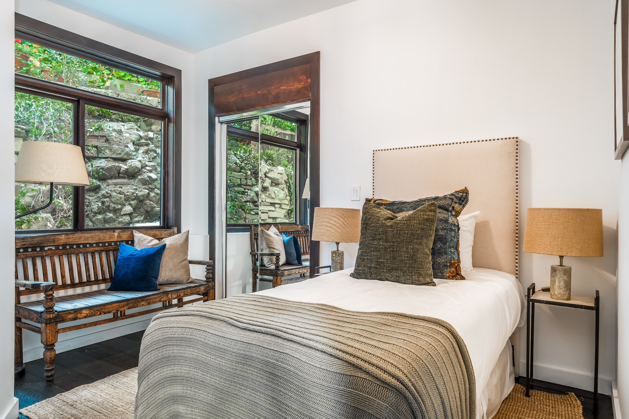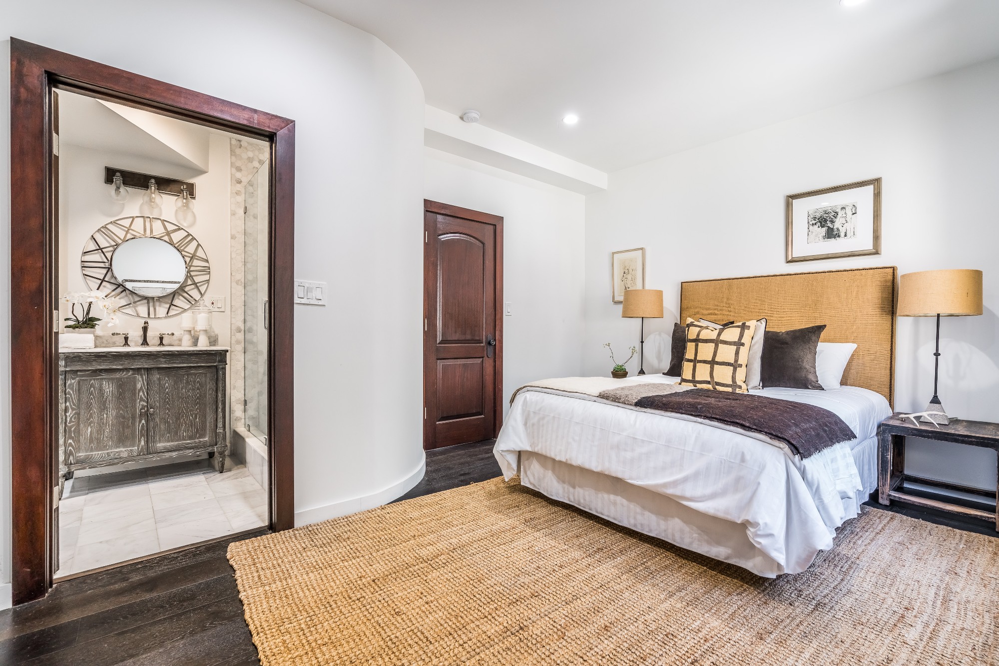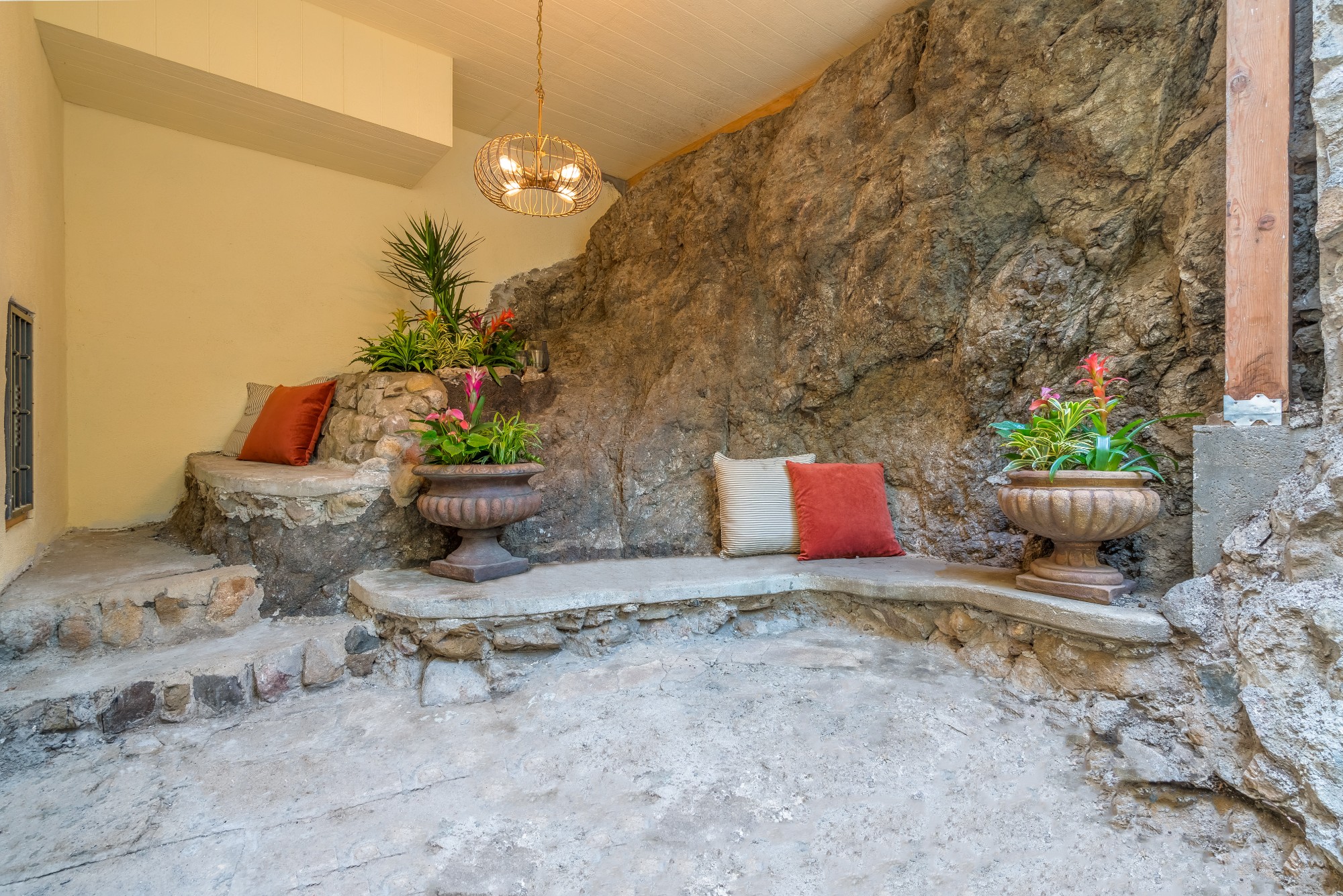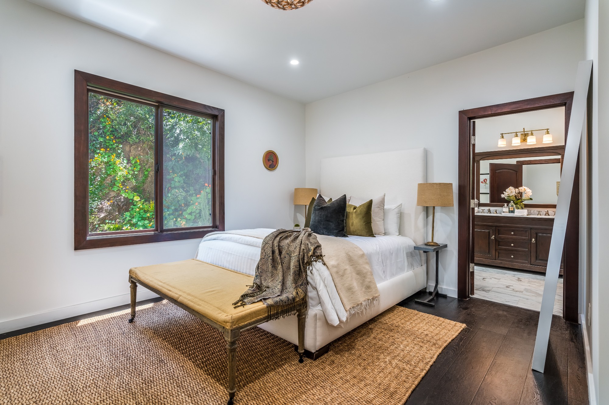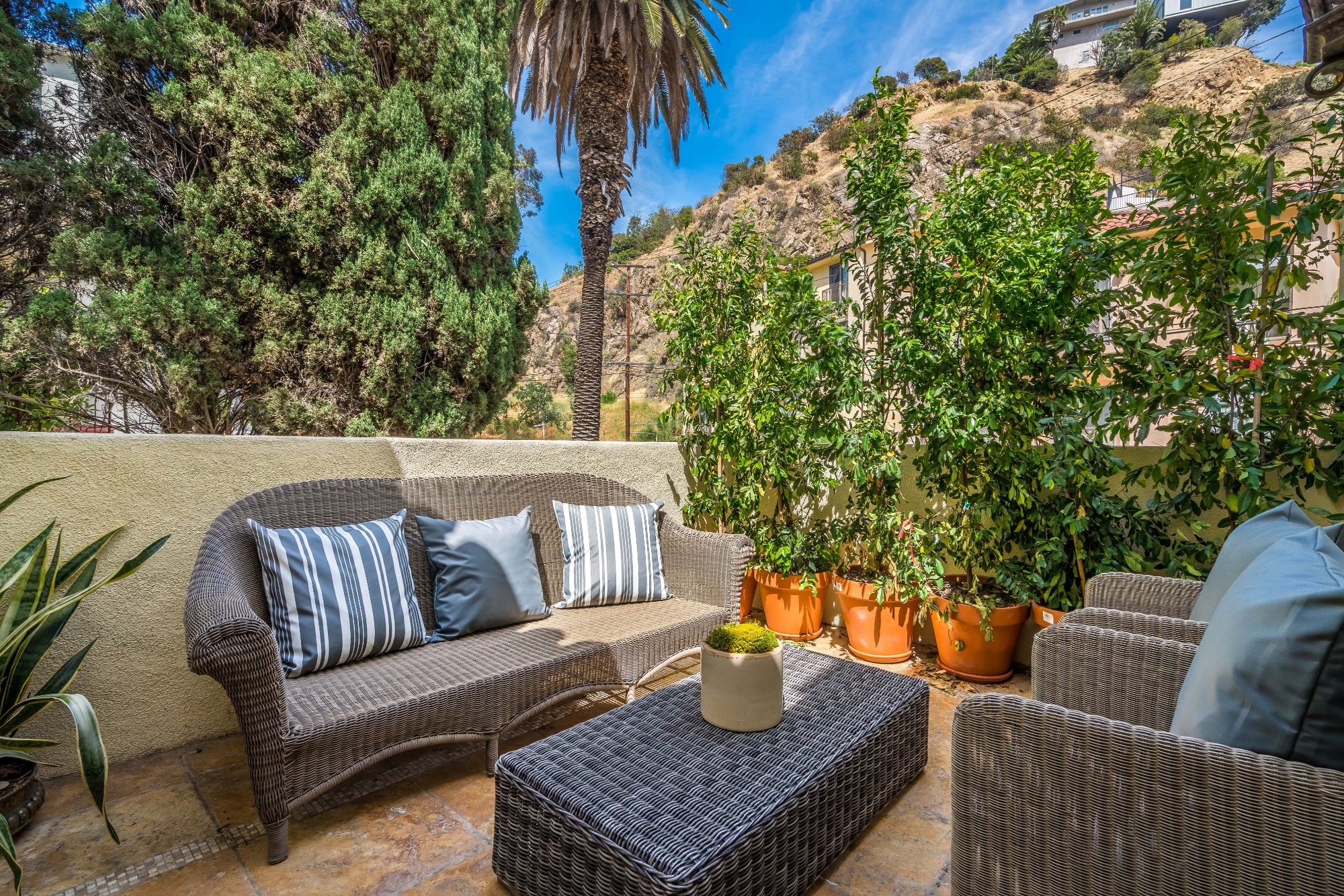Exquisitely remodeled and restored Spanish Revival located in prime Hollywood Dell. No expense was spared and no detail missed. Enter into an expansive 20' turret entryway which leads to an oversized formal living area, complete with wood-burning fireplace, soaring ceilings, and french doors opening to breezy balconies. Archways with hand-carved wooden details lead to a gourmet chef's kitchen complete with stainless steel appliances, Marble countertops, and backsplash, and eating area with cozy fireplace. Three bedrooms with private balconies, including an owner's suite with walk-in closet and a luxurious, spa-like bathroom with carrera marble flooring, dual sinks, shower, and bathtub. Generously-sized downstairs living/media room with fireplace, perfect for entertaining. Tranquil rooftop terrace surrounded by mature greenery and immaculate landscaping. Stunning backyard with rock-wall vertical garden, fountain, and private grotto nestled into the hillside. 2-car garage with additional parking.