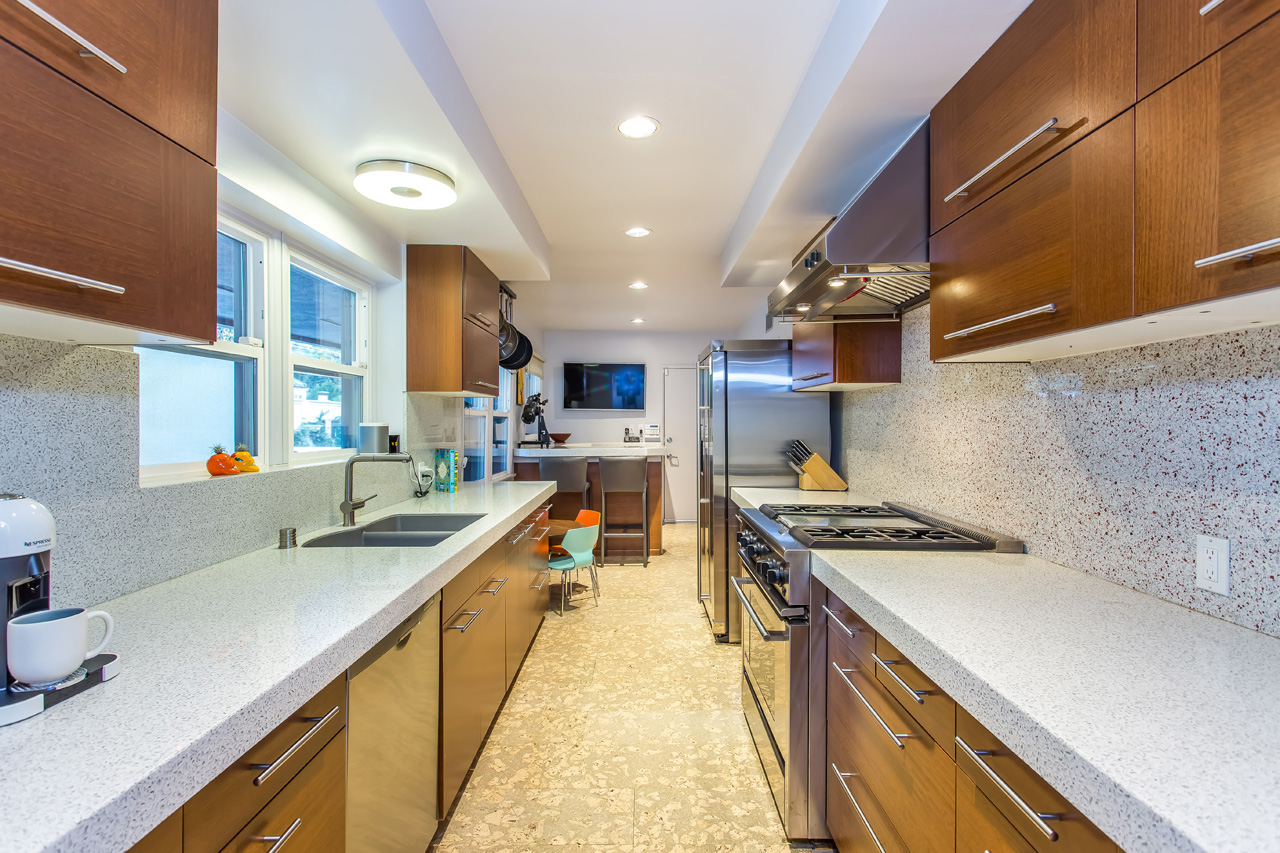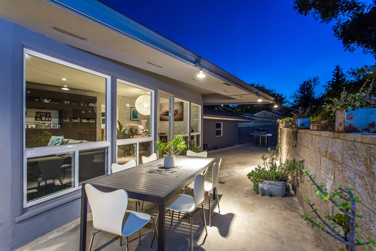 Sleek and sophisticated Mid-Century home located in one of the most prestigious areas of the Beverly Hills PO. Hidden behind the mature shrubbery of Oak and Olive trees, enter into a light-filled living room with wall-to-wall glass windows, complete with a cozy fireplace and dining area overlooking the backyard. Modern kitchen with GE Monogram chef-quality stainless steel applianced and imported Portuguese cork flooring, with detached bar area perfect for entertaining. Three bedrooms including a master suite with walk-in closet and spa-like bathroom. Serene, park-like backyard with private patios surrounded by greenery in both the front and back of the home, complete with a 2 car garage.