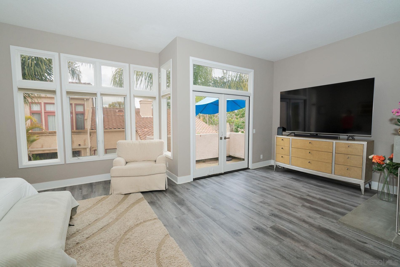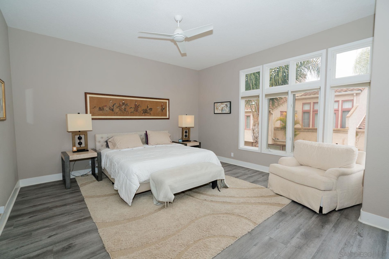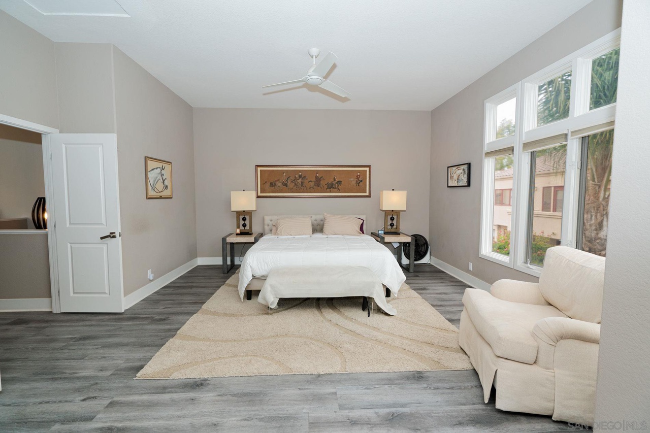 Gated Community of "Alcala" in Rancho Santa Fe! This lovely home is very light and bright throughout, and has high ceilings, large closets, a bedroom downstairs, a breakfast area off the gourmet kitchen with a courtyard view, a very private patio/yard with plenty of room to relax and enjoy the sun, a huge master suite with a balcony, a huge second bedroom upstairs, two car garage and lot's more! Wood floors, newer carpeting, beautiful grounds, and close to Morgan Run Golf Course.
