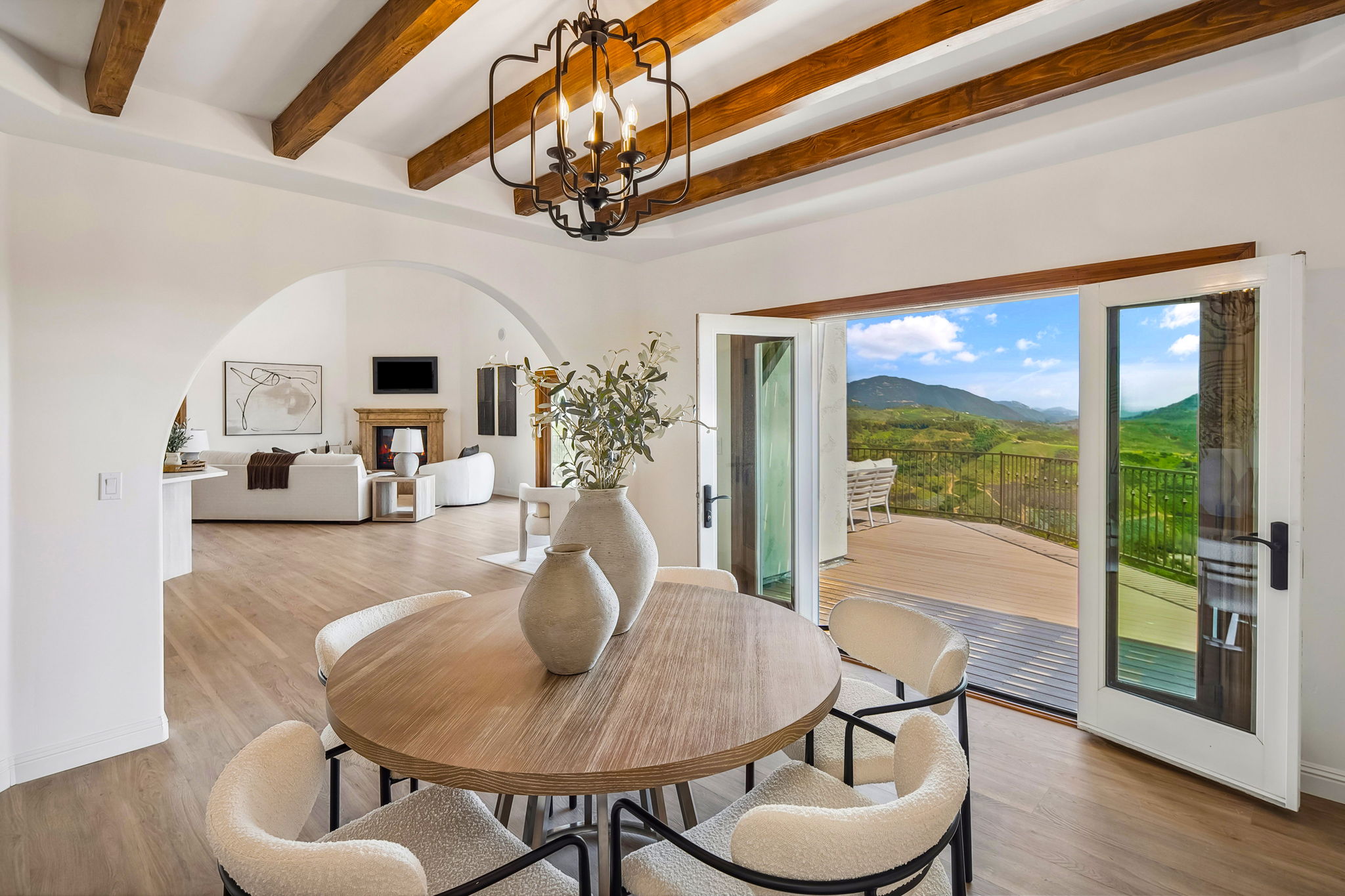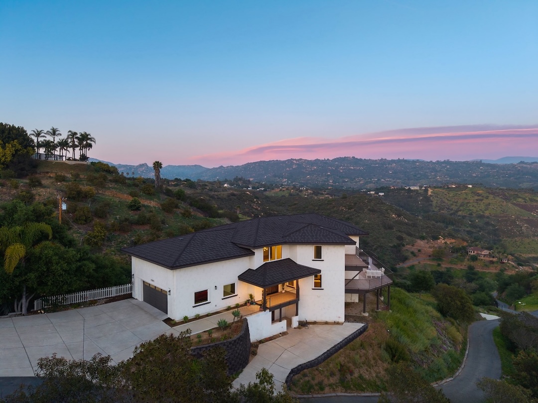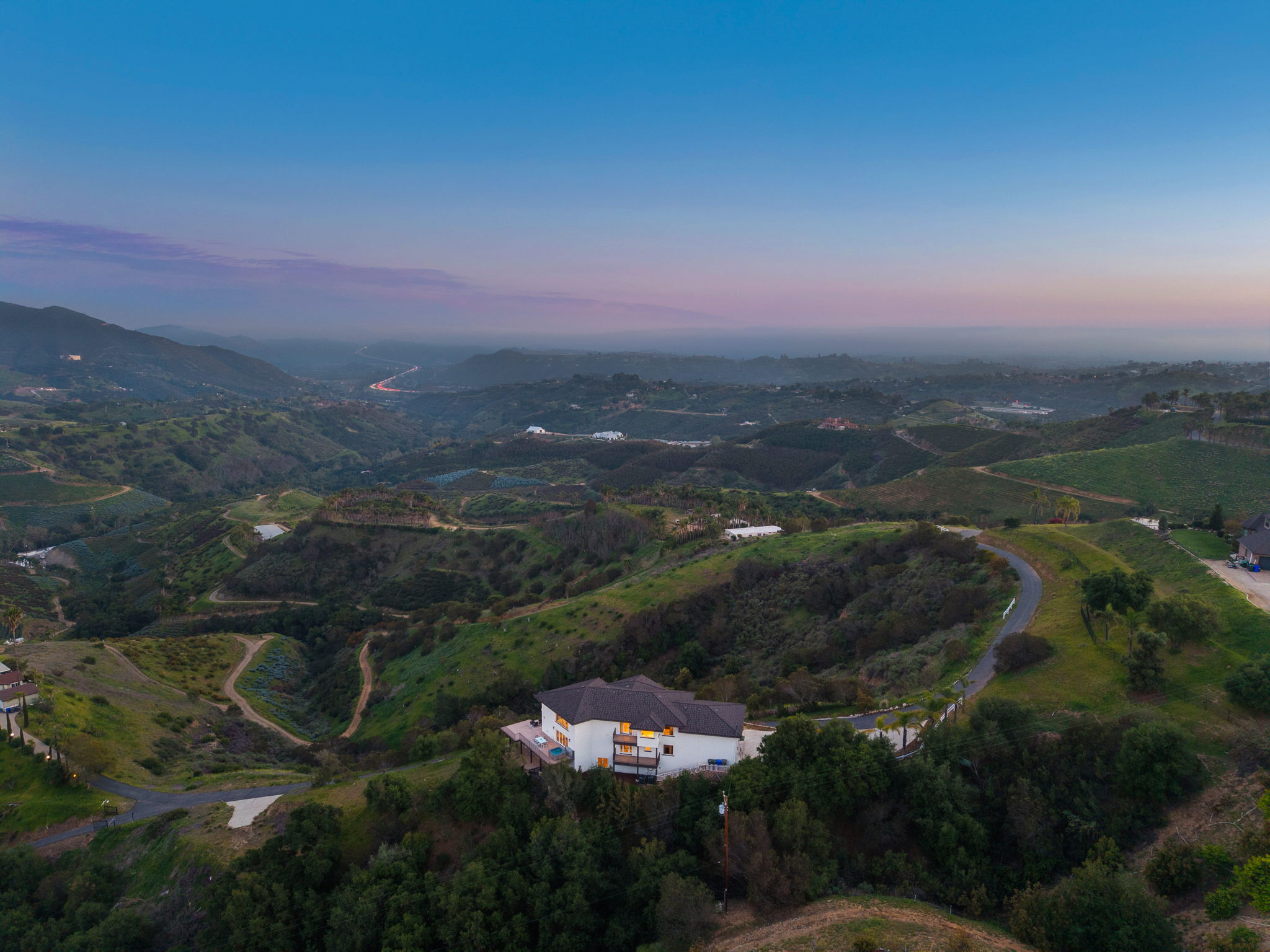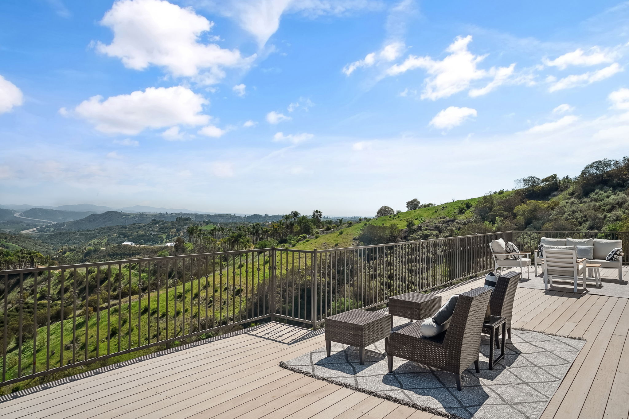 A Modern Hilltop Estate Surrounded by Over 500 Acres of Scenic Flower Farms Tucked away on a quiet private road in Fallbrook, this modern hilltop estate offers rare privacy, open space, and panoramic views that stretch for miles. Surrounded by over 500 acres of vibrant flower farms, the six-acre property blends luxury with rural charm in a way that’s nearly impossible to find. Recently and extensively renovated, the home features soaring ceilings, custom wood details, brand-new flooring, lighting, cabinetry, and high-end appliances. Natural light fills the open layout, with a stunning kitchen that flows into the living and dining areas. Walls of windows and sliding doors open to a massive wraparound Trex deck—perfect for sunset dinners and weekend entertaining. The main-level guest suite includes its own en-suite bath and porch, while upstairs offers two more bedrooms—including a spa-like primary retreat with a private view deck, soaking tub, and walk-in shower. A flexible loft space is ideal for a theater, studio, or playroom. Downstairs, a fully equipped ADU with a separate entrance includes two bedrooms, a full kitchen, and a living space—perfect for guests, extended family, or rental income. Additional highlights include smart home features, brand-new multi-zone HVAC, a durable metal shake roof, RV parking potential, and fire-safe landscaping with recent clearance approval from the county. Just minutes from the 15 freeway and a short drive to Fallbrook and Temecula’s top wineries, shopping, and dining—this one-of-a-kind property is more than a home… it’s a lifestyle.