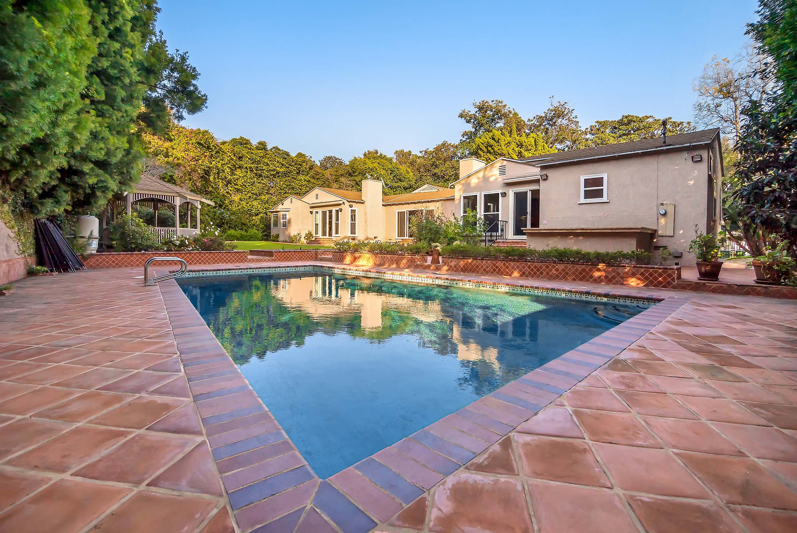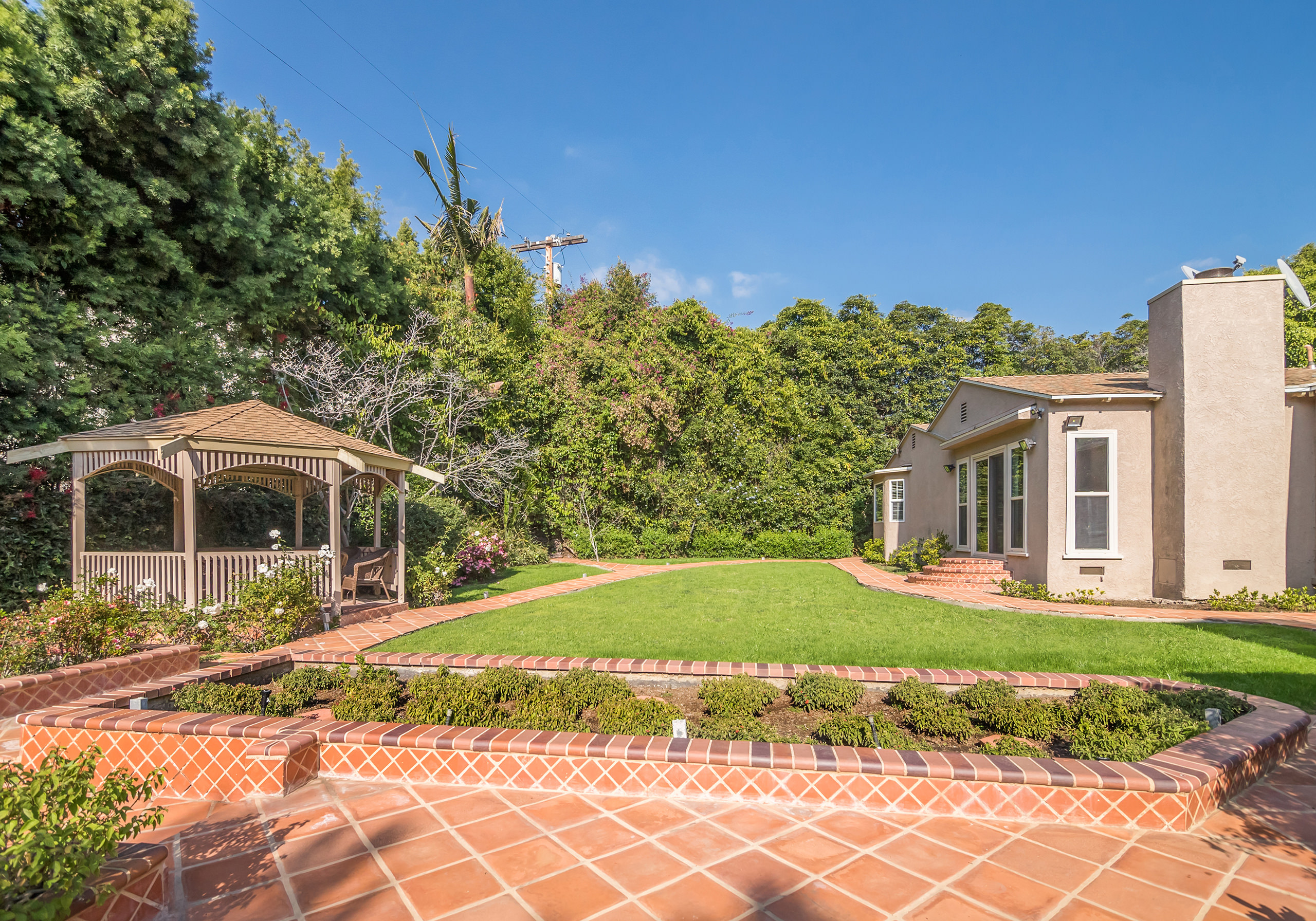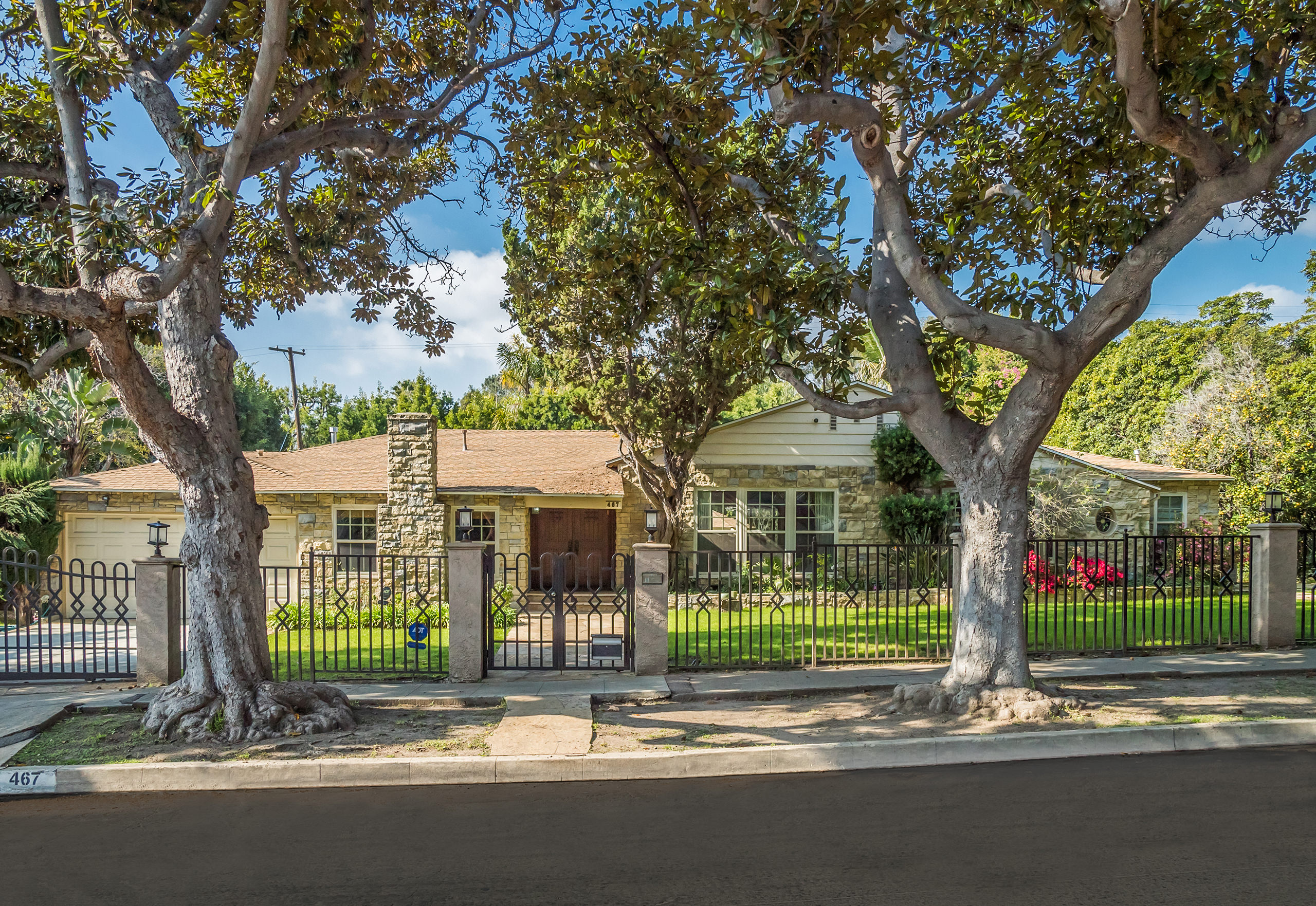 Only one showing to occur before reviewing offers, Tuesday, May 3rd, from 11-2pm. Nestled on an idyllic tree-lined street in the heart of Brentwood, this gated and private traditional sits on a large 13,637 sq. ft. lot. The single-story home features a large open living/dining space that leads to the spacious backyard with a sparkling pool, gazebo, and grassy yard perfect for entertaining. Additional sport court in the front yard. The gourmet chef’s kitchen has gorgeous granite countertops and top-of-the-line stainless steel appliances with a separate breakfast eating area. An oversized primary suite is replete with a separate sitting/TV area, fireplace, and spa-like ensuite bathroom with walk-in closet. Three additional bedroom suites. A beautifully appointed den with vaulted wood-beamed ceilings and brick fireplace can also be used as an office. Central A/C, skylights, hardwood floors, and a built-in sound system complete this amazing family home. Attached 2-car garage. A must-see property for those who value a single-story home situated on a large lot in a prestigious Westside location.