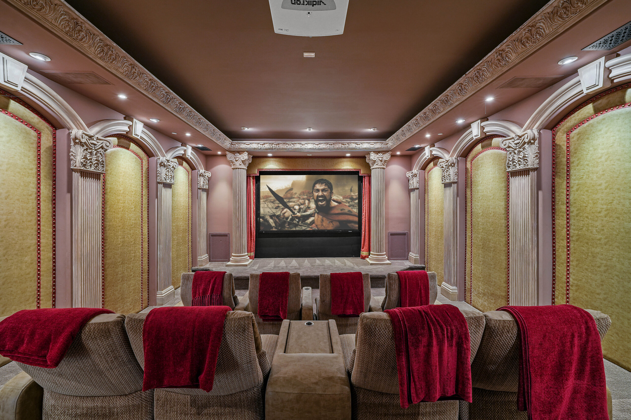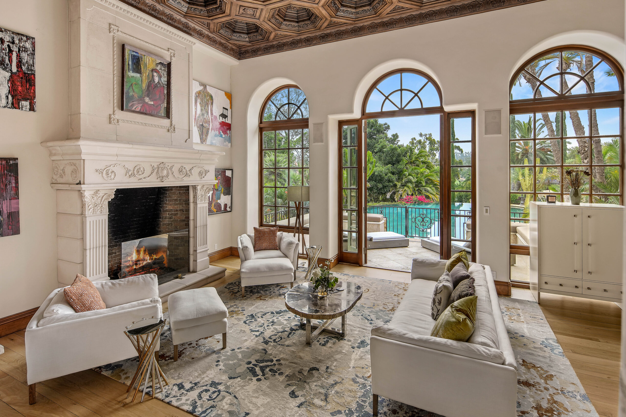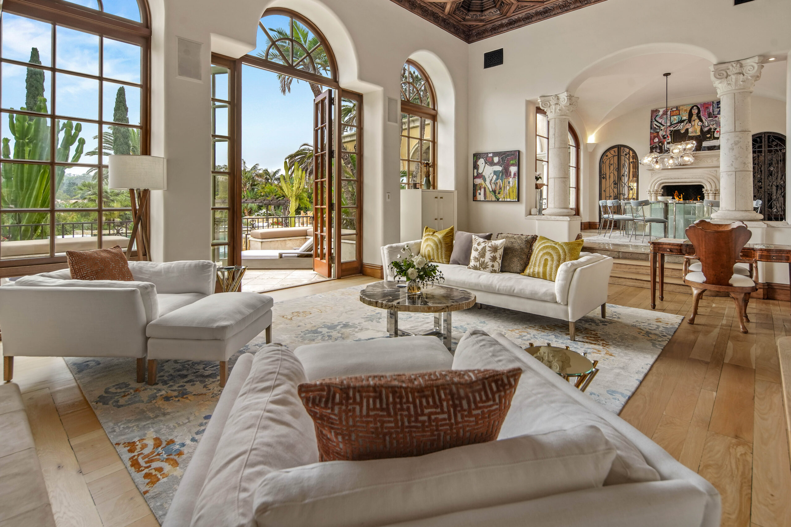 Indulge in the unparalleled luxury of this lush 2.1-acre oasis in the prime location of the prestigious Rancho Santa Fe Covenant. This glamorous estate marries impeccable architecture, masterful craftsmanship, and timeless sophistication to create an enchanting sanctuary beyond compare. Upon entering the lavishly landscaped courtyard, an expanse of colorful rose gardens, cascading greenery and the sweet scent of citrus blossoms welcome you. The grandeur of the residence, with its spacious design, seamlessly intertwines a timeless, traditional floor plan with modern influences. Rooms effortlessly flow, converging indoor and outdoor living, inviting you to the sheltered loggias and the captivating zero-edge pool adorned with stone detailing, waterfalls, and a swim-up bar. Elegance abounds in the formal spaces of living and dining rooms, each featuring majestic stone fireplaces. This meticulously detailed haven offers 5 generous bedrooms, 7 full and 4 half baths. The detached library just a few steps from the main house boasts 360-degree wood shelves, wood floors and is easily convertible to a 2-bed in-law suite. Thoughtful details include reclaimed wood beams, vintage flooring, antique heated tiles, travertine and granite slabs, and artisan stone work. Custom furniture-grade cabinetry, hand-wrought iron fixtures, and stone fireplaces further enhance the opulent tapestry. The chef's kitchen features Thermador Pro appliances, dual warmers and ovens, Sub Zero fridge, fridge drawers, and a cozy breakfast room. A family room with a full bar connects seamlessly to an alfresco lounge via vanishing wood and glass doors, complemented by a fireplace and Lutron lighting. The master suite offers separate luxurious baths, custom dressing rooms with built-in mini fridges, and a private covered veranda. Additional features include a second family room with wet bar, an office, second laundry room, wine storage, gym, and a state-of-the-art movie theater. Outdoors, enjoy verandas, a wood-fired pizza oven, full kitchen, fire pit, and Sonos speakers throughout for a resort-style experience.