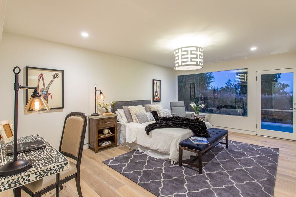 Perched on a cul-de-sac just above the Chateau Marmont, sits this completely renovated and gated estate with jetliner city views. A private entrance leads you to an expansive living room with soaring vaulted ceilings, sleek gourmet chef's kitchen with 15' center island, stainless professional-grade appliances, and ample natural light through the several skylights and wall-to-wall windows. The first level also features a modern office space with separate entrance. Three spacious downstairs bedrooms all have downtown views and direct access to a sprawling backyard with sparkling pool and BBQ area, including a master suite with an elegant spa-like bathroom subtly accented with Carrara marble. Ample parking with a 2-car garage, additional carport, and plenty of street parking. This thorough and tasteful renovation creates an ambiance of sophistication and warmth for the most discriminating buyer. See virtual tour.