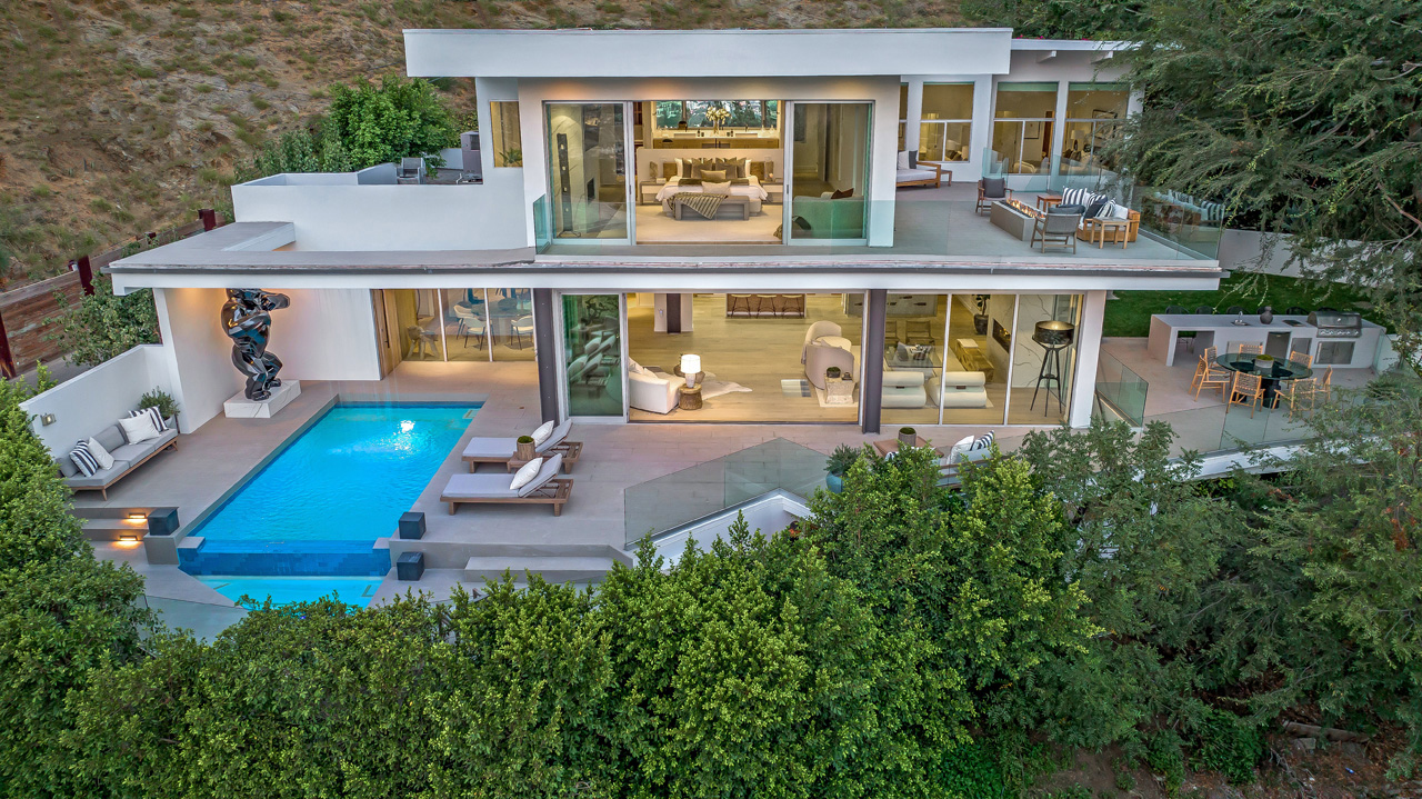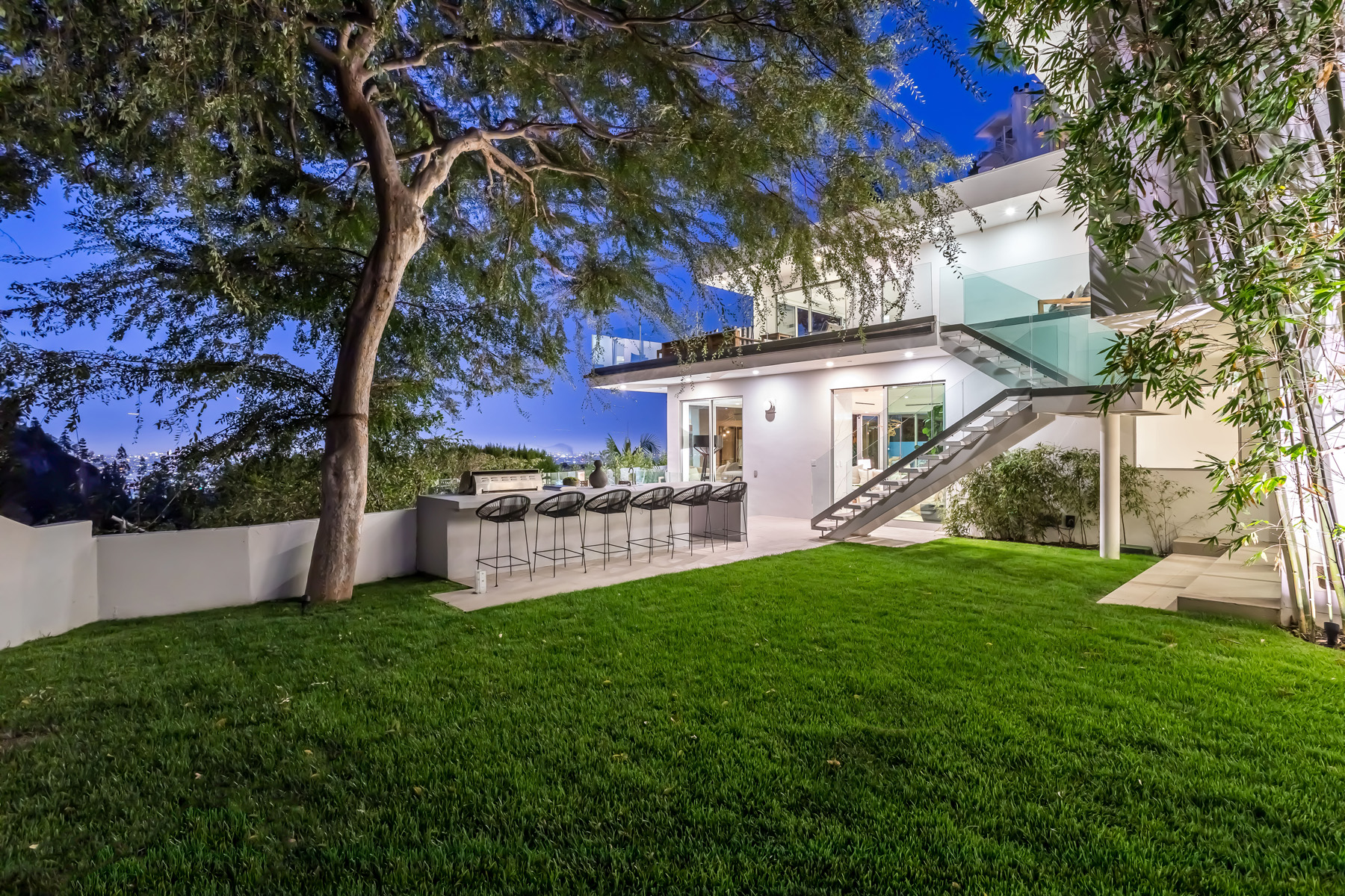 Perched at the end of a quiet cul-de-sac just above the Sunset Strip, this recently renovated contemporary estate features panoramic city skyline and canyon views. Secure and private, the home is replete with new European white oak floors and an open floor plan with floor-to-ceiling sliding glass doors that lead to the sparkling pool with built-in waterfall and spa. A separate grassy yard and built-in BBQ makes this the perfect setting for indoor-outdoor living and entertaining. The chef's kitchen has luxurious Viking appliances and an oversized island with built-in breakfast bar, and a stunning dining room wrapped in oak. Upstairs lies the massive primary suite featuring jetliner views of the entire city, a huge deck, fireplace, and an open ensuite bath with spa-like tub and walk-in closet. 2 additional bedrooms with ensuite baths completes the upstairs. The 5th bedroom has its own separate entry and can be used as gym. Additional sauna, wine cellar, and an attached 2-car garage complete this contemporary masterpiece.