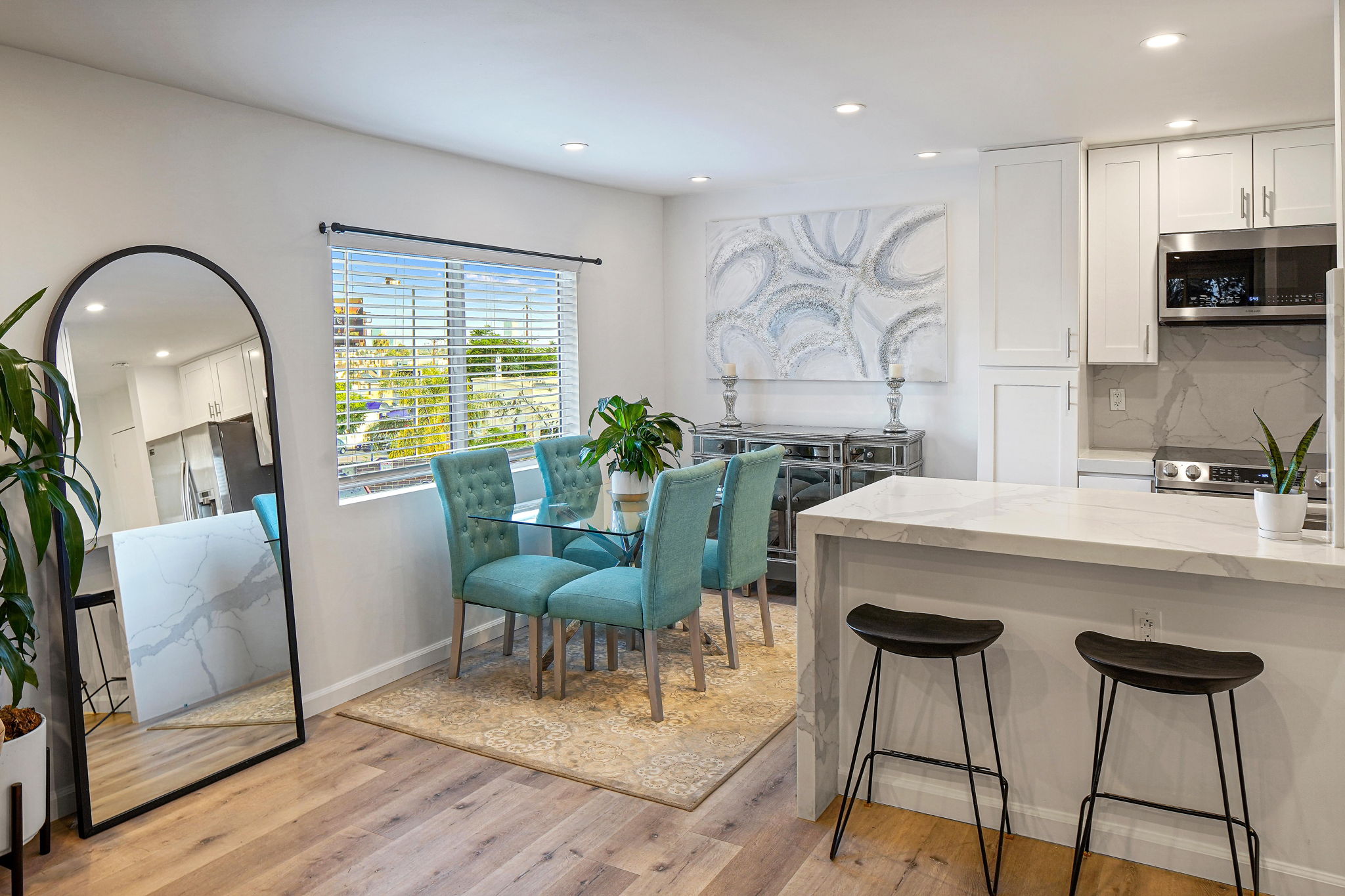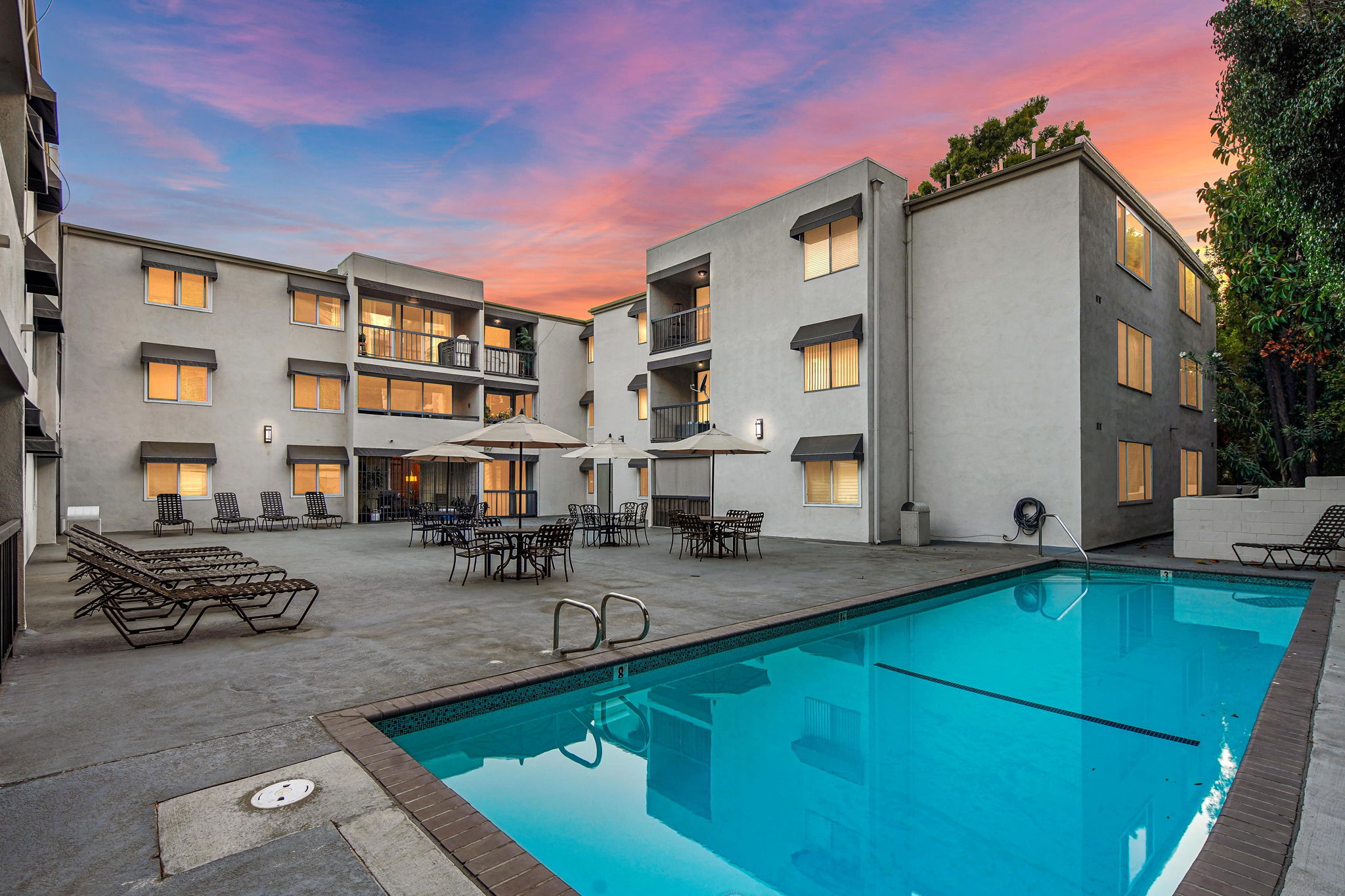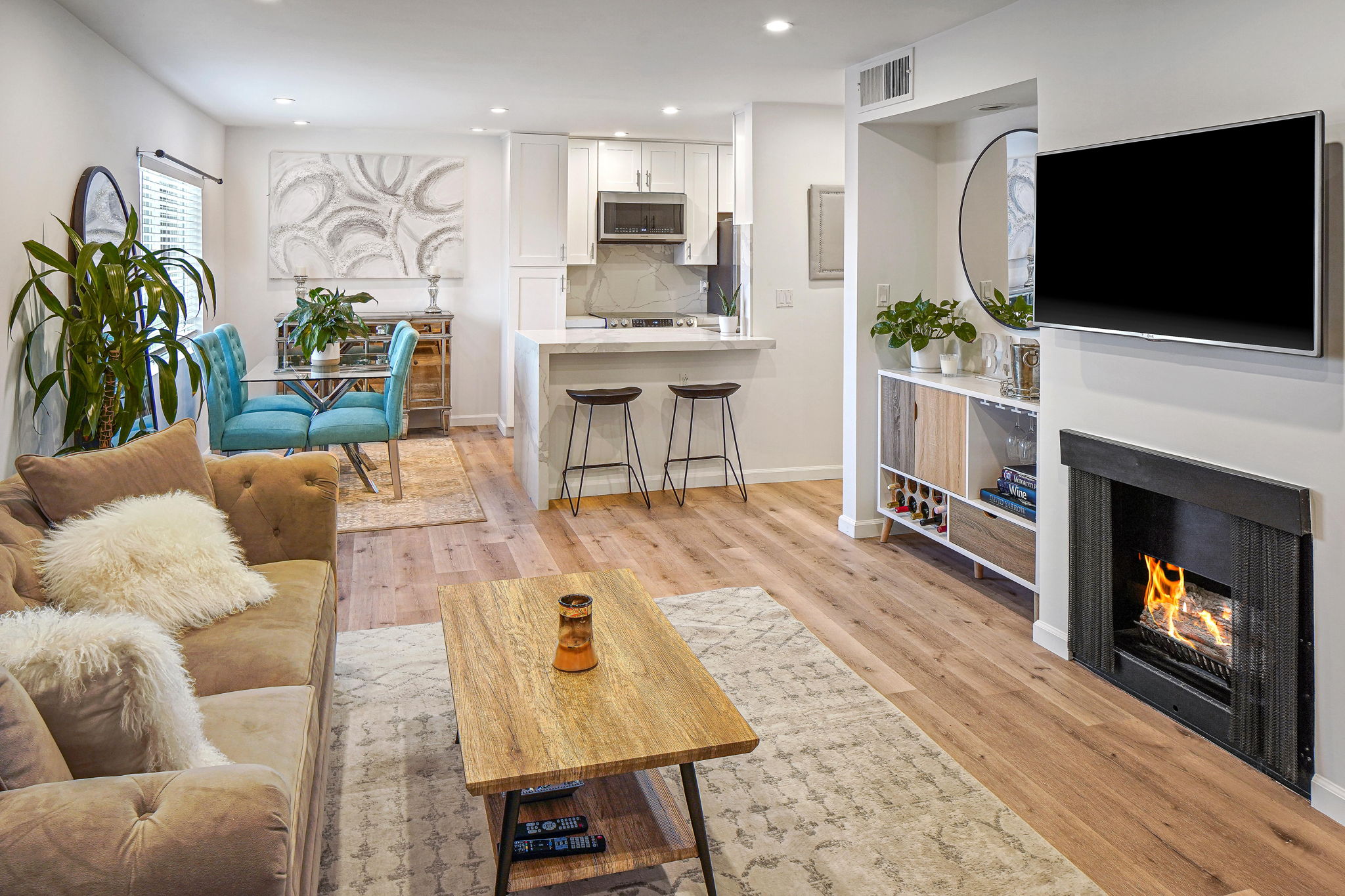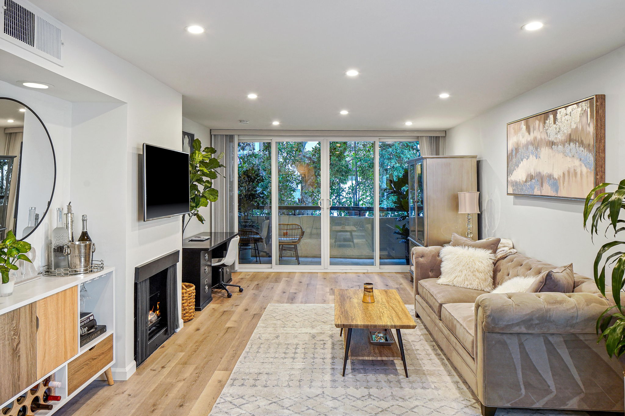 One-of-a-kind corner unit in West Hollywood's most desirable location. Situated on a beautiful tree-lined street, a short distance from dining, shopping, and nightlife on Santa Monica Boulevard. The unit features a modern kitchen with stunning quartz countertops, recessed lighting, and the latest appliances. The spacious living area enjoys a cozy fireplace flanked by two versatile nooks - perfect for a bar and a home office - and a private balcony shaded by mature greenery. The owner's suite boasts a walk-in closet and gorgeous en-suite bathroom with a beautiful vanity mirror. The gated underground parking spot is easily accessible from the unit. Building amenities include a pool and dry sauna. HOA fees include earthquake insurance, and rules permit hardwood floor installation and a washer-dryer in unit.