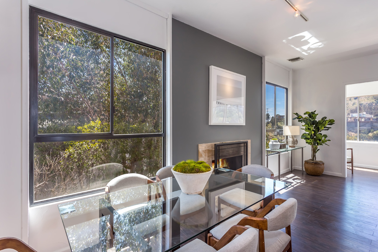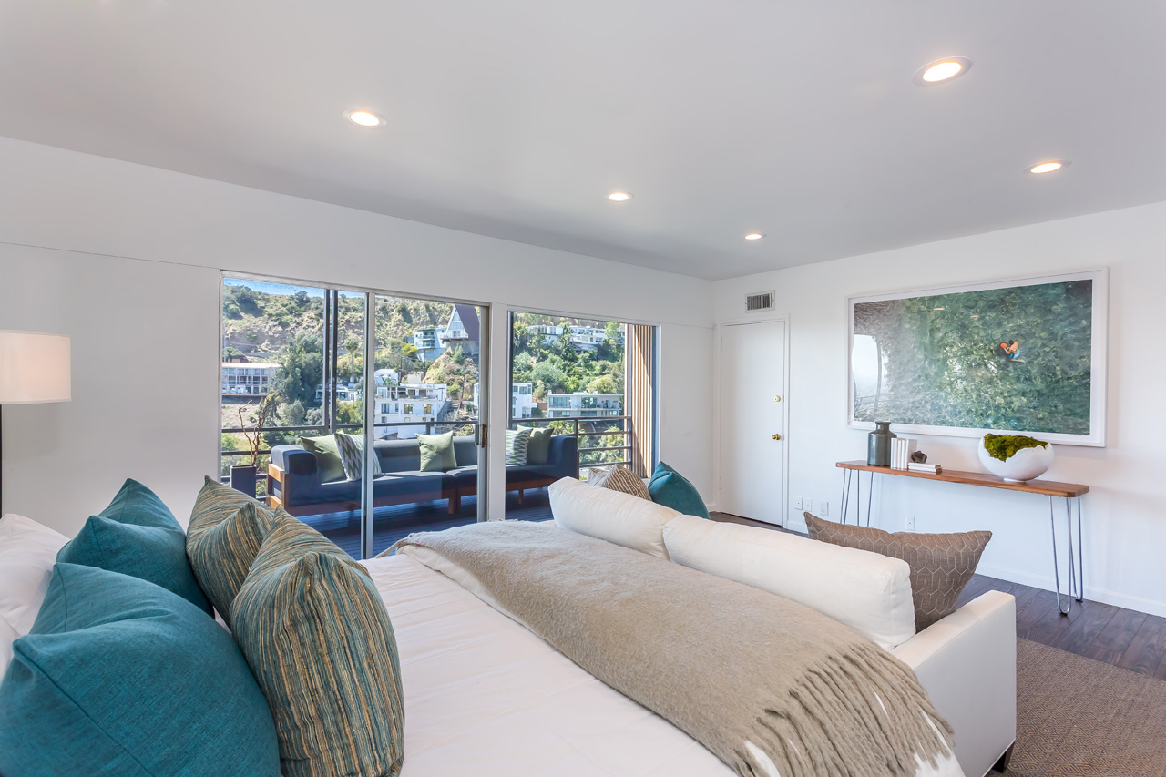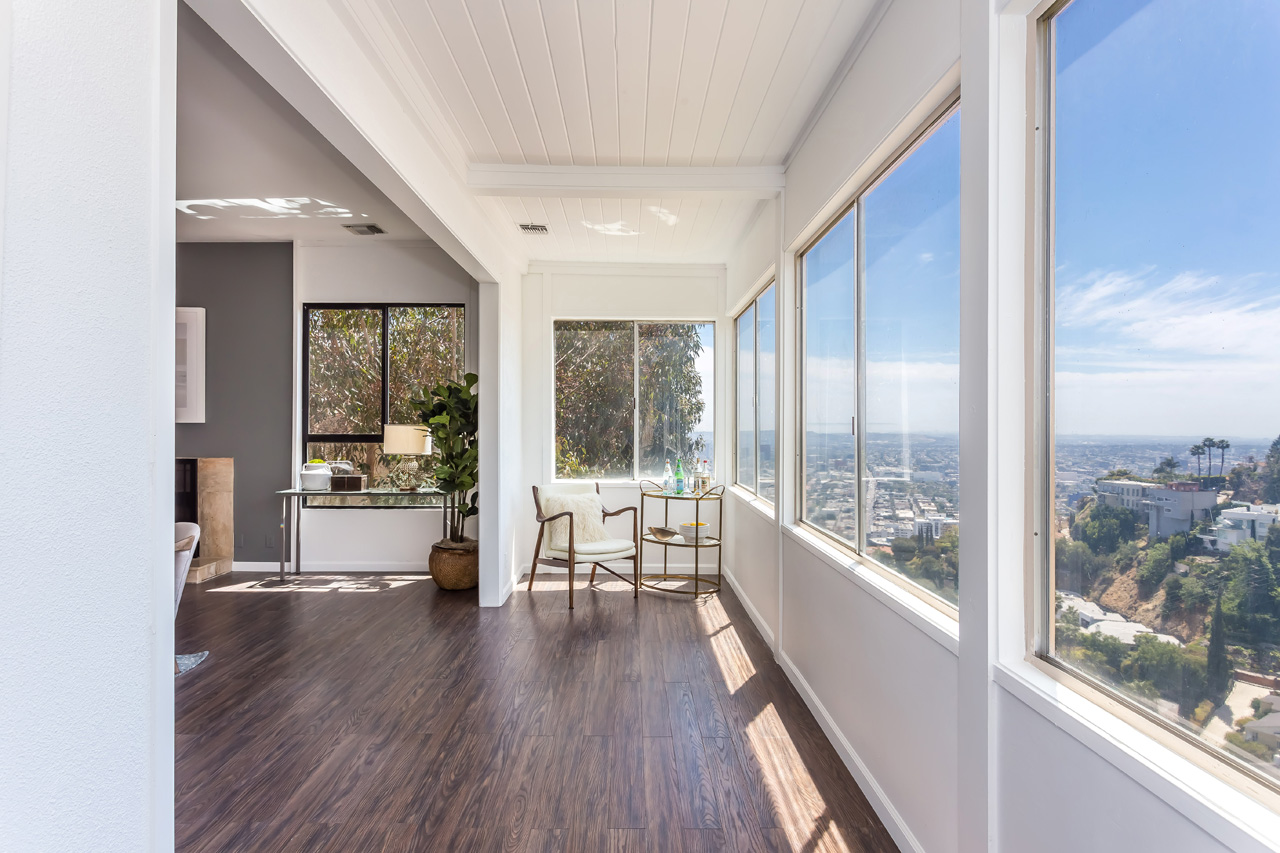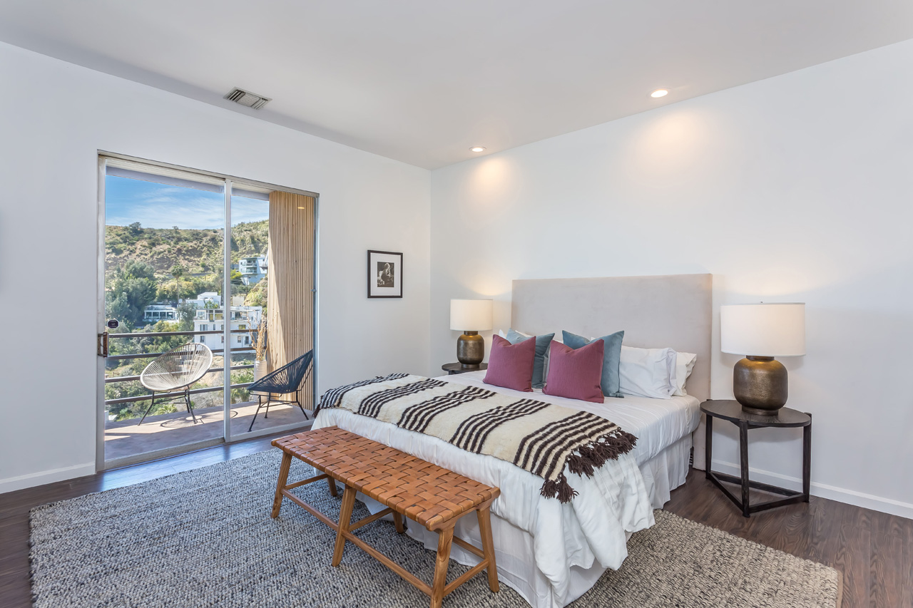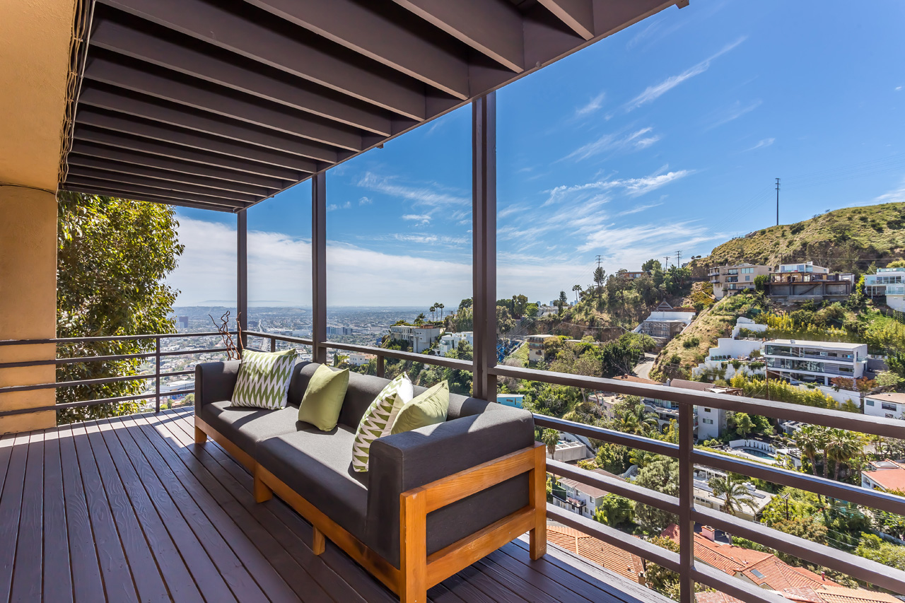 This Hollywood Hills contemporary is located just above the Sunset Strip, offering beautiful views of the city lights and ocean. Expansive glass windows allow plentiful natural light, and two large balconies provide wonderful indoor/outdoor entertainment. The large master suite has a spacious walk-in closet and impressive canyon and city lights views. Downstairs has additional separate private access and could work well for a rental occupant. 2-car garage.